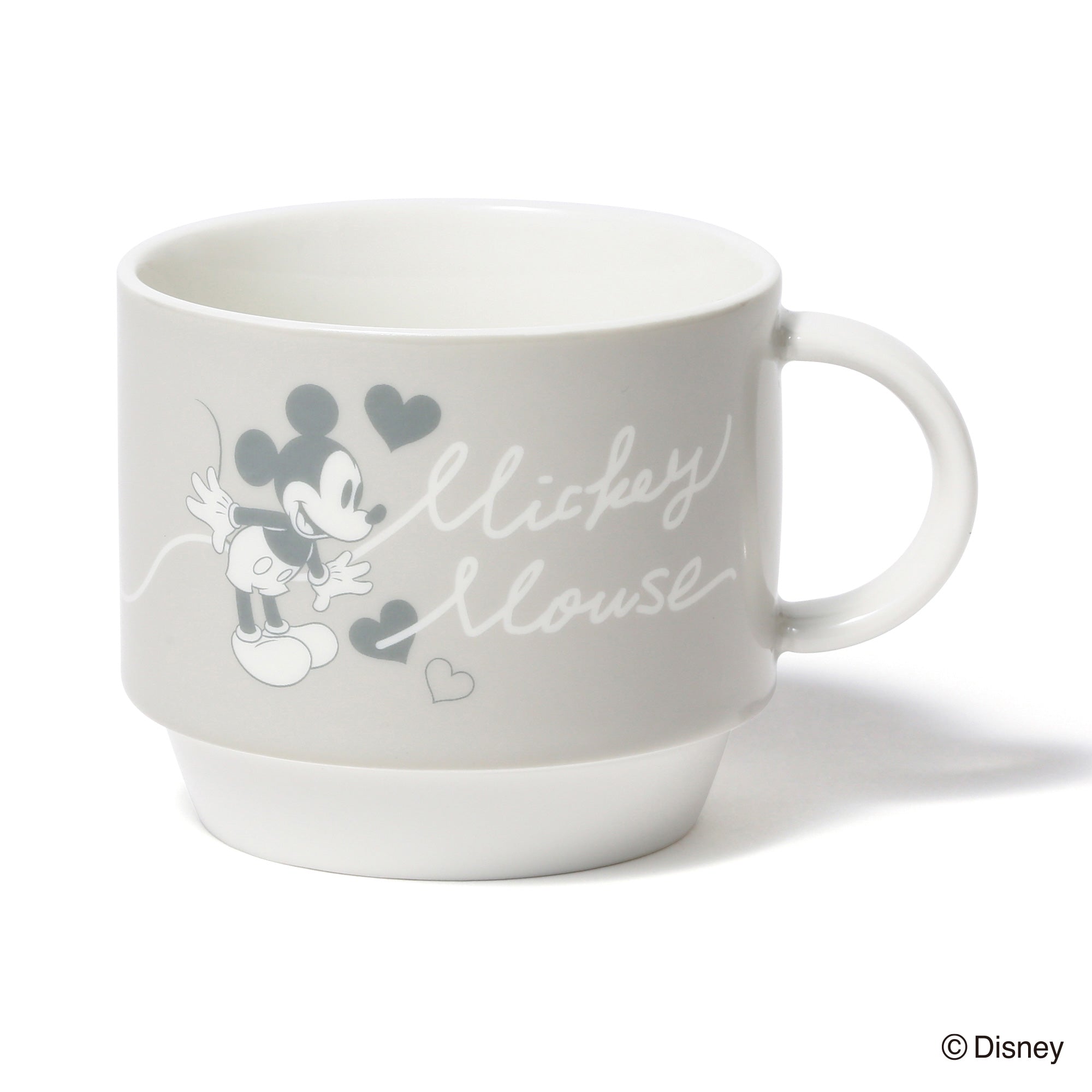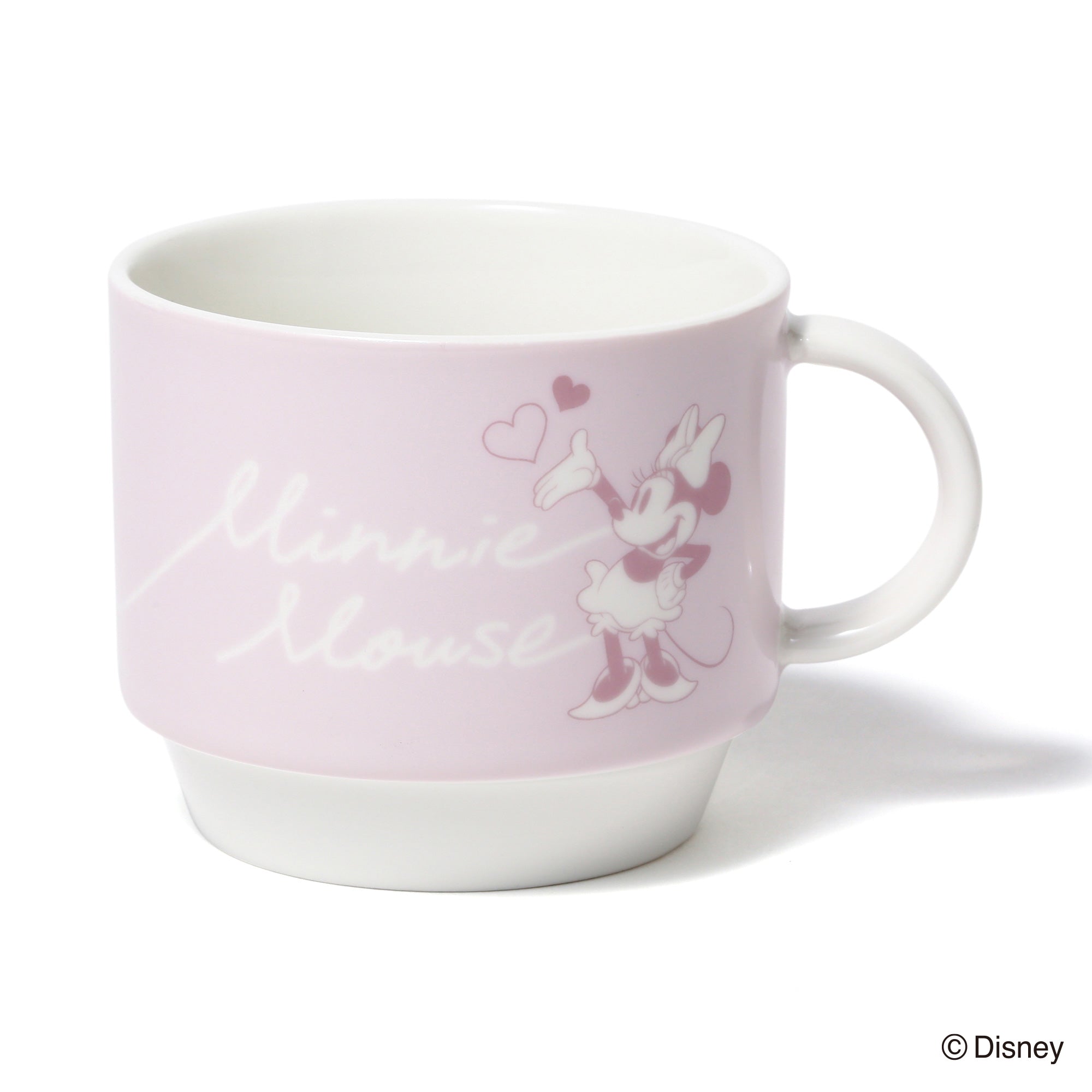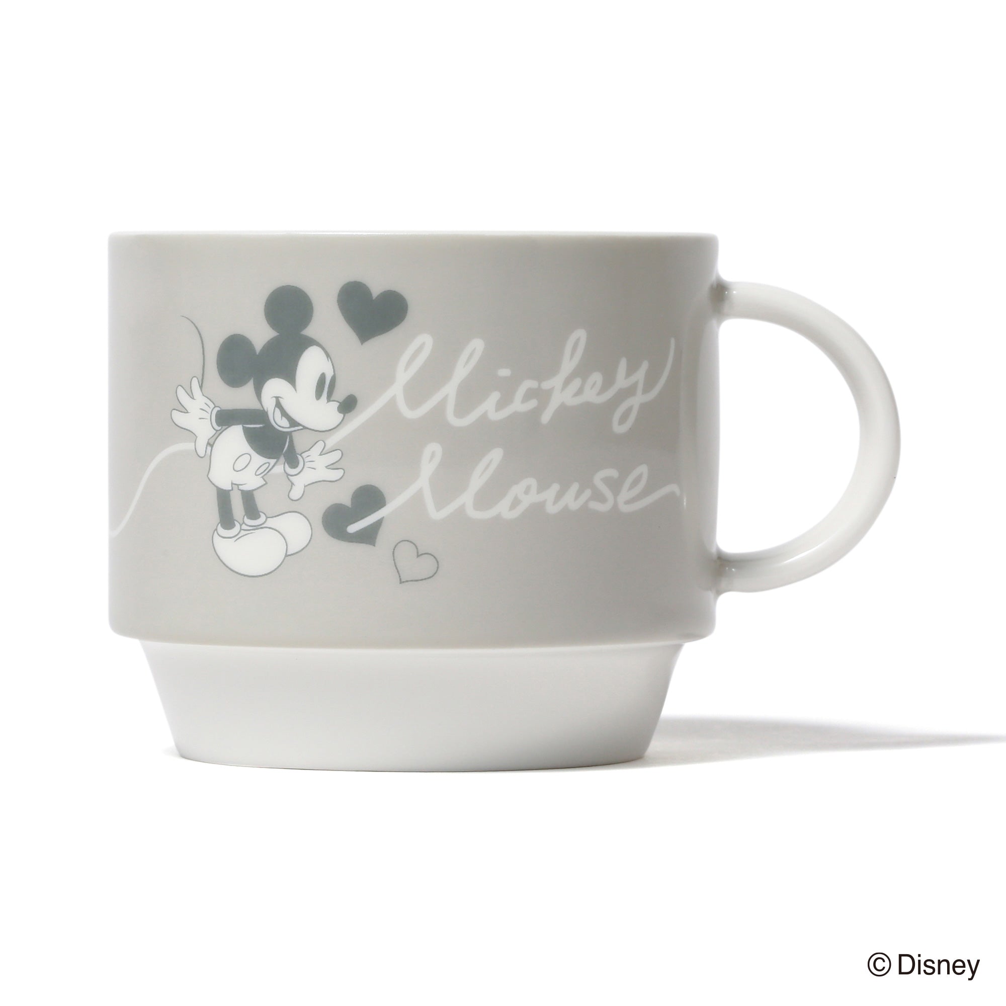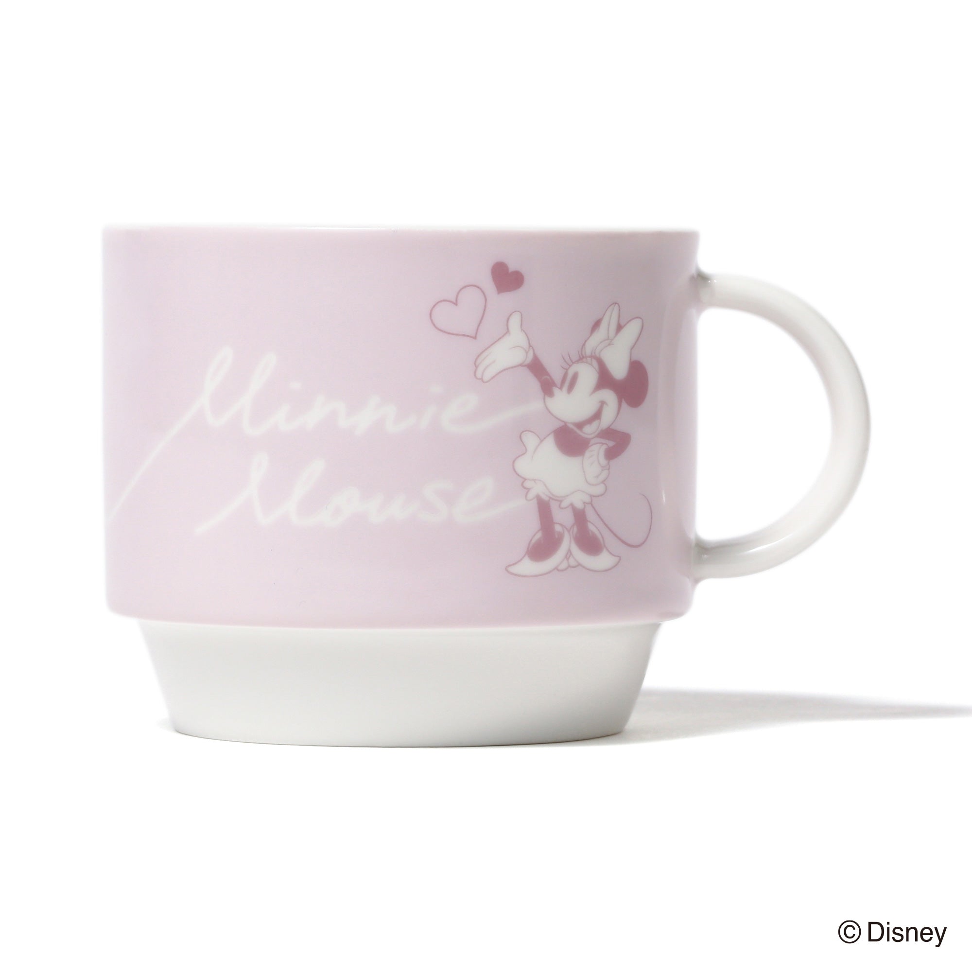 ミッキーマウスとミニーマウスをモチーフにしたかわいらしいデザインのスタッキングマグです。小ぶりで重ねて収納できるので場所を取らず、普段使いにぴったりです。マグカップをふたつ重ねるとハートが飛び交うデザインが現れるのがキュート。持ち手も丸く、かわいらしい印象に仕上げました。