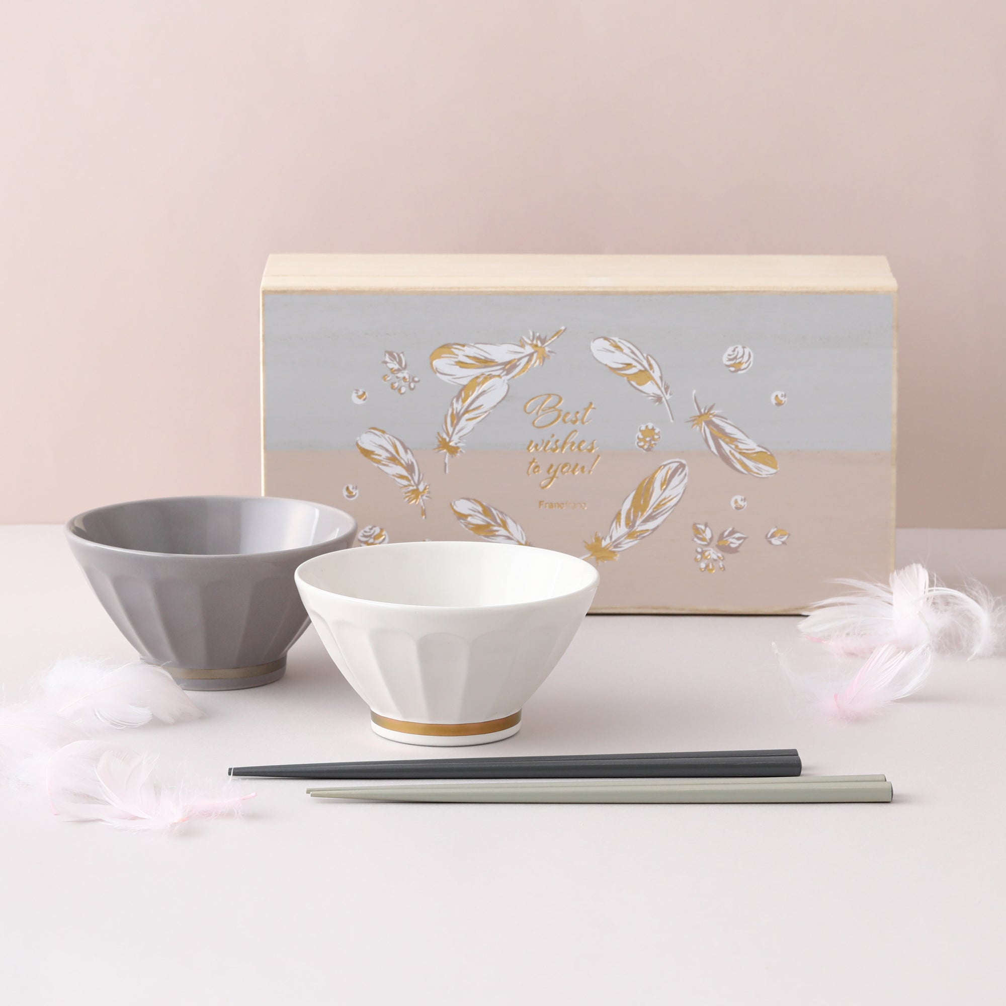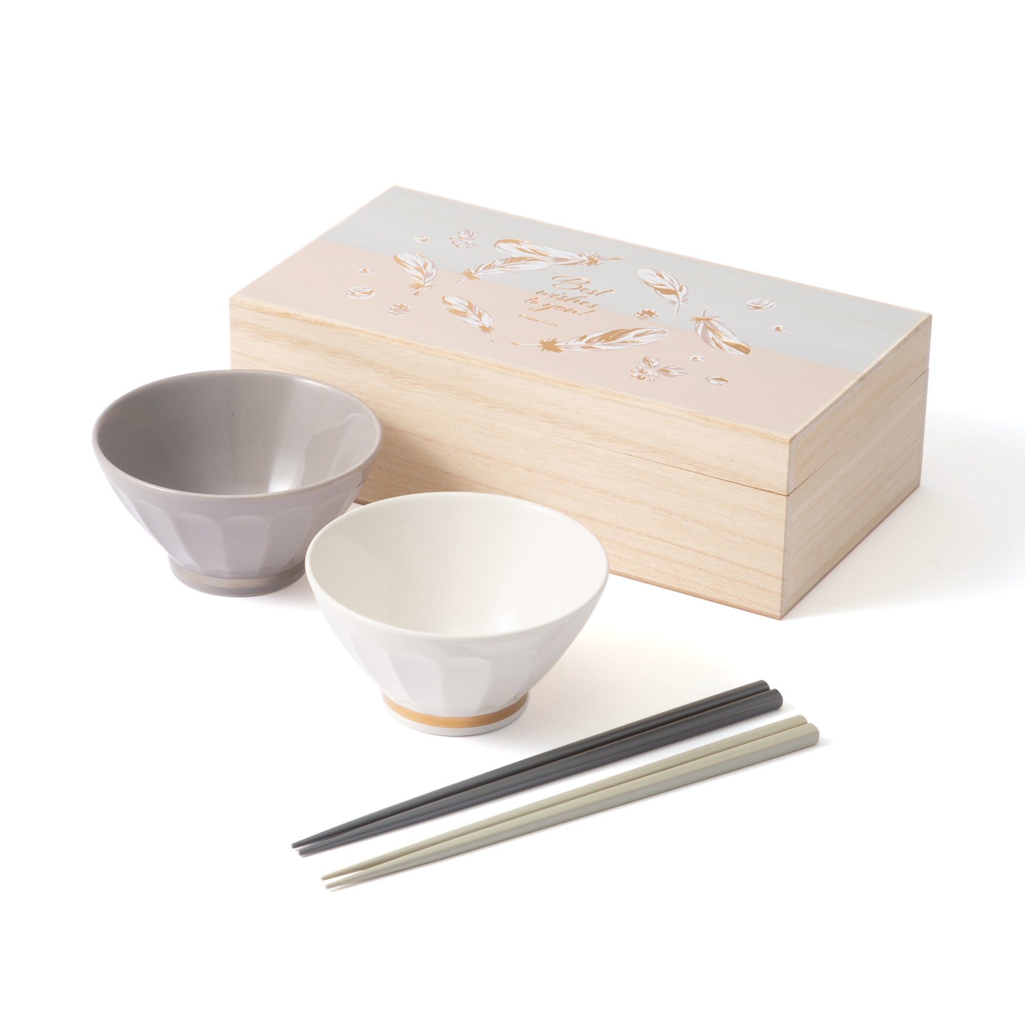 高台のゴールドとシルバーがポイントのお茶碗とお箸のセットです。毎日の食卓に素敵なお茶碗とお箸でおいしいひとときを味わえます。電子レンジの使用が可能で、温めも安心。食洗機が使用できるのでデイリー使いにぴったりです。桐箱に入っているため高級感があり、ご結婚のお祝いなどにおすすめです。