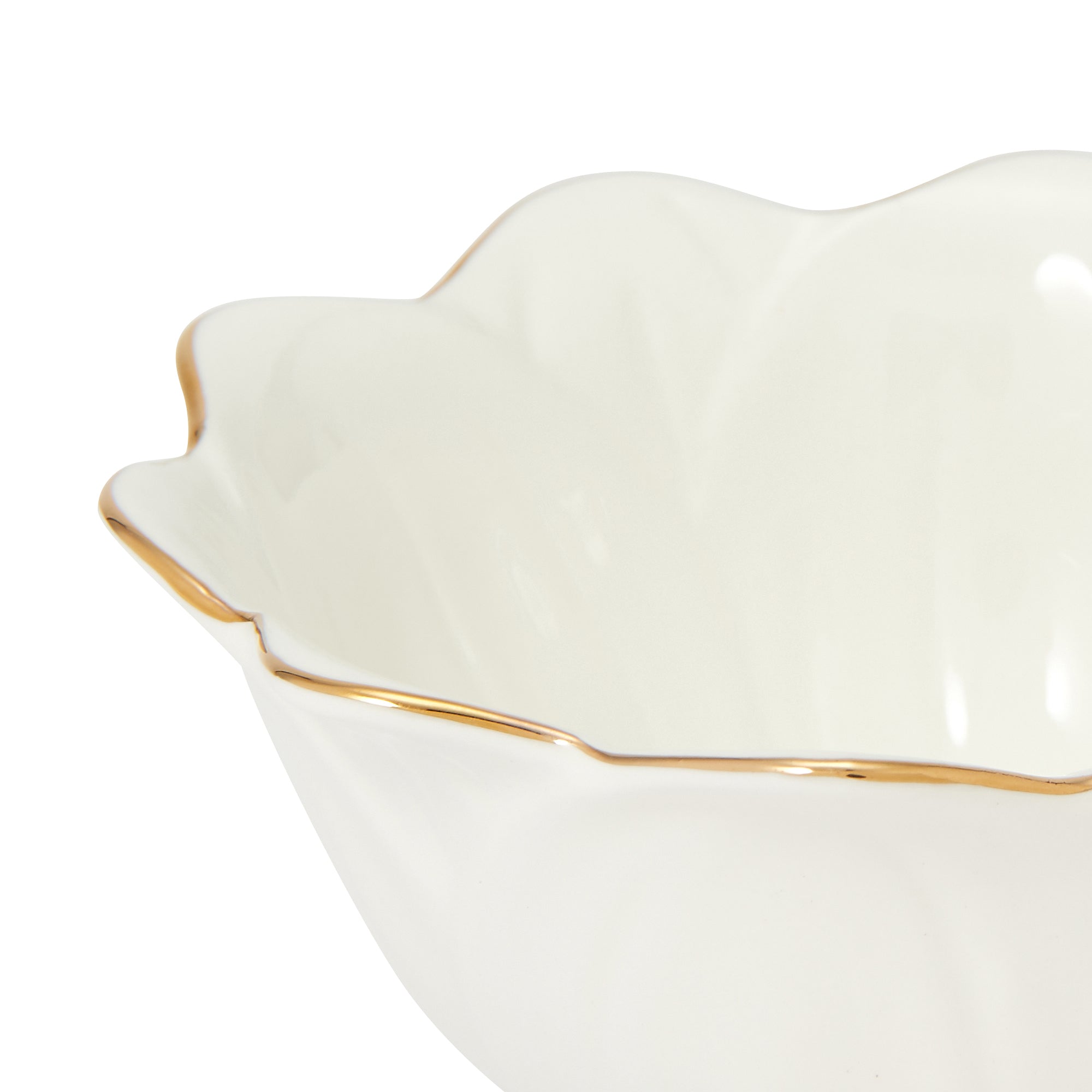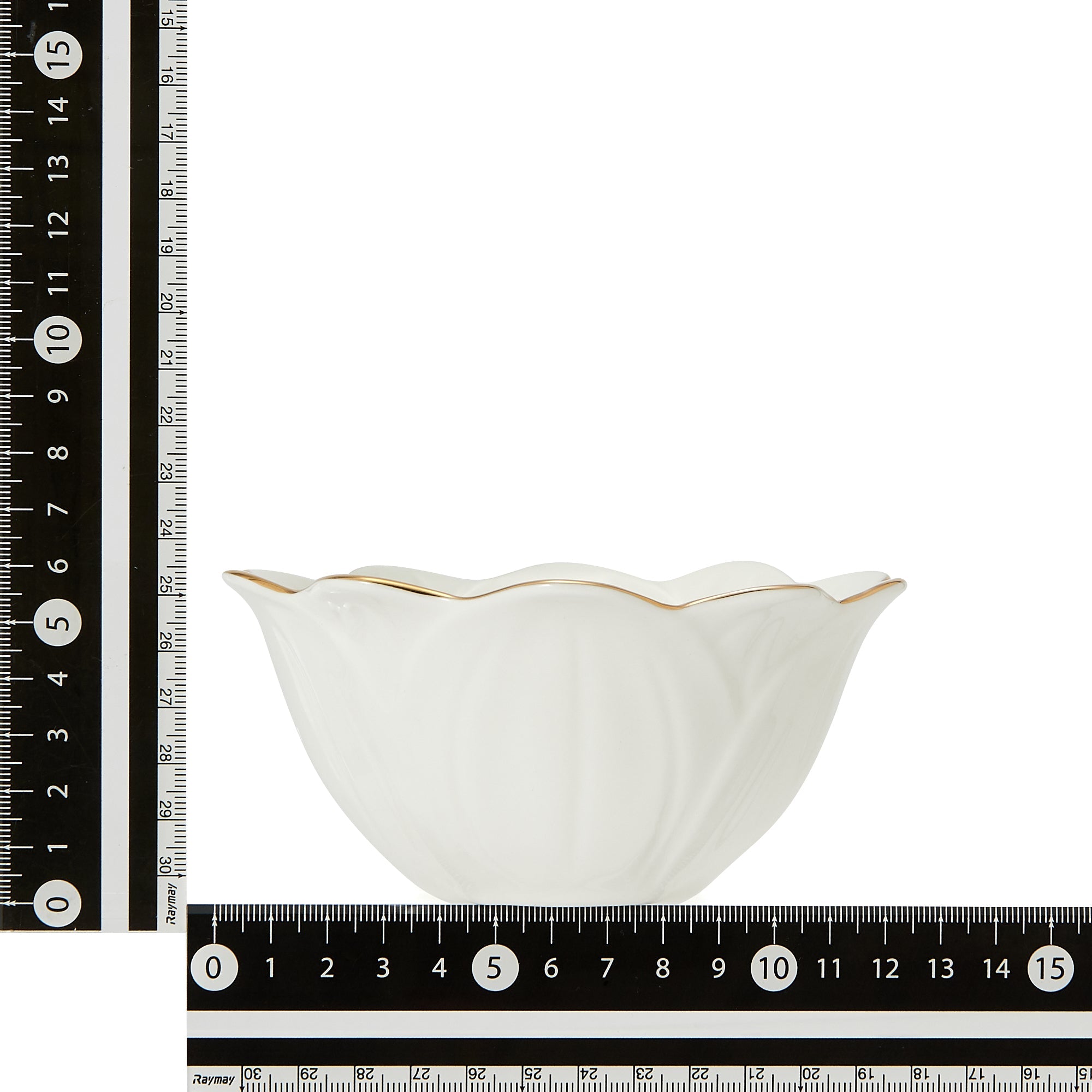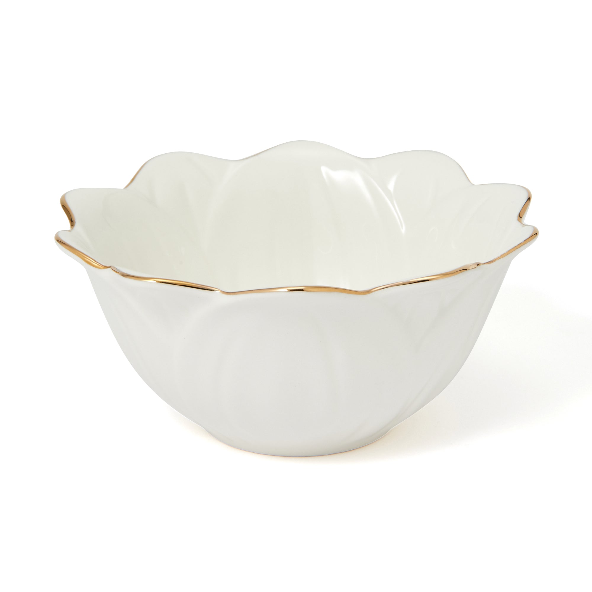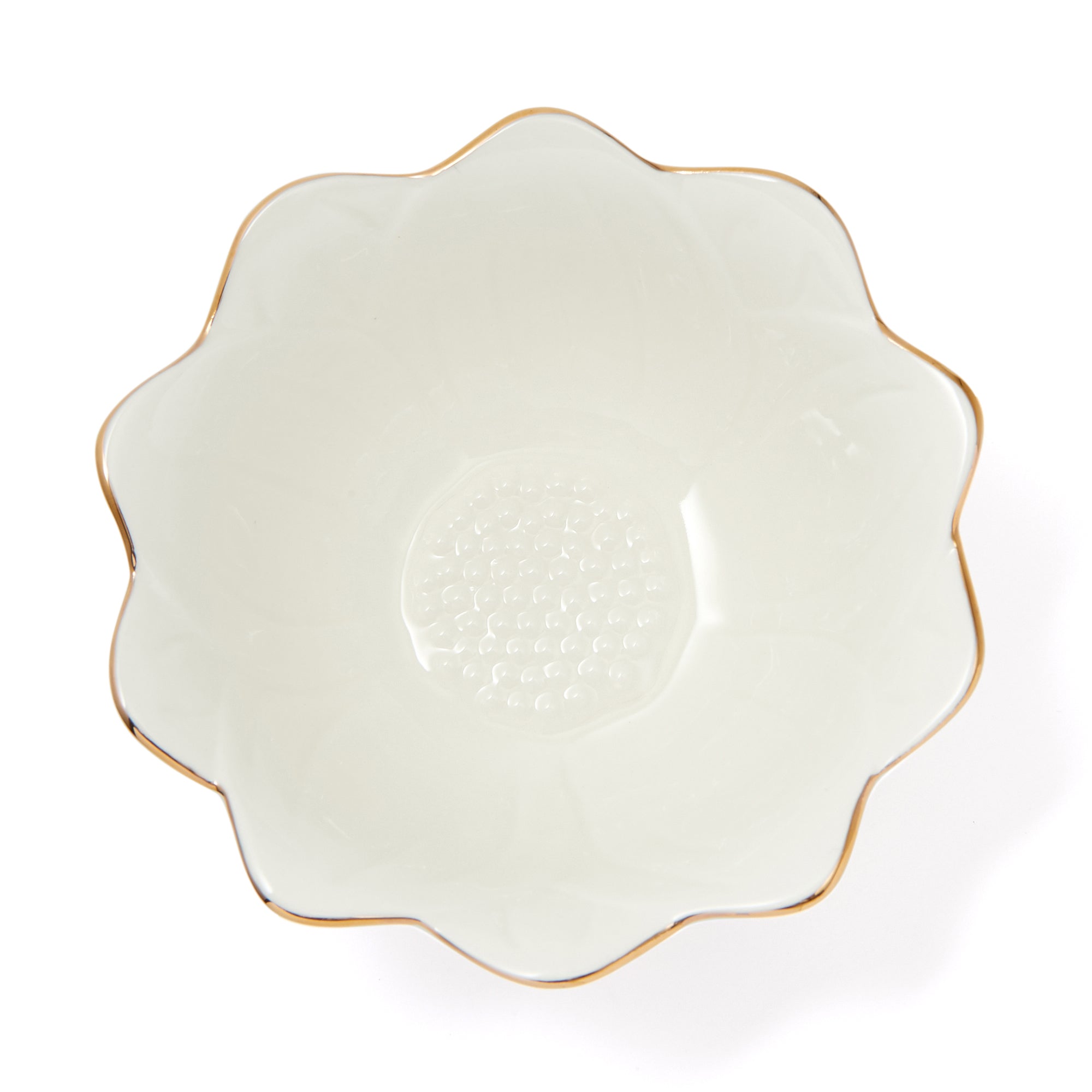 定番人気のフラワーモチーフデザインにボウルが登場。お花をかたどった可憐なデザインのボウルです。縁にゴールドをあしらうことで繊細な形状や模様が際立ち、エレガントな印象に仕上げました。プレートやカップ&ソーサーと合わせるとより華やかなテーブルコーディネートに。ライン使いがおすすめです。