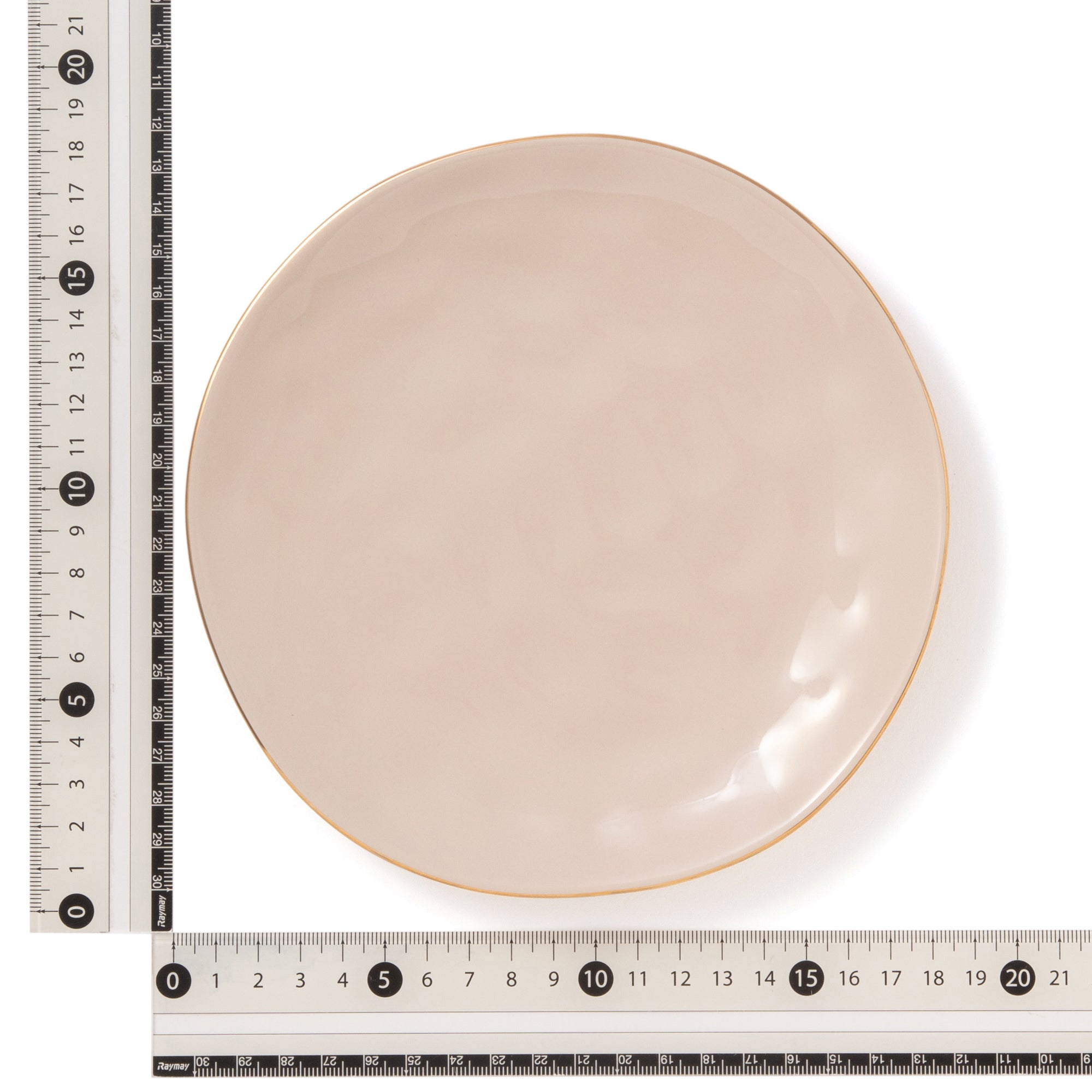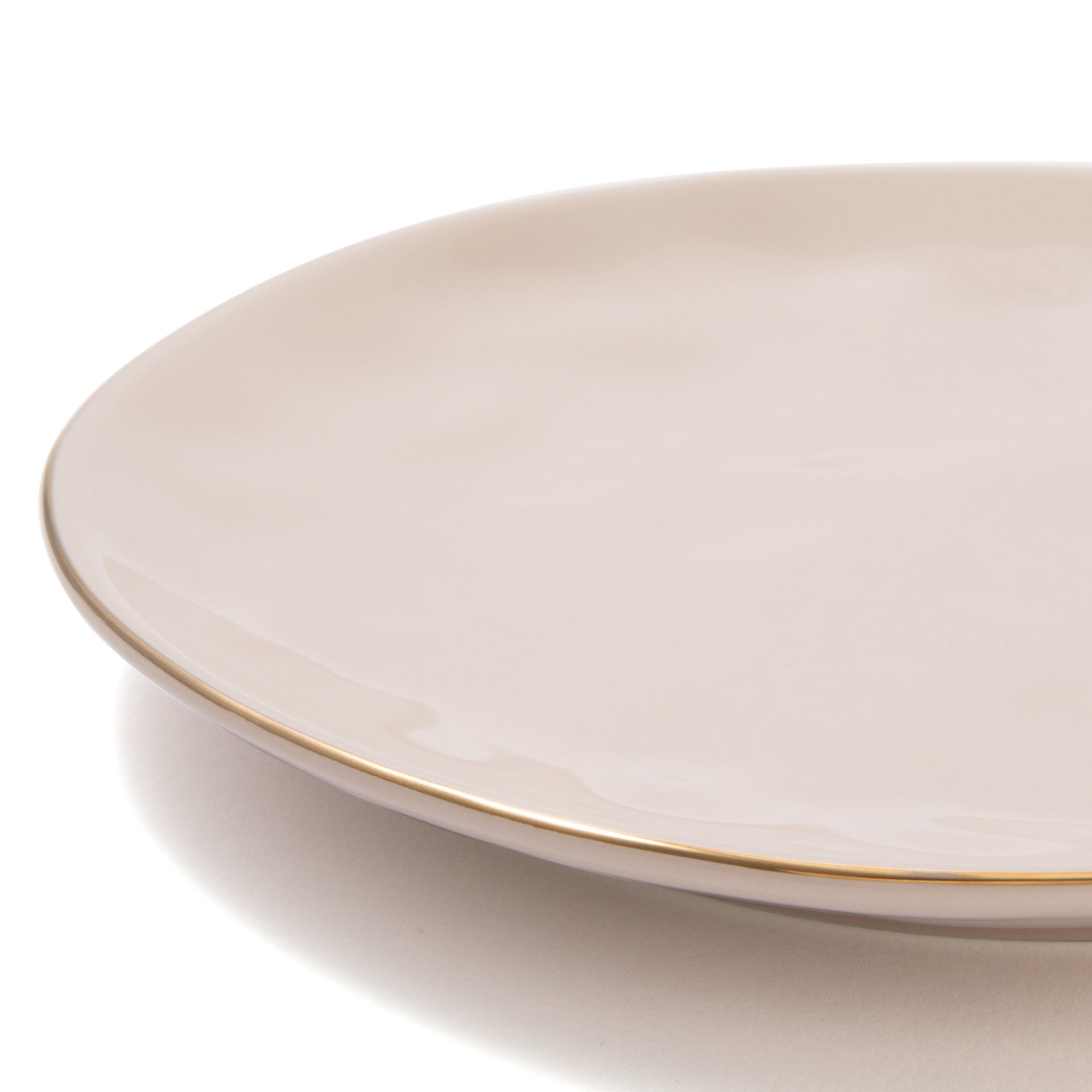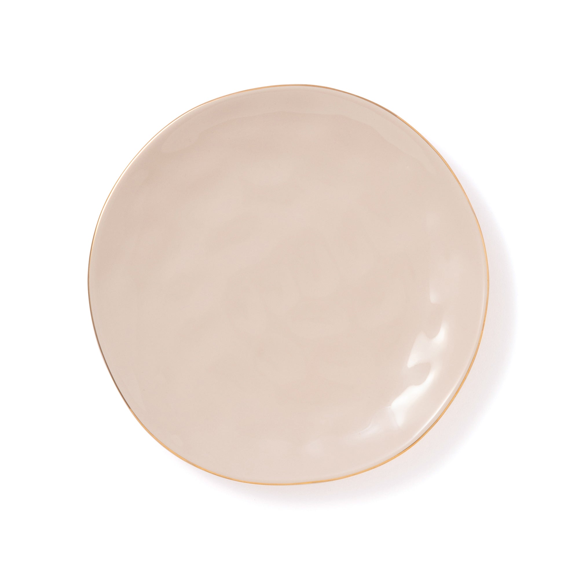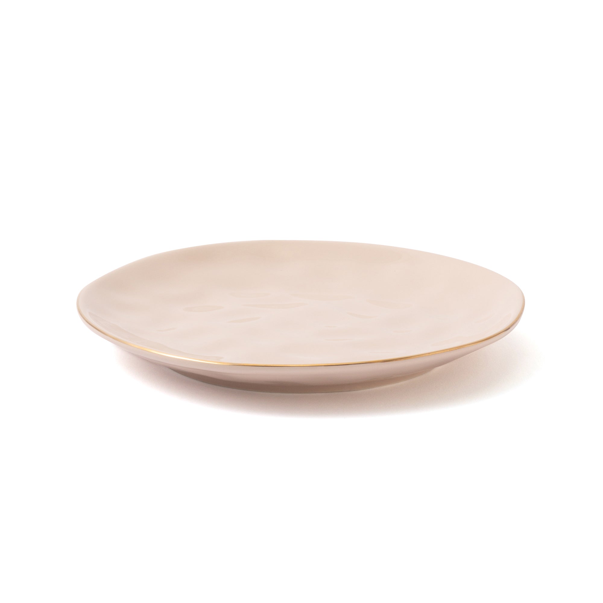 リム部分にさりげなくゴールドを施したプレートです。表面には槌目のような凹凸を施し表情豊かで有機的なデザインに。あえて歪みを生かして、温もりを感じるフォルムに仕上げました。別売りのグリッタープレートとのコーディネートがおすすめです。ホリデーシーズンの食卓にはもちろん、どんなコーディネートにもなじみやすいニュアンスカラーは普段使いにもぴったりです。