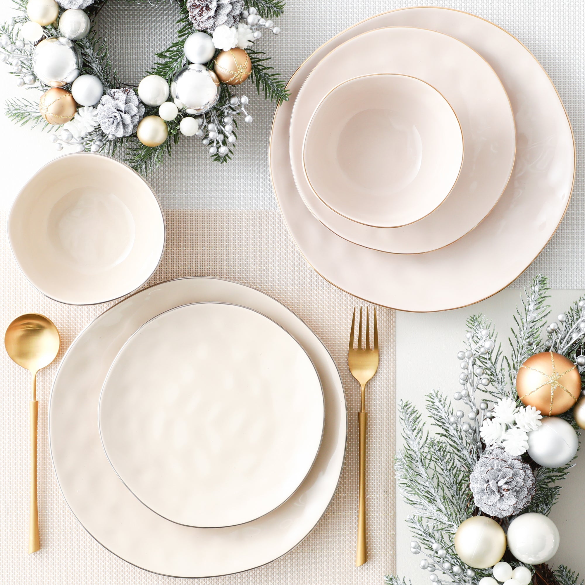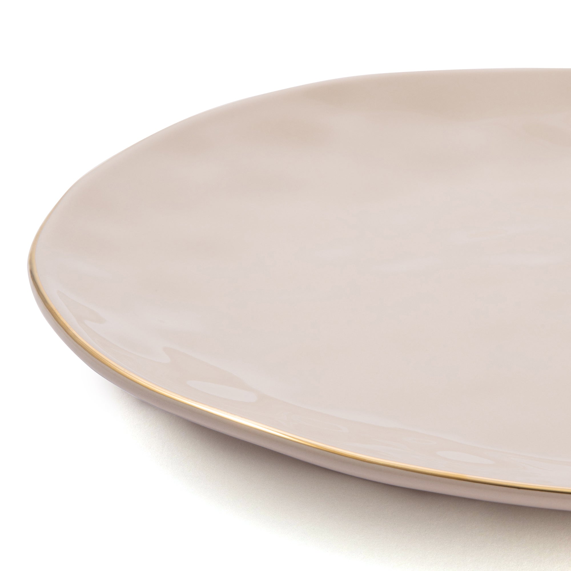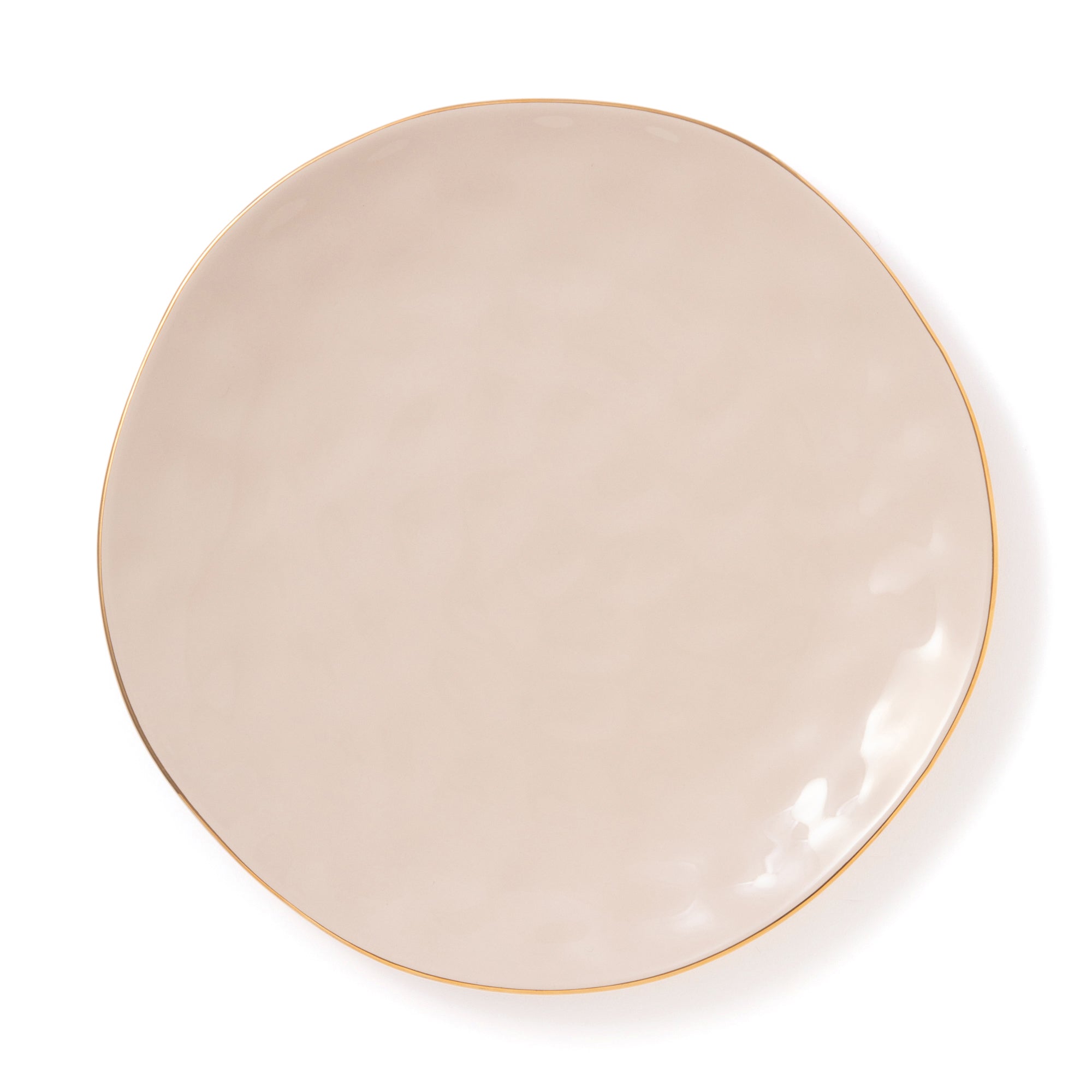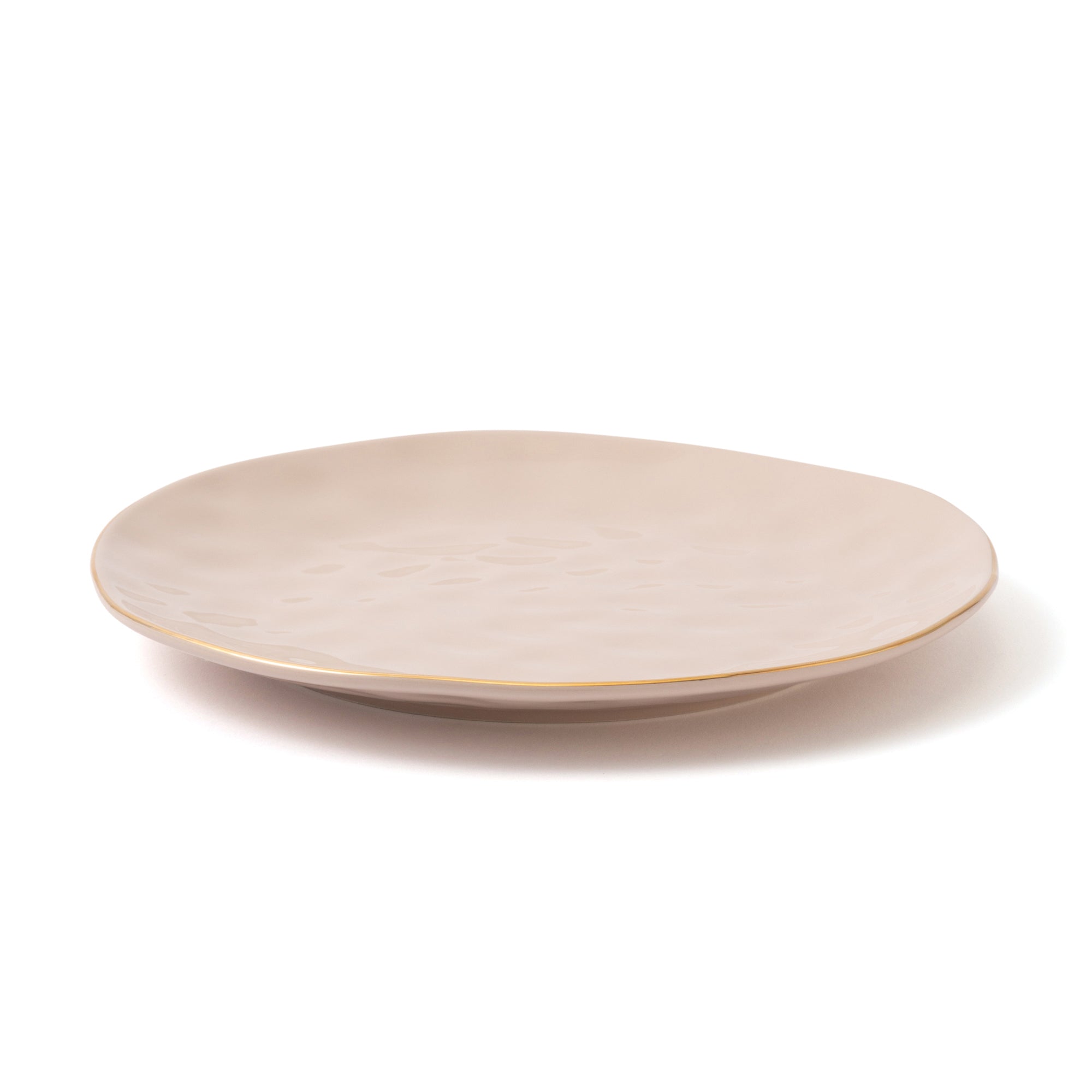 リム部分にさりげなくゴールドを施したプレートです。表面には槌目のような凹凸を施し表情豊かで有機的なデザインに。あえて歪みを生かして、温もりを感じるフォルムに仕上げました。別売りのグリッタープレートとのコーディネートがおすすめです。ホリデーシーズンの食卓にはもちろん、どんなコーディネートにもなじみやすいニュアンスカラーは普段使いにもぴったりです。