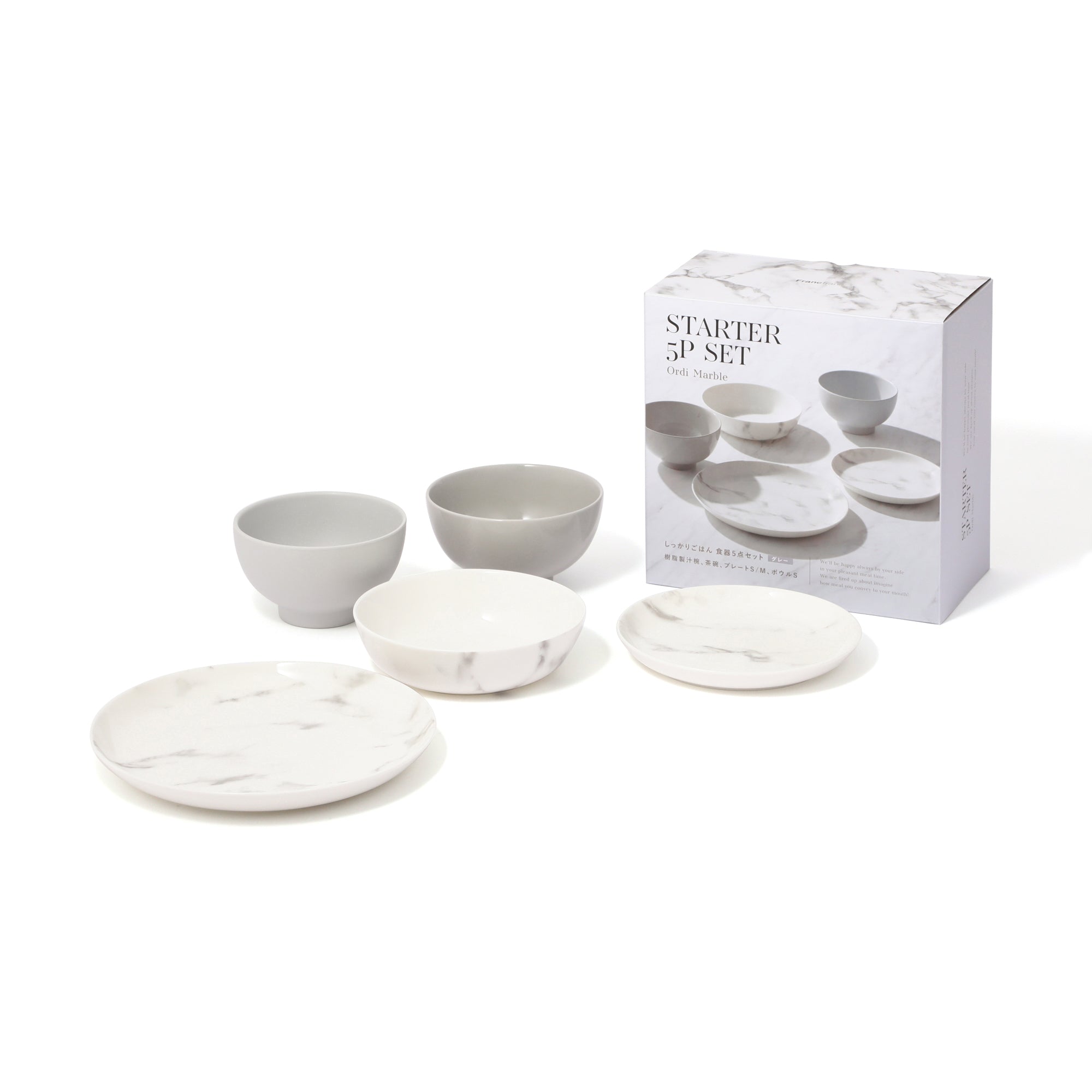 人気のオルディシリーズにマーブル柄が登場。ひとり暮らしのスタートにぜひおすすめしたい、お買い得な食器5点セットです。和食・洋食・中華などメニューを問わず使えて、お料理好きな方も満足できる充実のセット内容はそのまま、大理石柄と無地の食器がセットになったこのセットならたちまちおしゃれな食卓が完成します。朝ごはんから夕食までこの1セットですべてまかなえるよう、茶碗、汁椀、プレートM、プレートS、ボウルS、各1点をオリジナルデザインのボックスにセットしました。マーブル柄はグレーとベージュの2色展開。シーンを選ばず使えて、食器が増えても合わせやすいシンプルなデザインは、本物の大理石らしさを表現するため色によって柄を少しずつ調整しているこだわりのアイテムです。電子レンジや食器洗浄機もOKだから気兼ねなく普段使いできます。(※汁椀は電子レンジご利用いただけません)人気の「オルディシリーズ」では、一人暮らしの方からファミリーまで様々なライフスタイルに適した幅広いアイテムを取り揃えています。日々の食卓をちょっぴり豊かにしてくれるタイムレスな一枚をぜひ見つけてください。