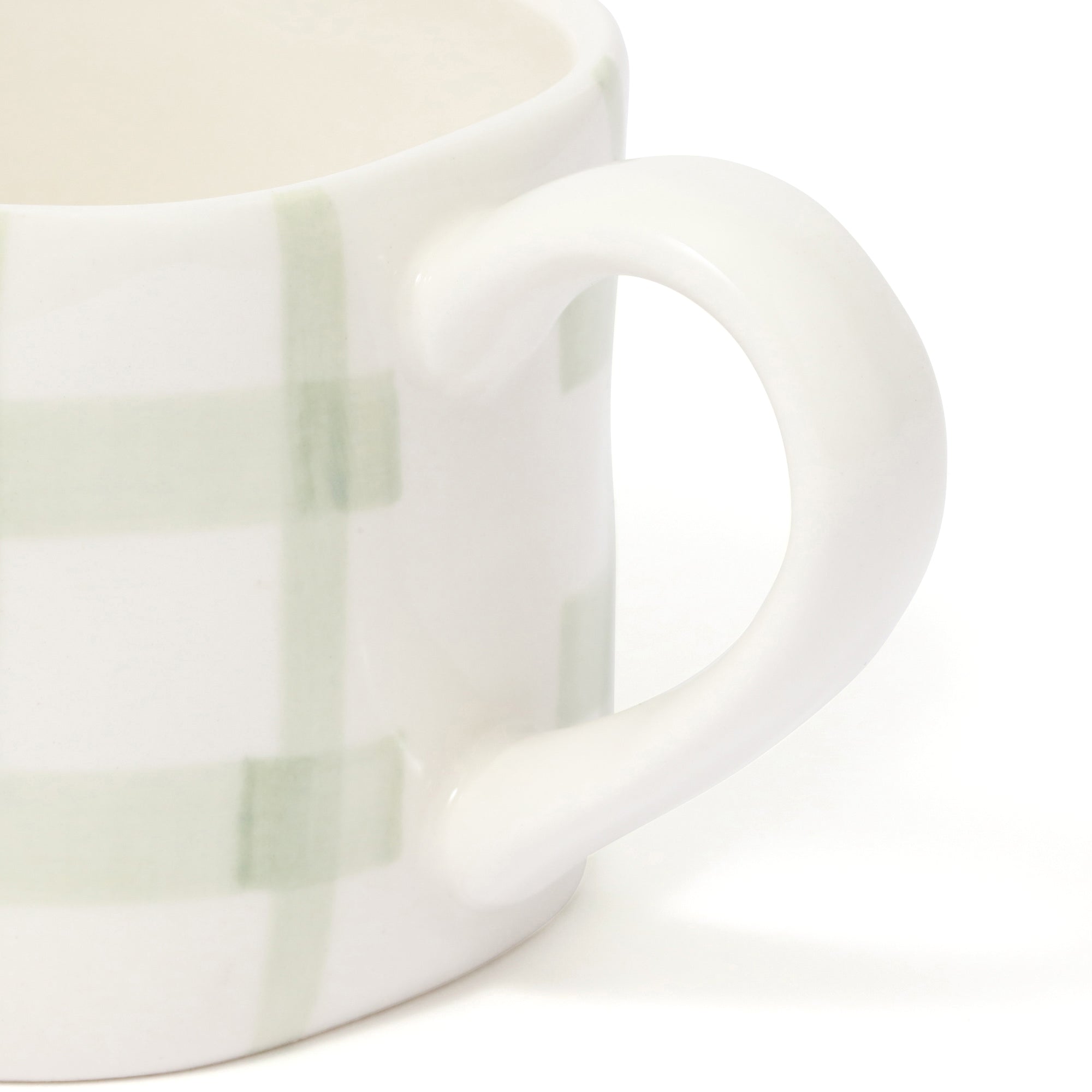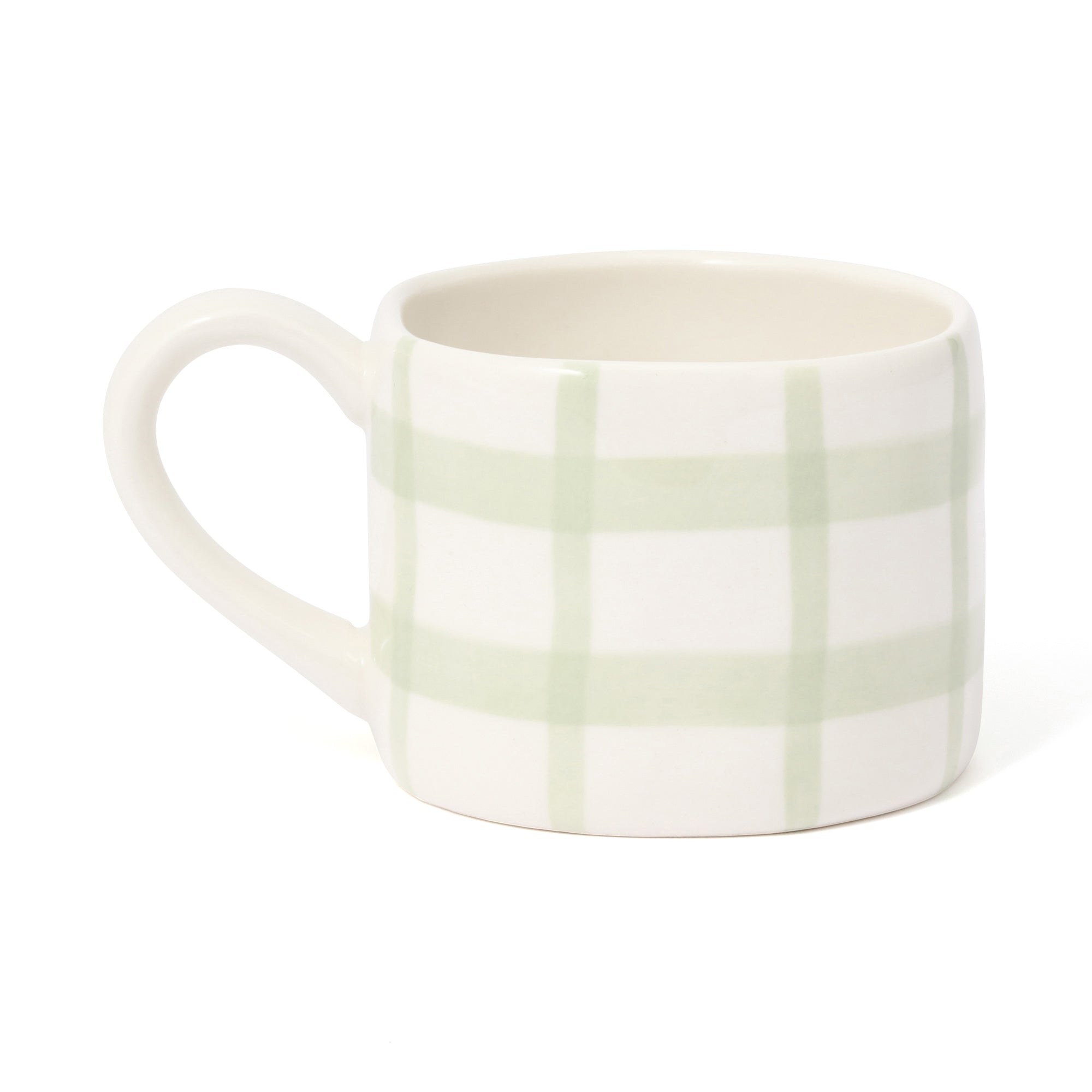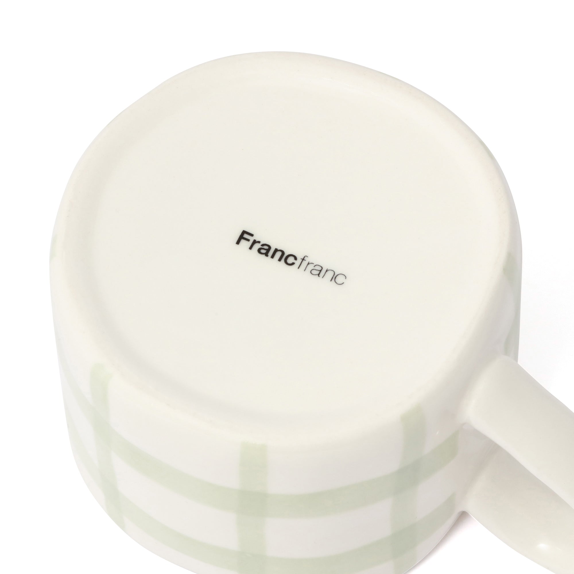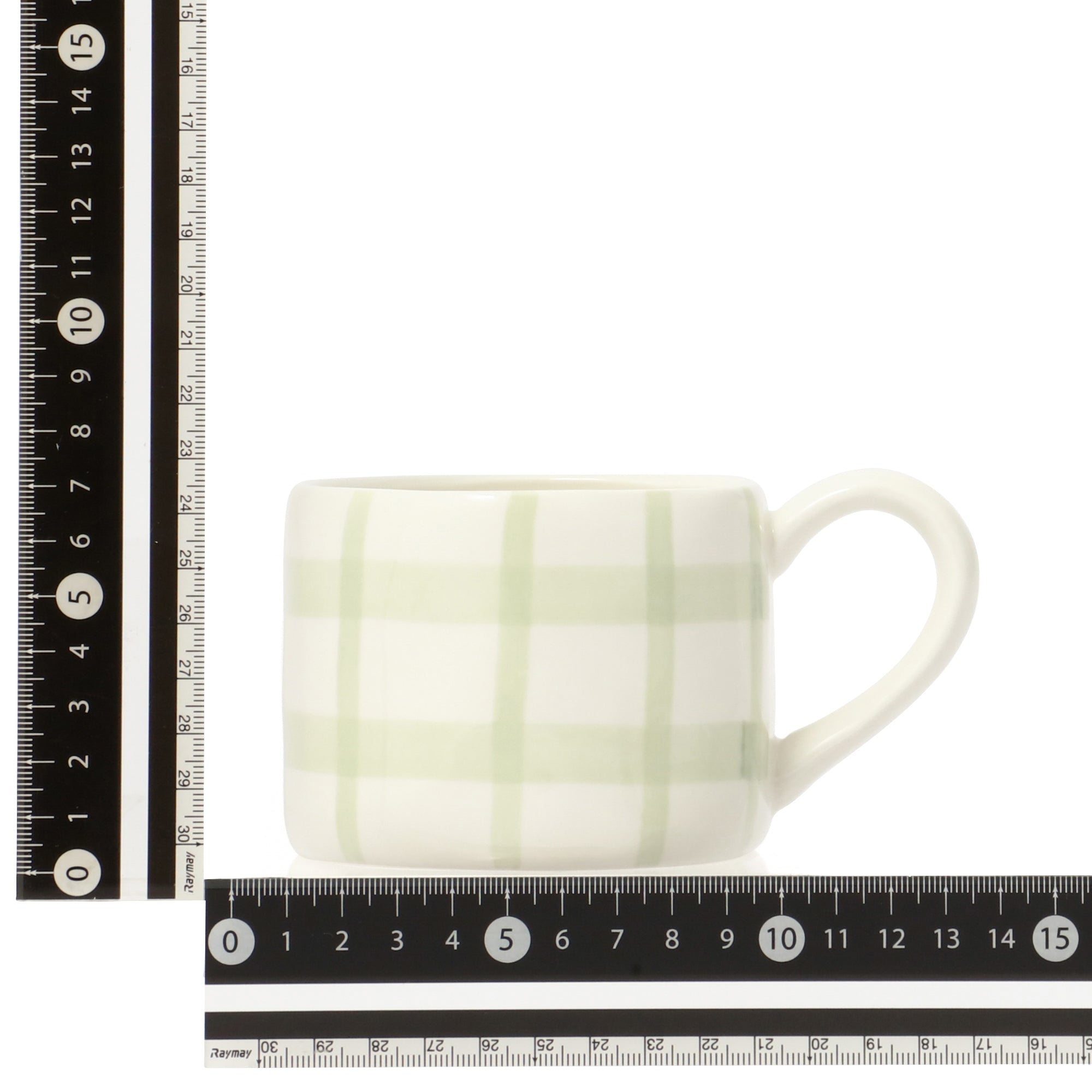 ハンドペイントのチェック柄を施したマグカップです。ぽってりとした手びねりのようなフォルムがレトロな可愛らしさ。温かい飲み物をいれるのにぴったりのデザインです。手仕事ならではの優しいタッチが、ノスタルジックで温もり溢れるティータイムを演出します。