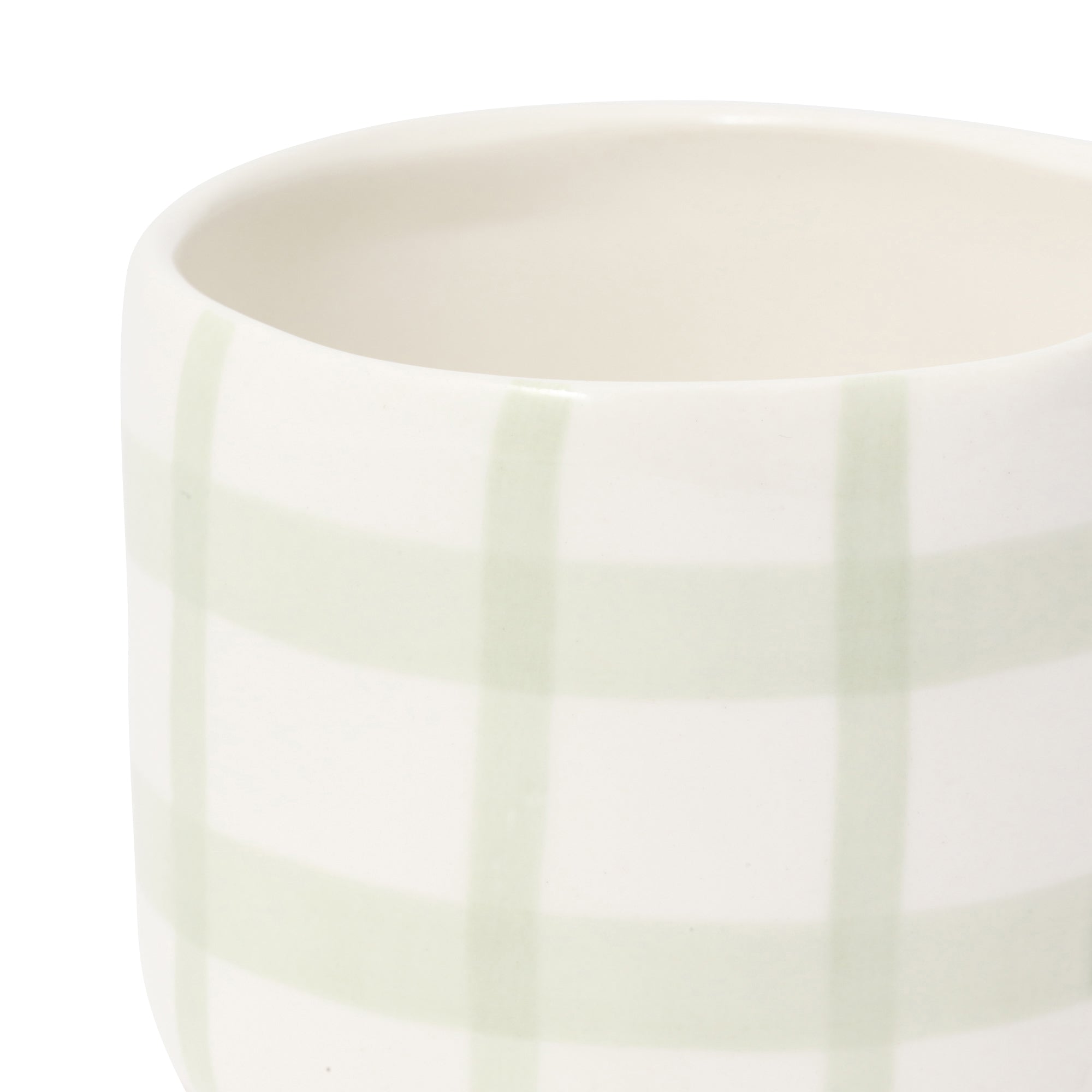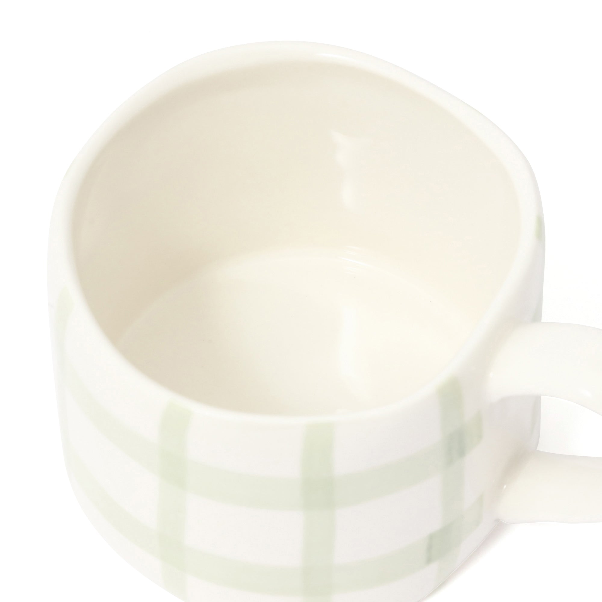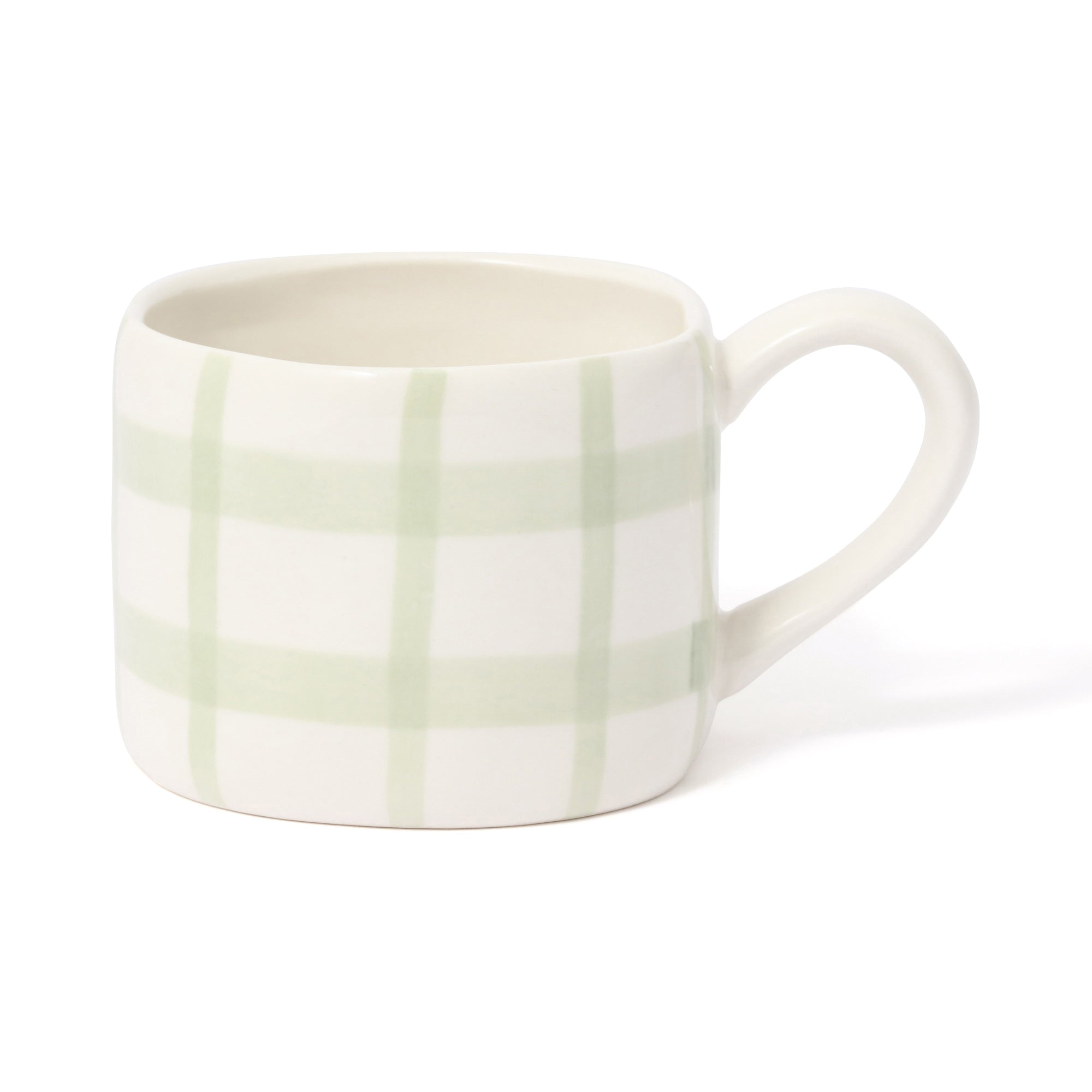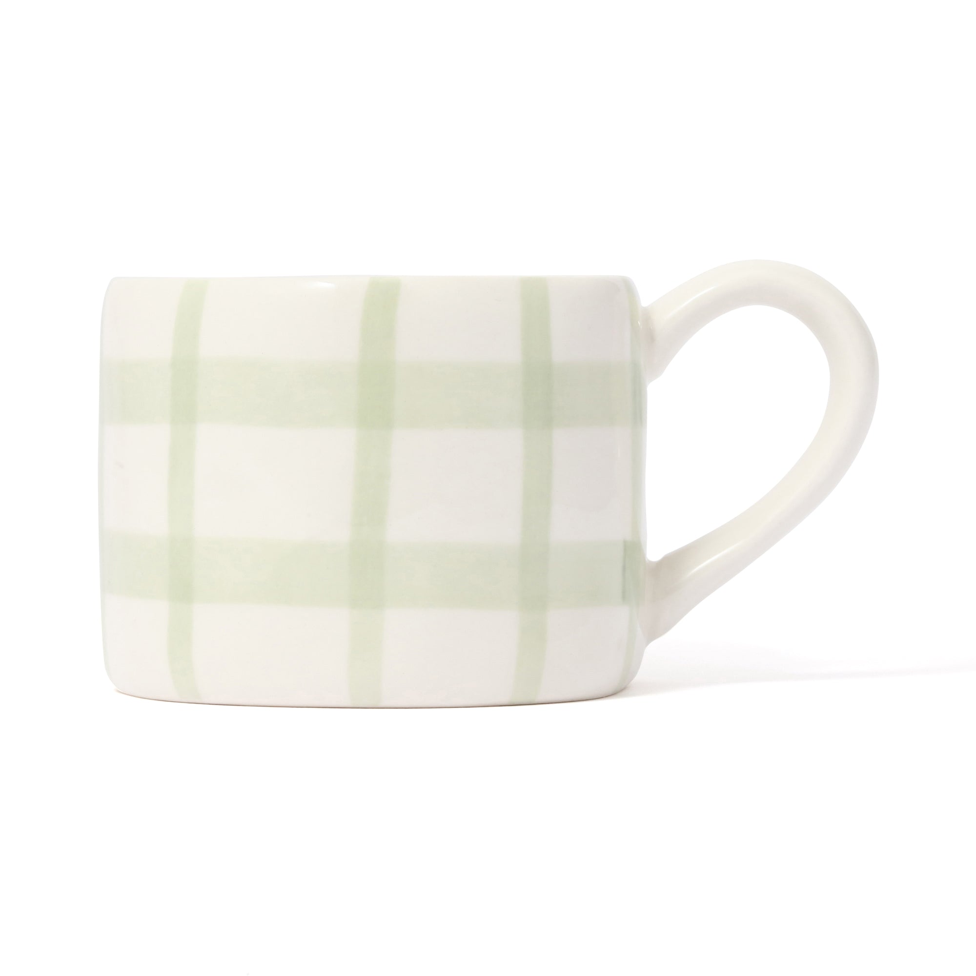 ハンドペイントのチェック柄を施したマグカップです。ぽってりとした手びねりのようなフォルムがレトロな可愛らしさ。温かい飲み物をいれるのにぴったりのデザインです。手仕事ならではの優しいタッチが、ノスタルジックで温もり溢れるティータイムを演出します。