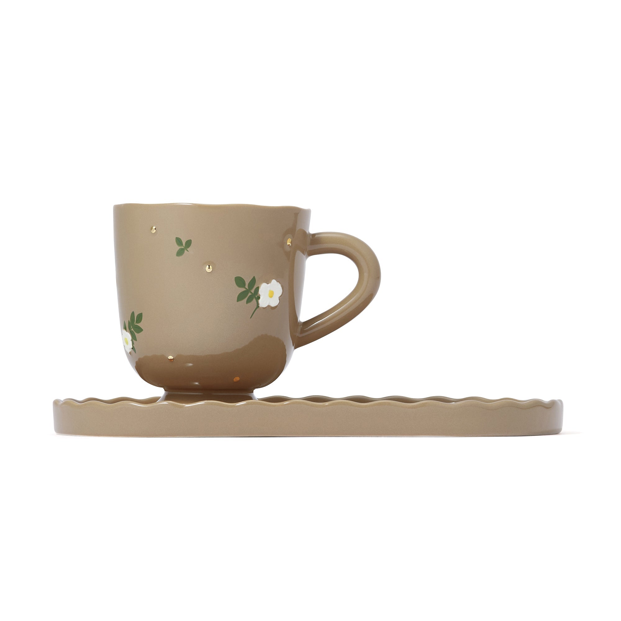 トレンドの小花柄が可愛らしいデザインのカフェセットです。脚付きのカップと大きめのプレートのセット。プレートにカップとスイーツをセットして手軽にティータイムを楽しめます。お花のシルエットが刺繍のようにぷっくり。レースをイメージした緩めのスカラップが可愛らしさを際立たせます。おうちでのひと時を素敵に過ごしてもらえるように大切な方への贈り物や、頑張っている自分へのご褒美にぴったりです。