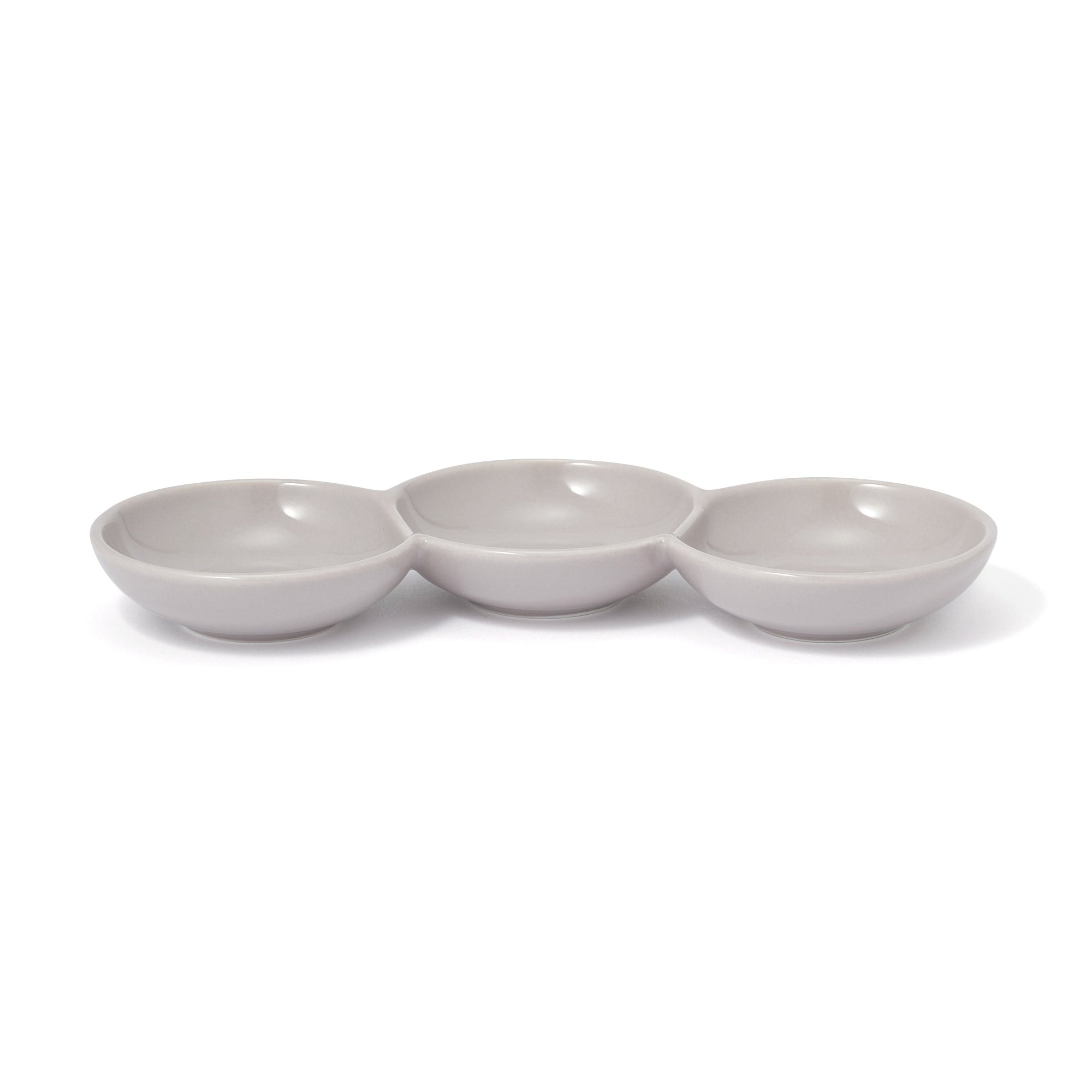 コロンとした丸がぽんぽんと連なった仕切り付きプレートです。薬味や小さなおかずをすっきりと美しく盛り分けられます。シンプルながら遊び心のあるデザインは、普段使いはもちろん、おもてなしの席にもぴったり。小さなお菓子や調味料を盛り付けても絵になる、食卓を華やかに彩る一枚です。