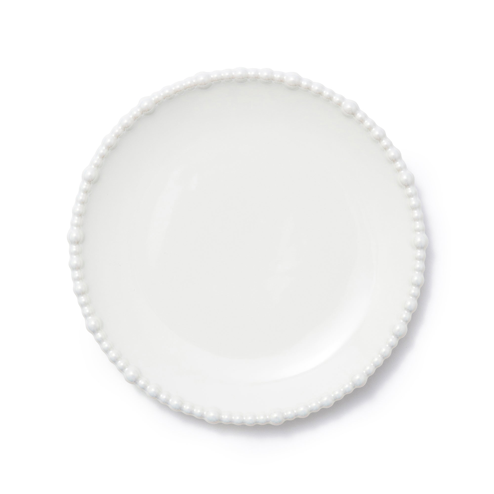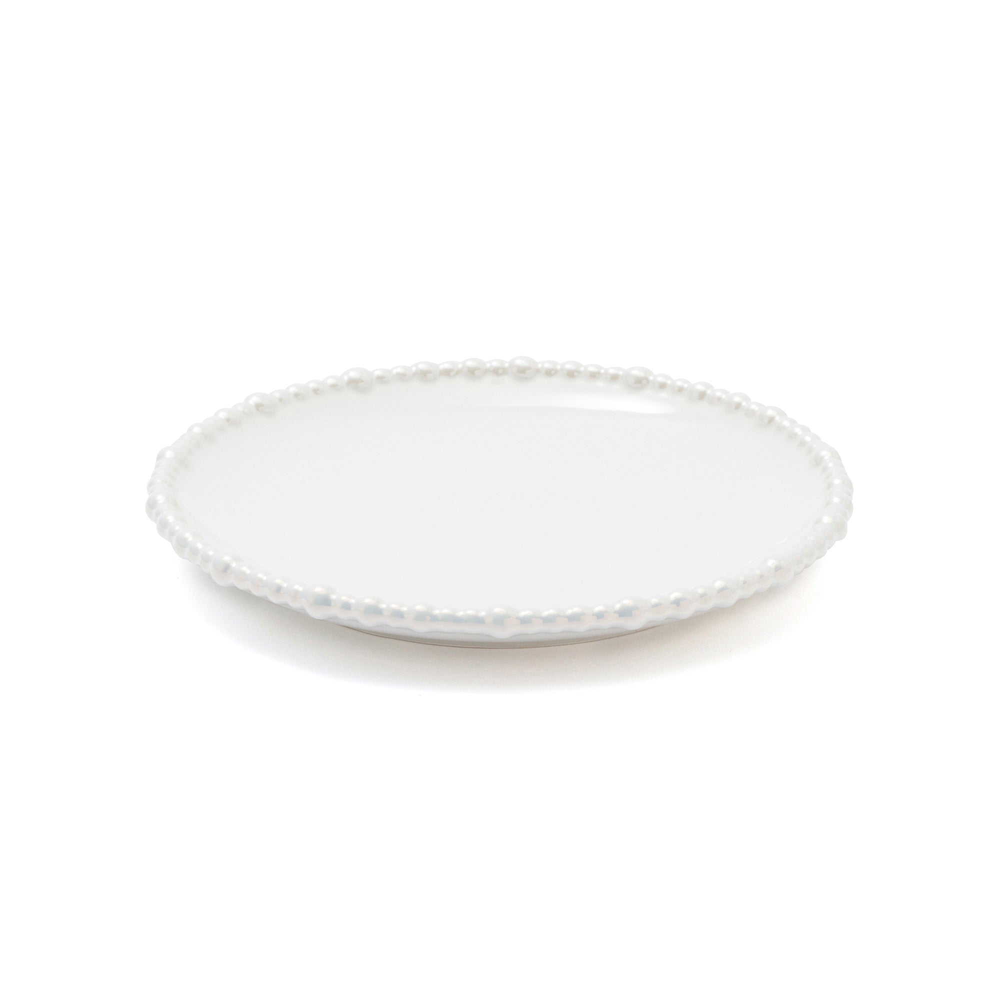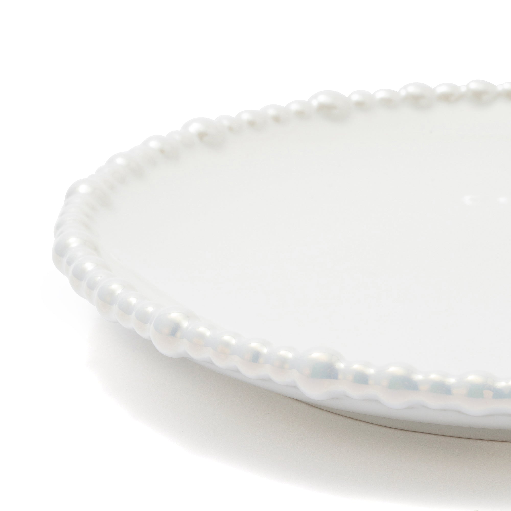 ランダムな大きさのパールをリムにあしらったプレートです。華やかながら日常でも使いやすいデザインです。シェルのセラミック、ガラスシリーズと合わせることで素敵なパーティーコーディネートが完成します。