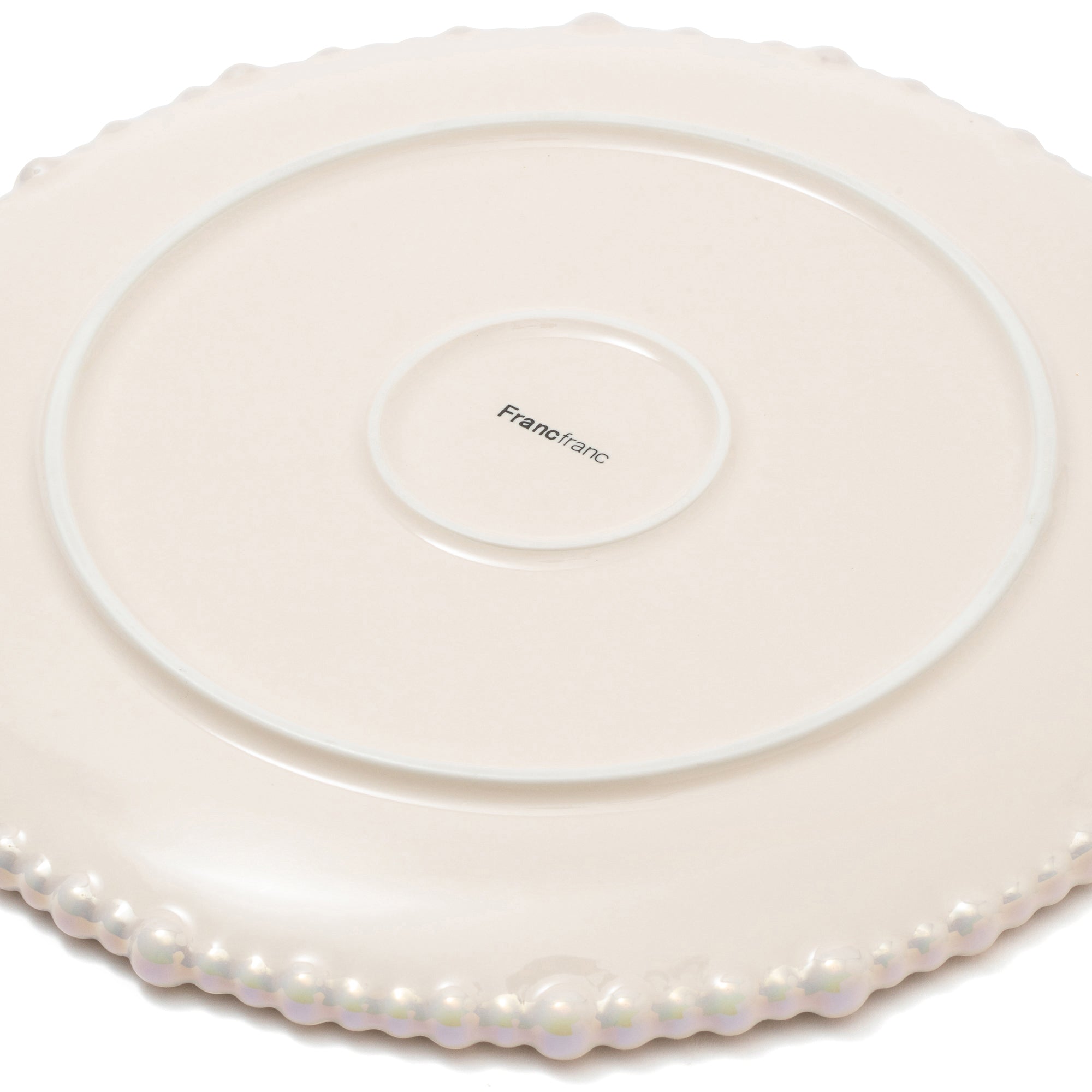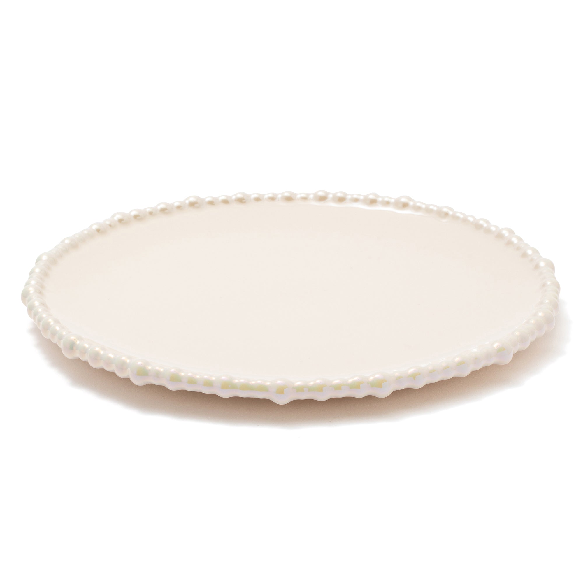 ランダムな大きさのパールをリムにあしらったプレートです。華やかながら日常でも使いやすいデザインです。シェルのセラミック、ガラスシリーズと合わせることで素敵なパーティーコーディネートが完成します。