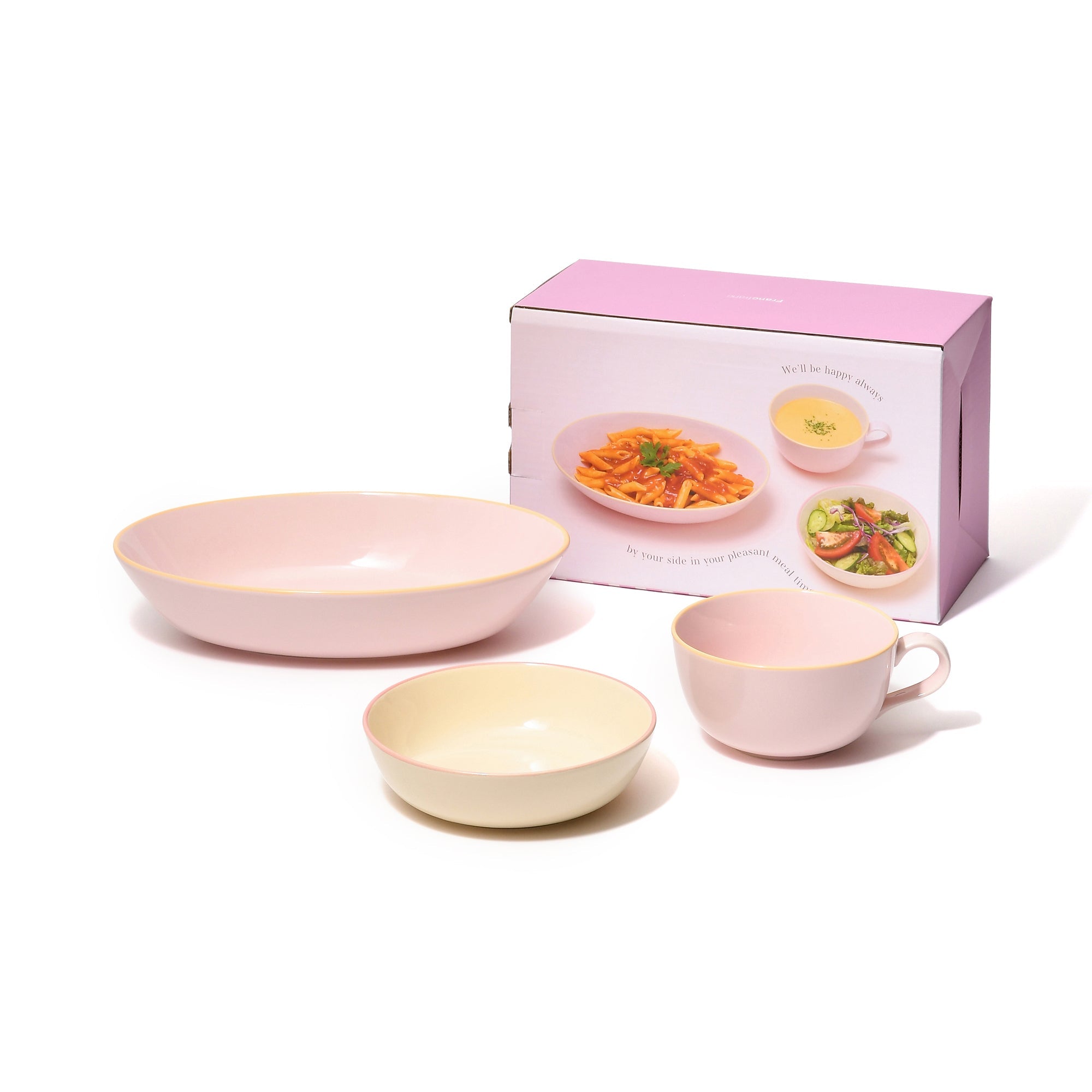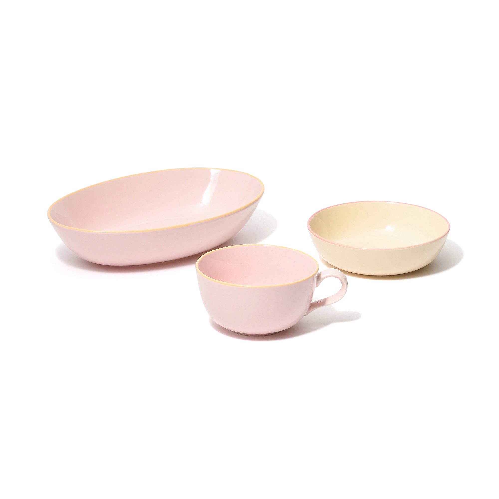 カラフルでかわいいだけじゃなく、普段使いできる食器セットです。カレー、オムライス、パスタにもってこいのオーバルボウルが入ったセット。持ち手付きで飲みやすいスープカップと、サラダや汁ものおかずなど汎用性が高いボウルがついています。バイカラーでおしゃれ。来客用に色違いを組み合わせると、カラフルで元気が出る楽しい食卓を演出できます。電子レンジや食器洗浄機もOKだから気兼ねなく普段使いできます。【セット内容】・スープカップ×1・オーバルボウル×1・ボウルS×1