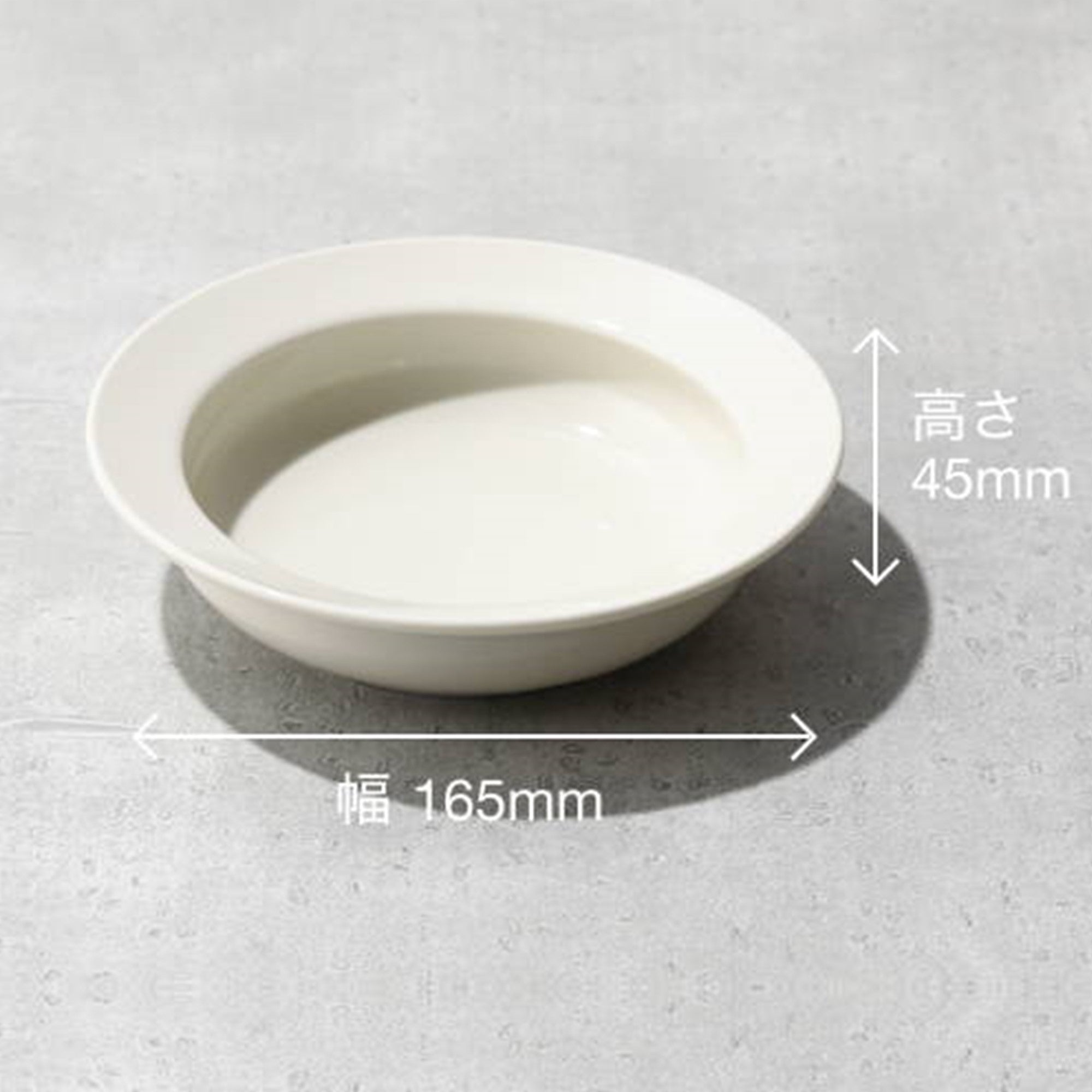 最後のひと口もストレスなくすくえるようにデザインされたボウル。ふちの形状にこだわり、最後まで美味しくいただける一枚です。スプーンやフォークで料理の最後の一口まですくいやすいように、プレートの縁にはリムを付け、内側のカーブを工夫しています。