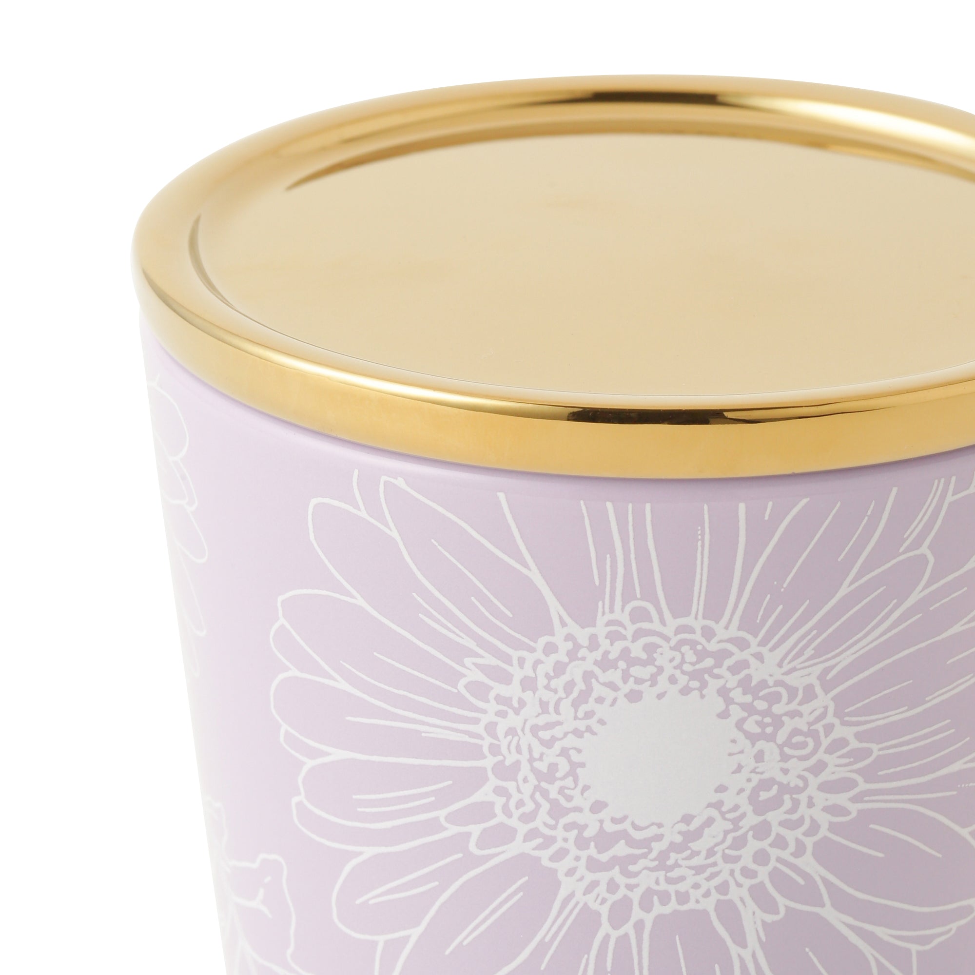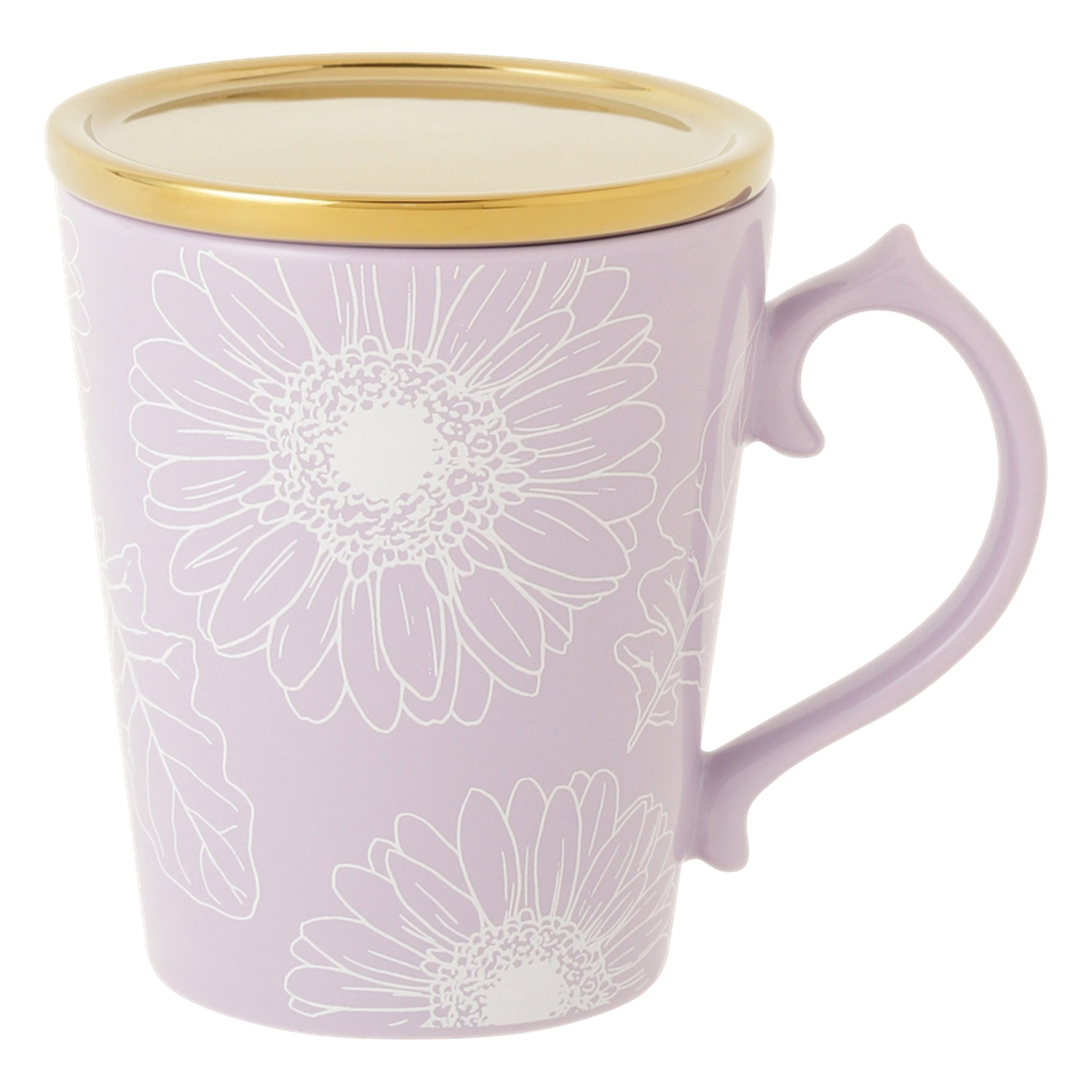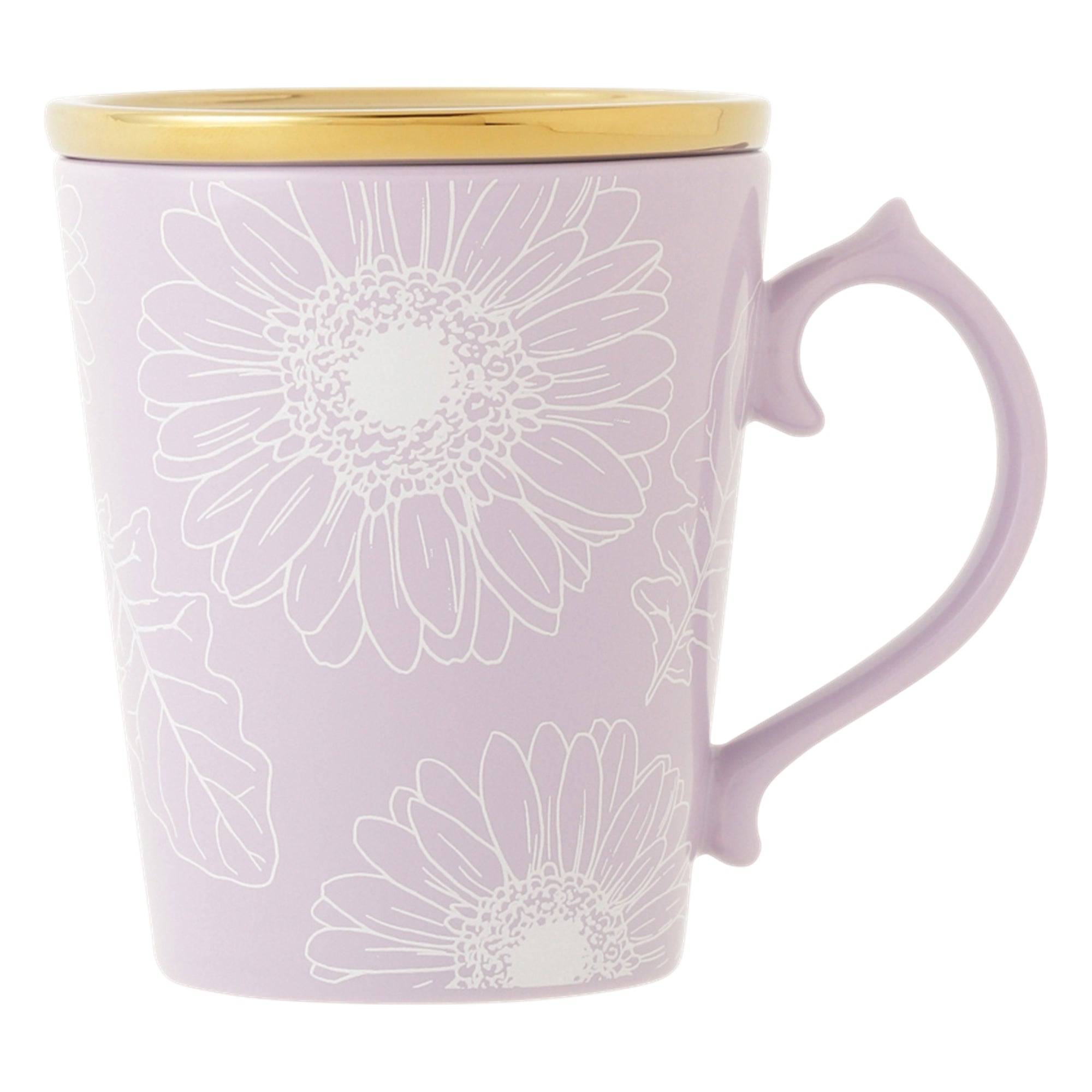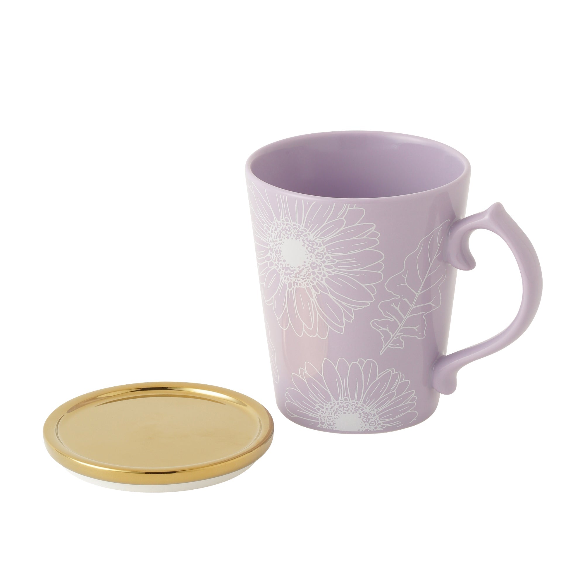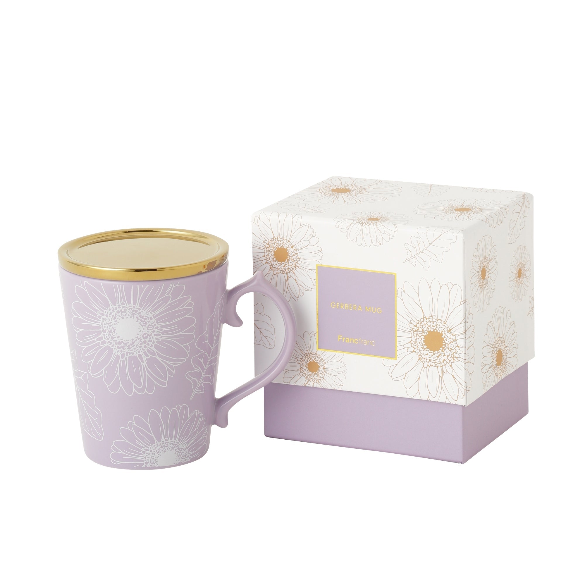 ガーベラ柄が繊細な印象の蓋付きマグカップです。ゴールドの蓋は、ティーバッグを乗せたり、コースターとしてもお使いいただけます。ボックス入りでギフトにもおすすめです。