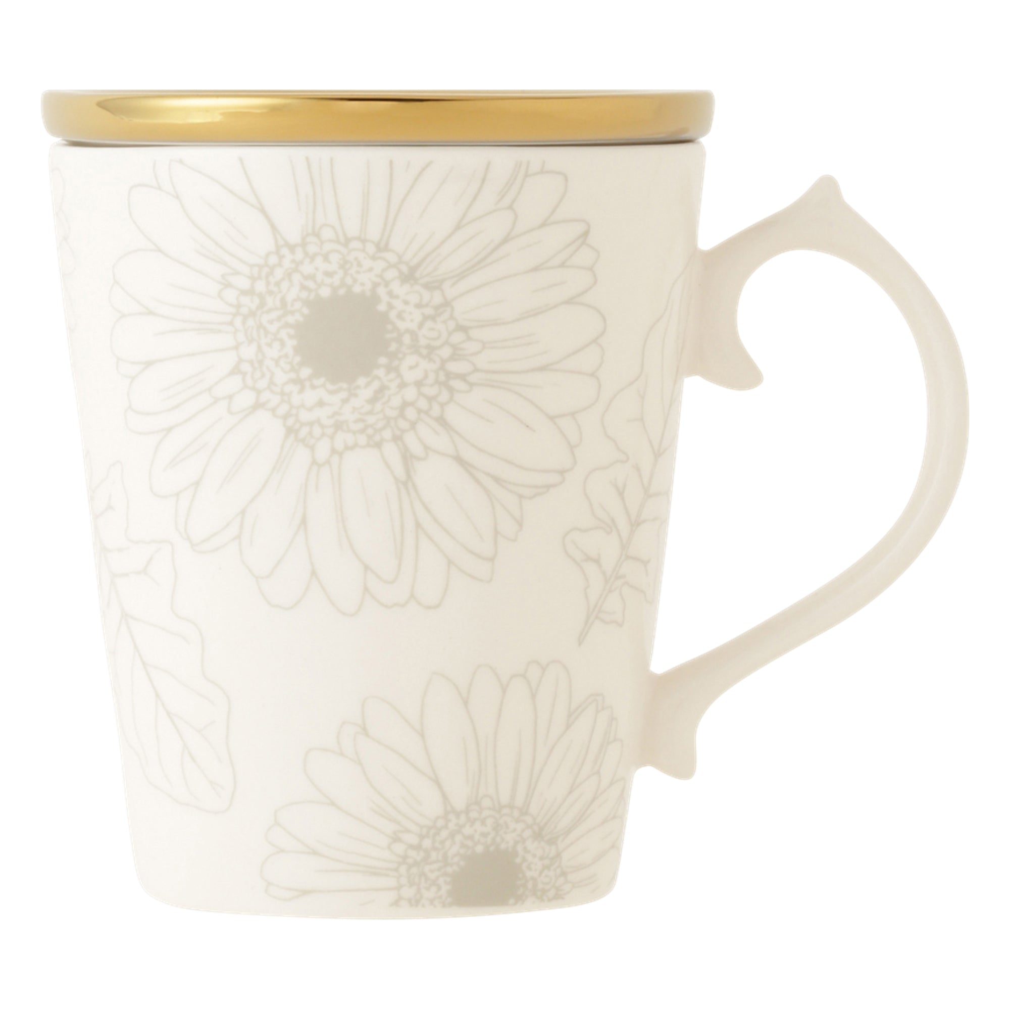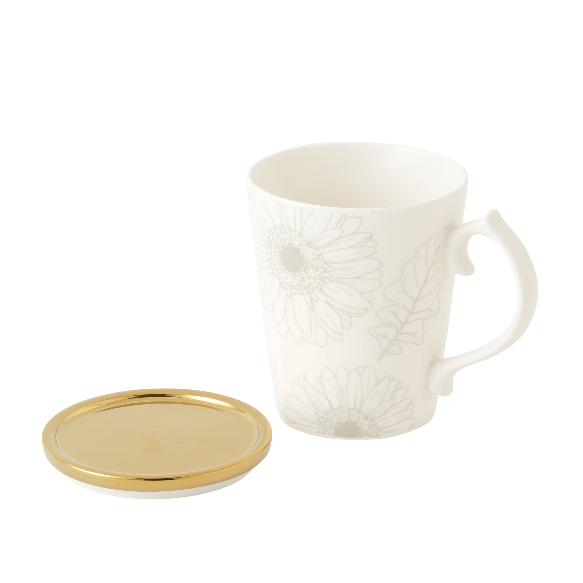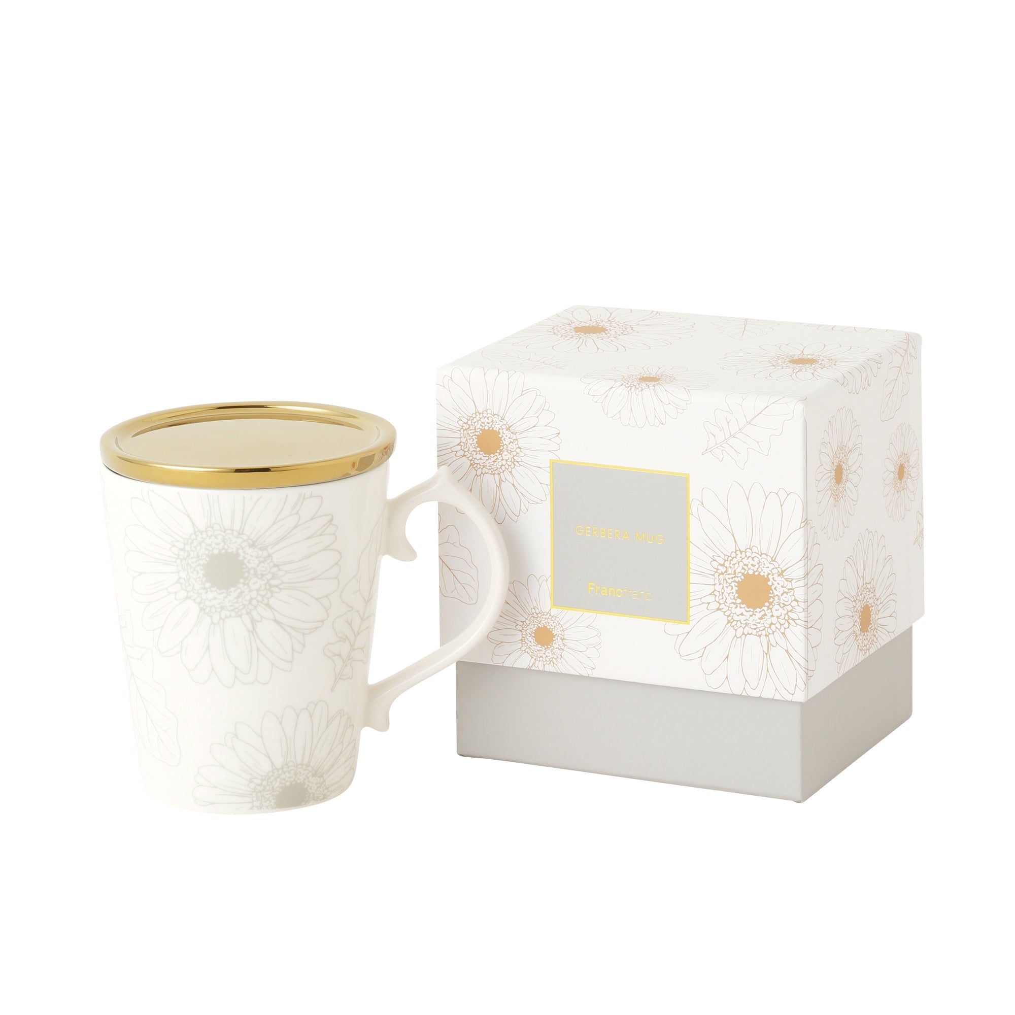 ガーベラ柄が繊細な印象の蓋付きマグカップです。ゴールドの蓋は、ティーバッグを乗せたり、コースターとしてもお使いいただけます。ボックス入りでギフトにもおすすめです。