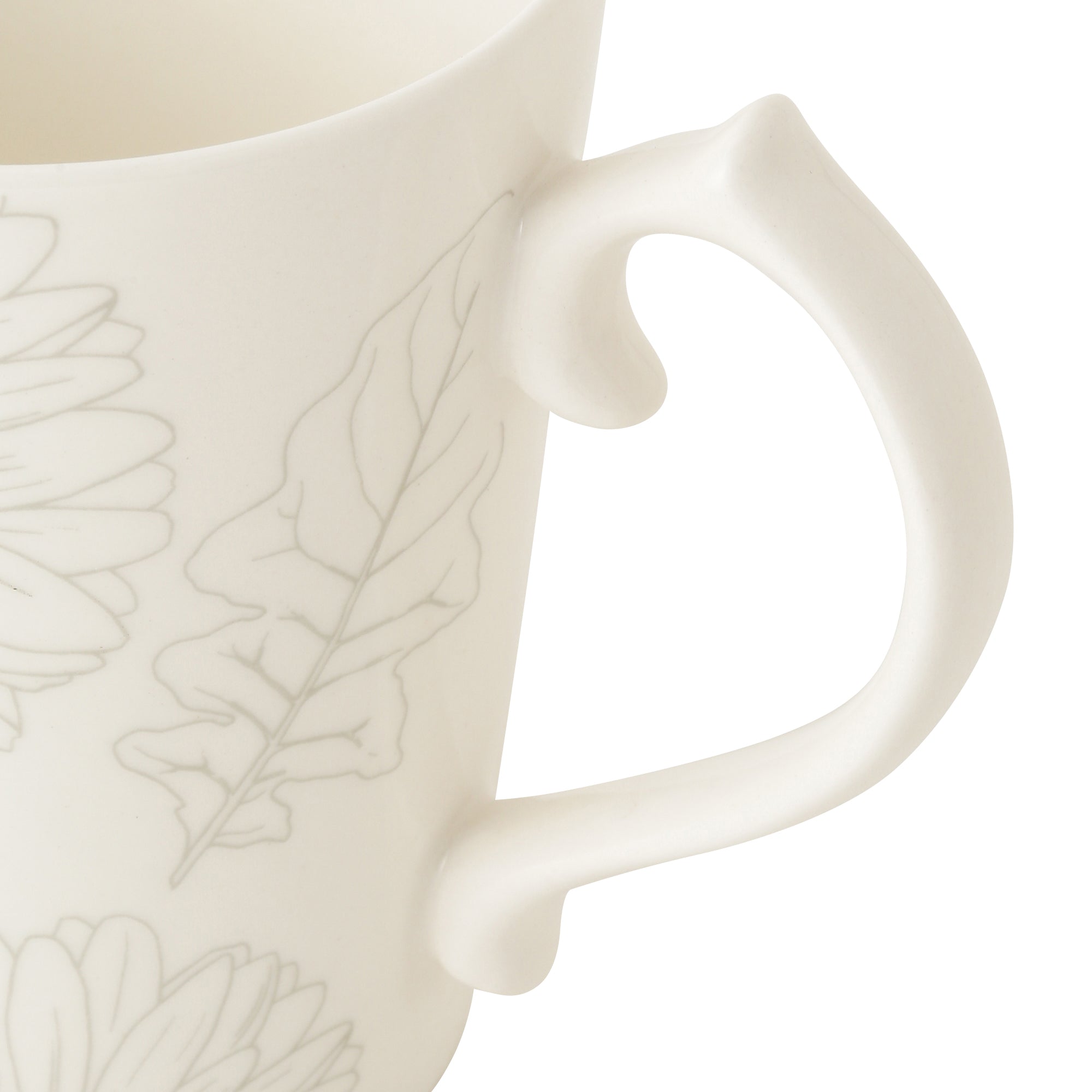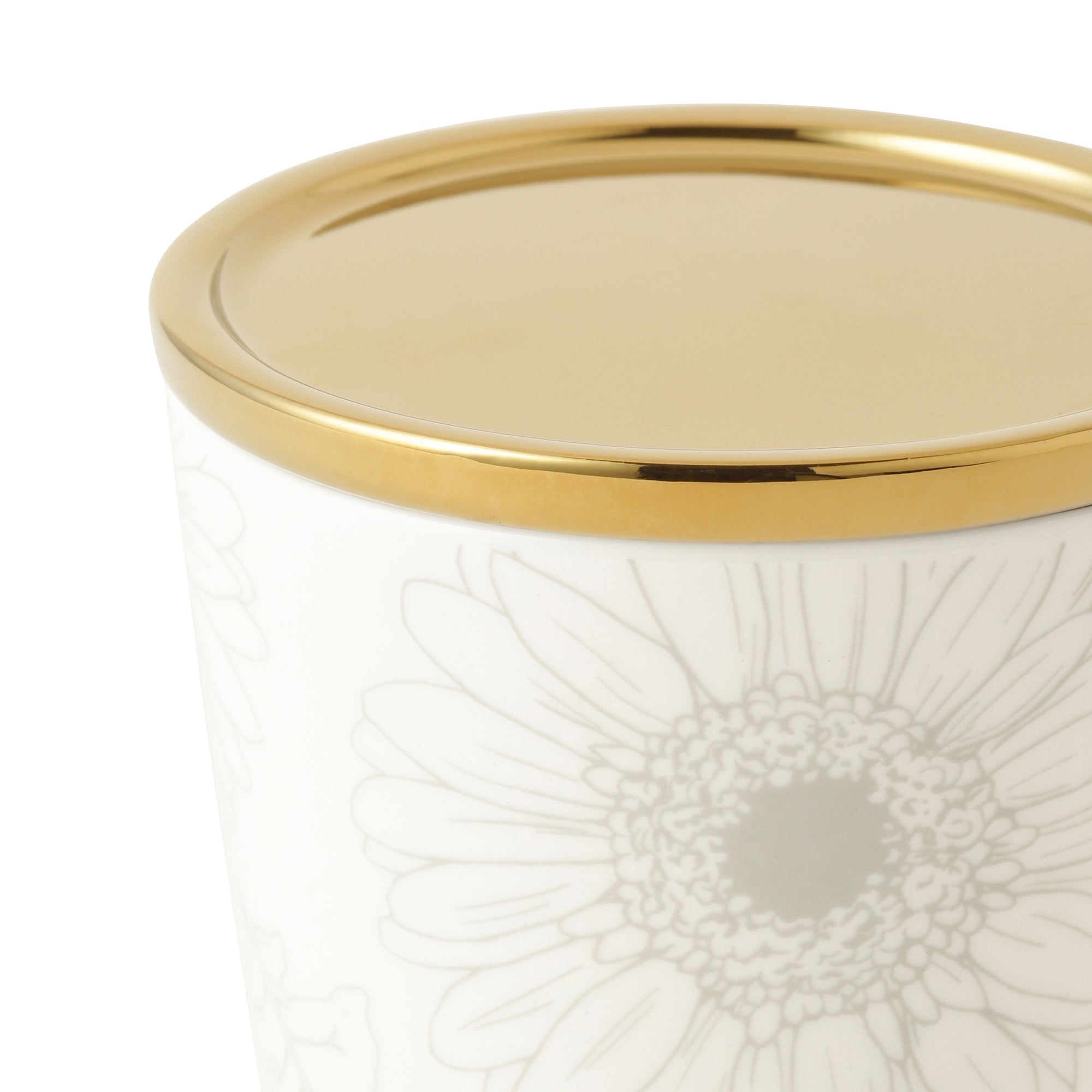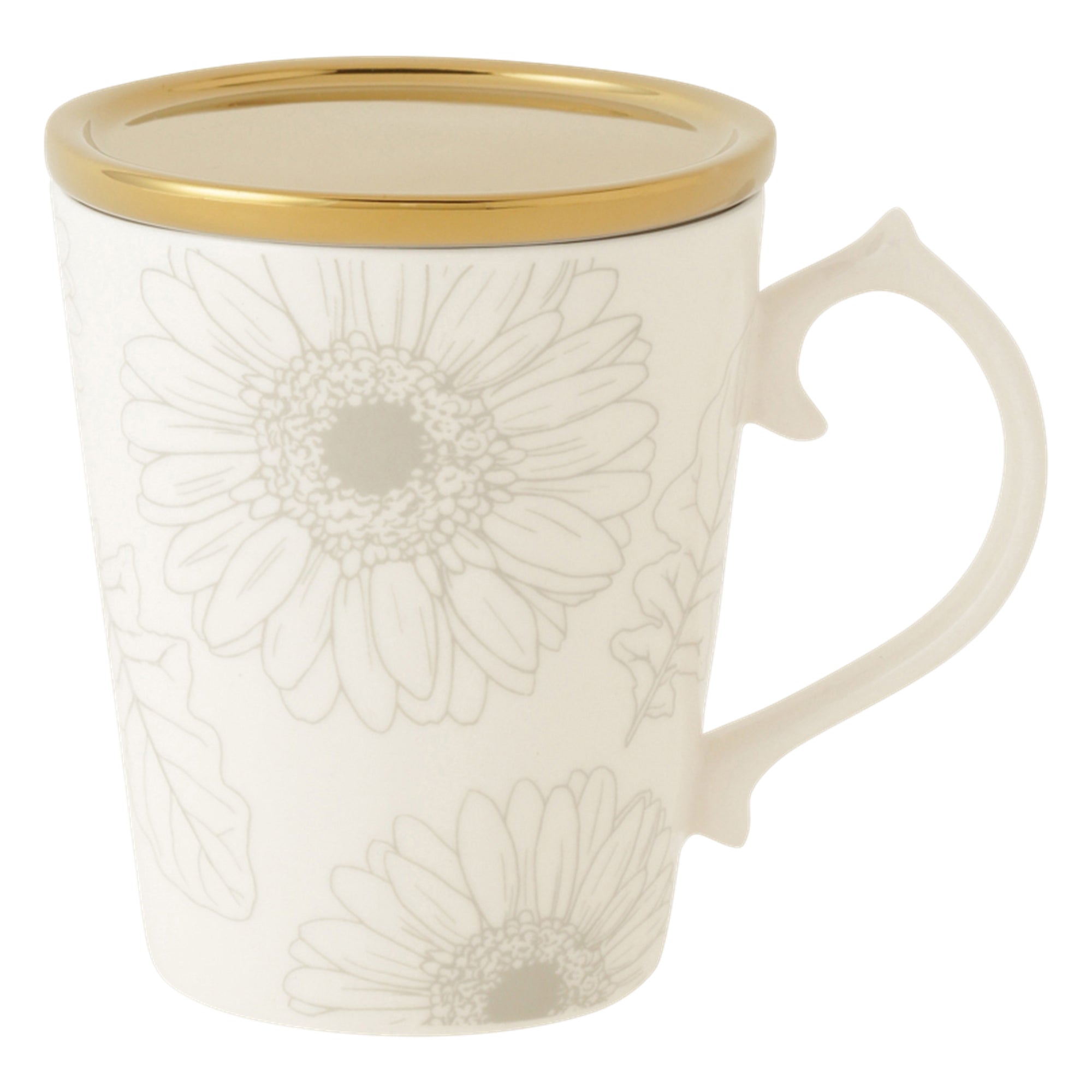 ガーベラ柄が繊細な印象の蓋付きマグカップです。ゴールドの蓋は、ティーバッグを乗せたり、コースターとしてもお使いいただけます。ボックス入りでギフトにもおすすめです。