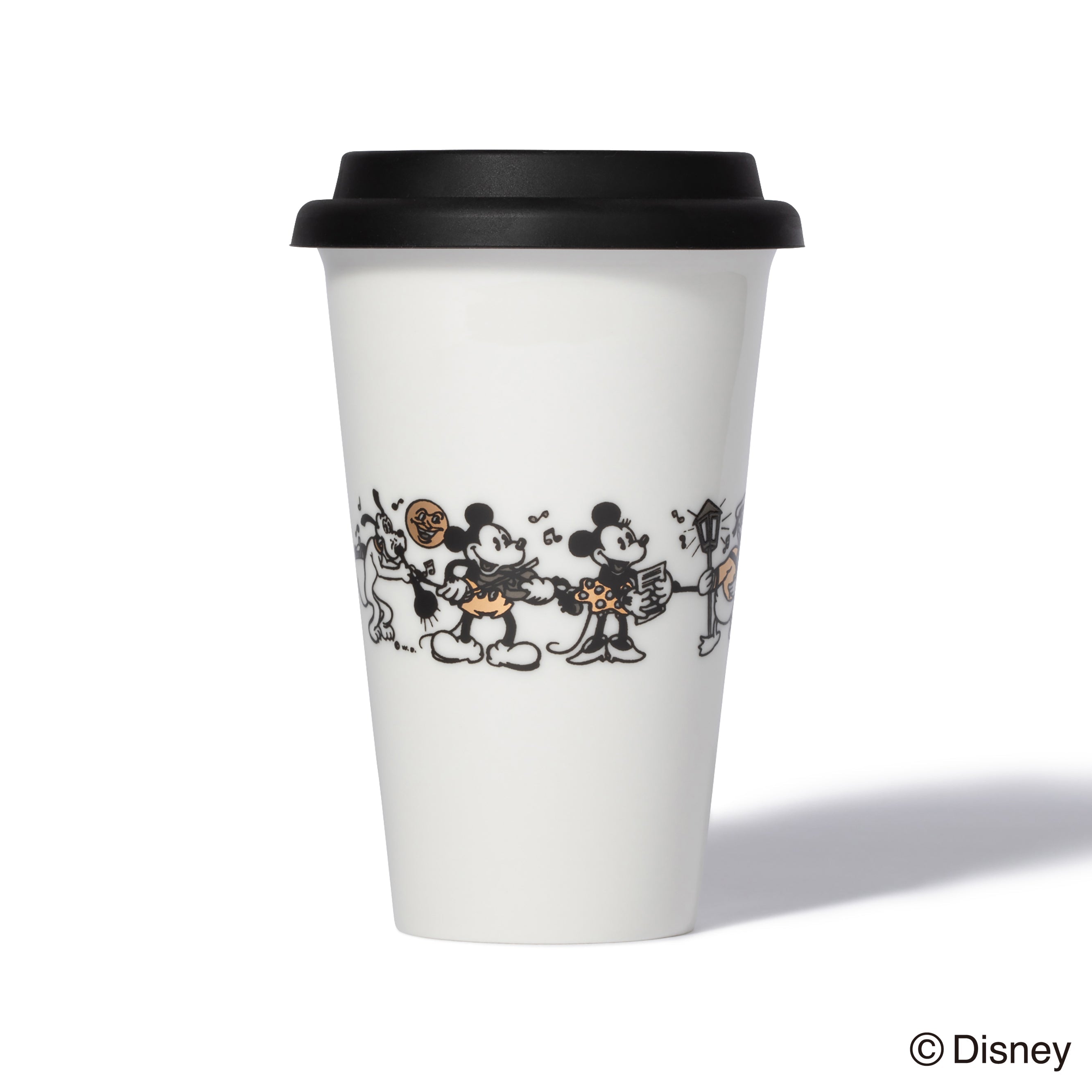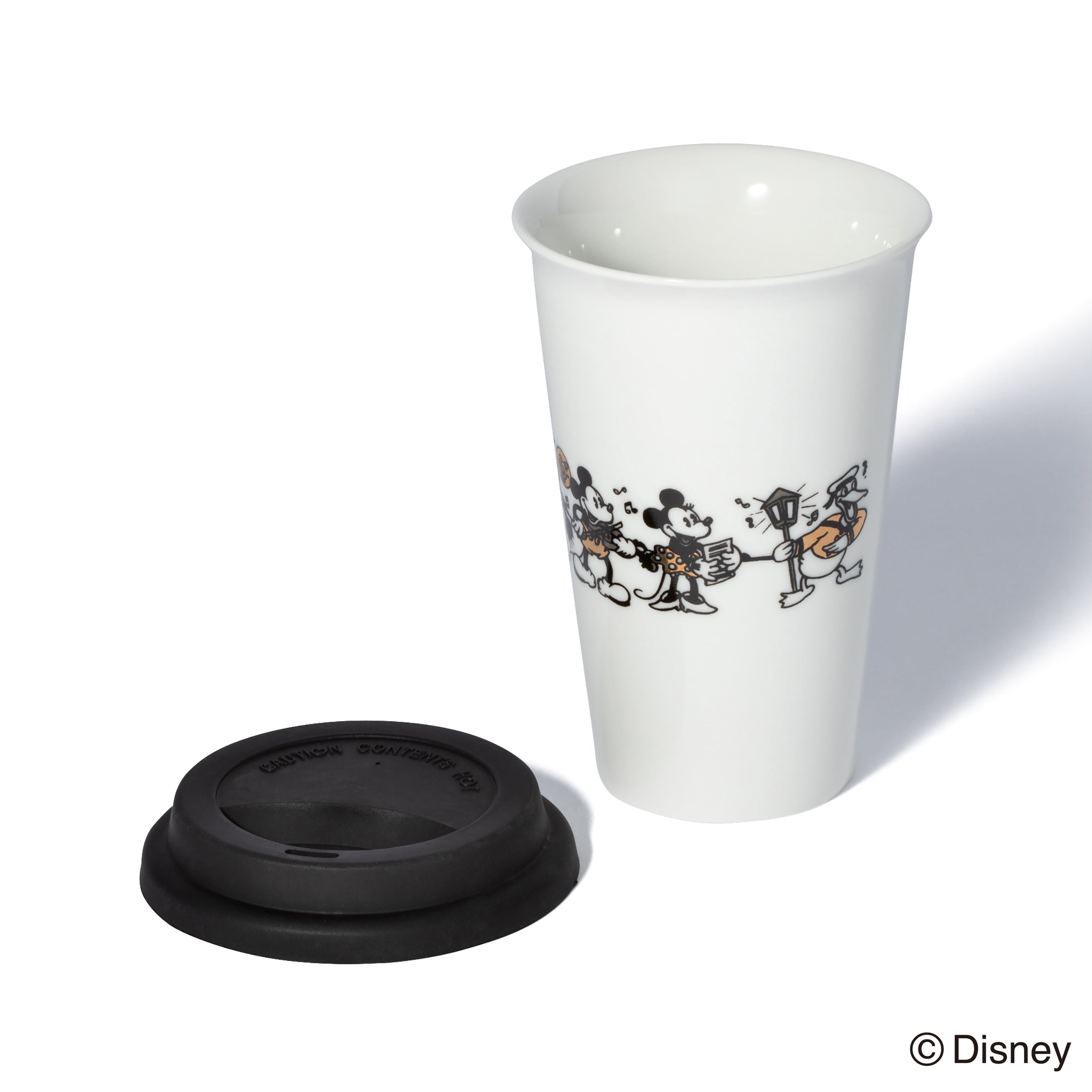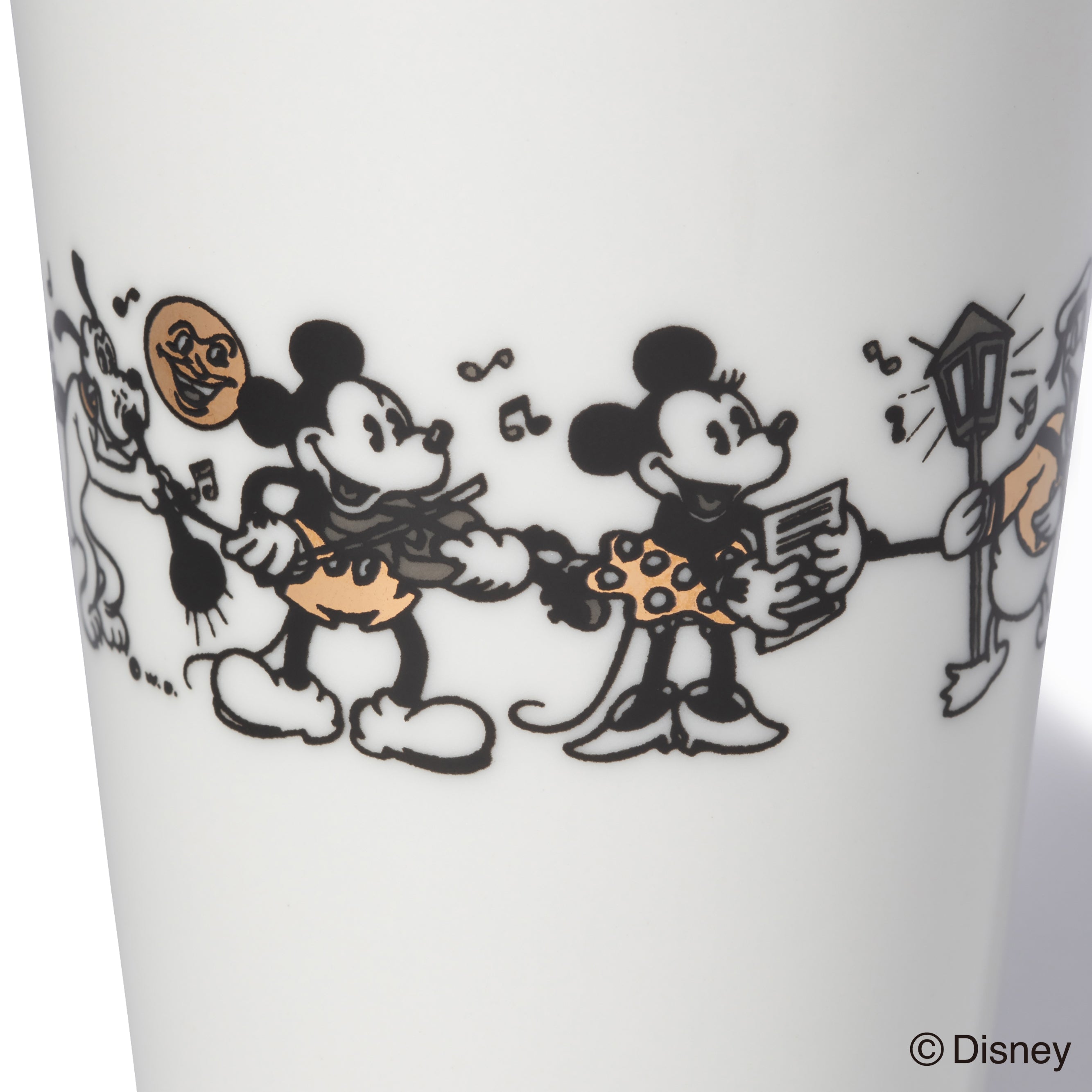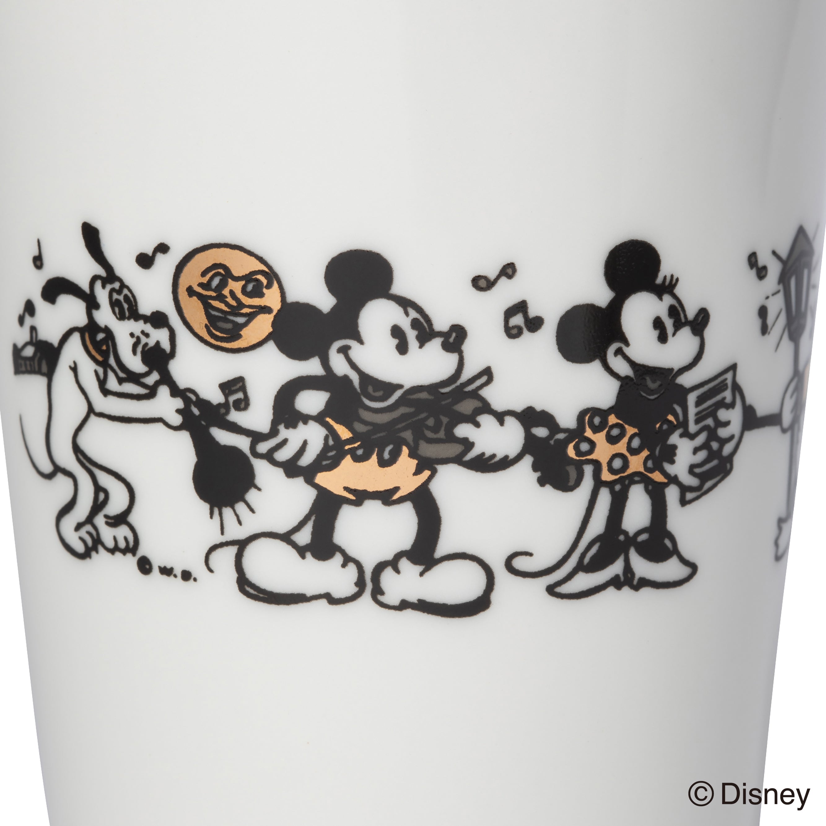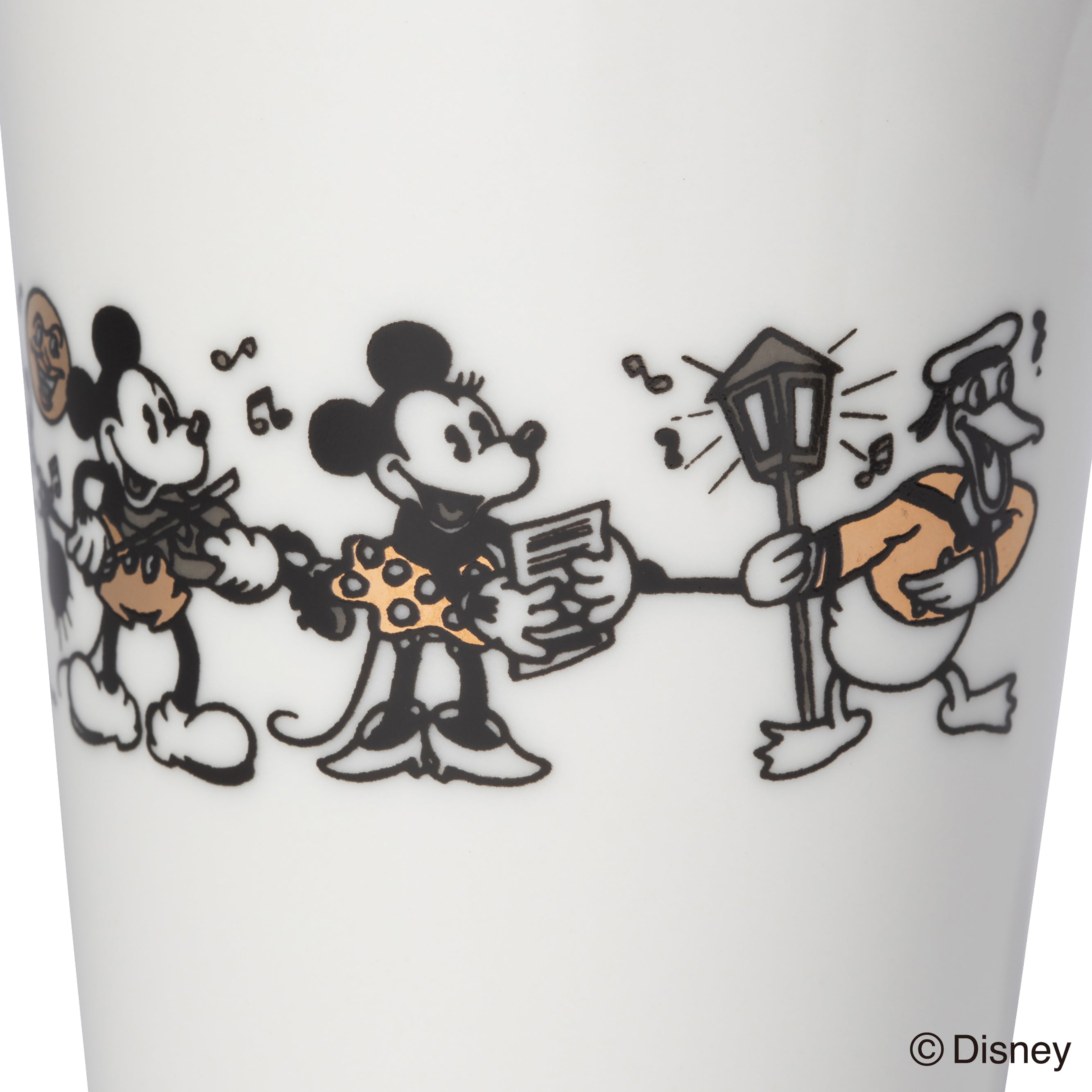 ミッキーと仲間たちが楽しそうに楽器を奏でているデザインの、ダブルウォール(二重構造)のタンブラーです。冷たい飲み物、熱い飲み物が通常のマグに比べ、冷めにくく結露しにくいです。コーヒーショップのカップをイメージした形なので、オフィスやご自宅でもカフェ気分を味わえます。ヴィンテージ風のミッキーたちがワンポイントではいっているので大人っぽく、オフィスでも気兼ねなくお使いいただけます。