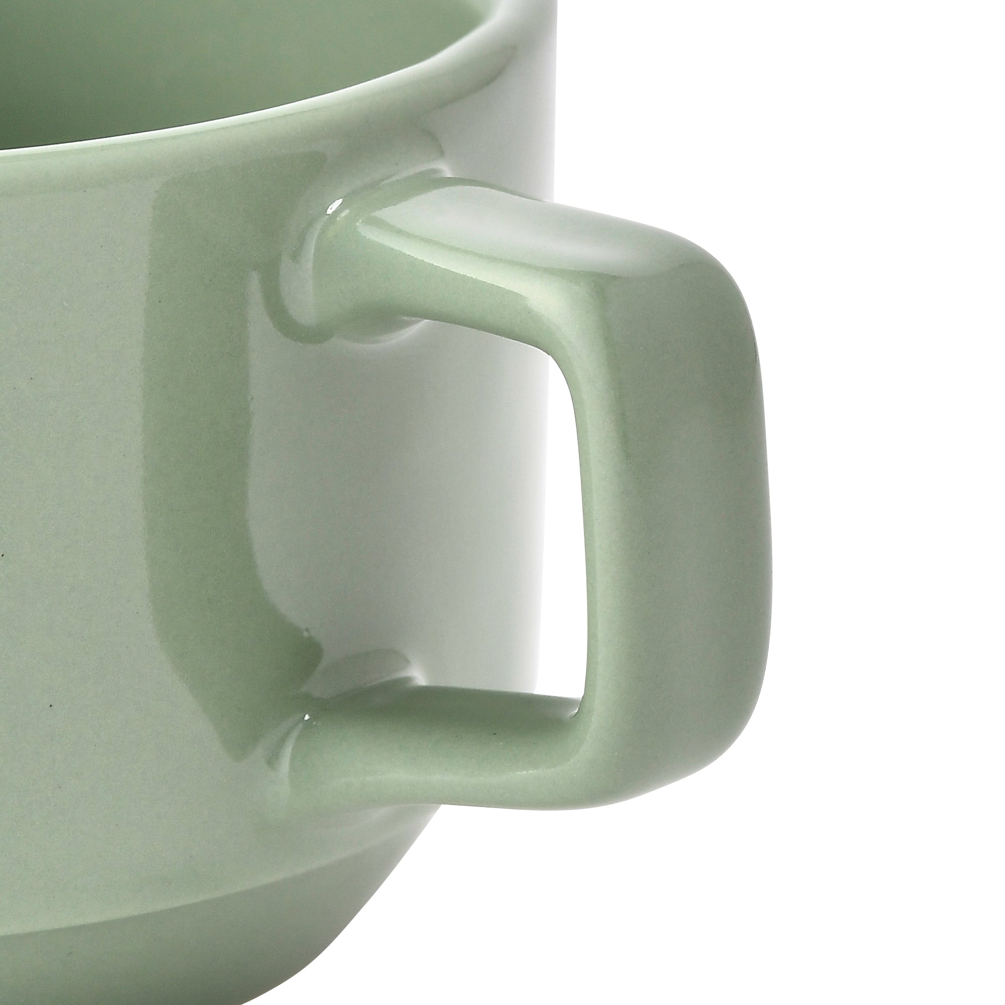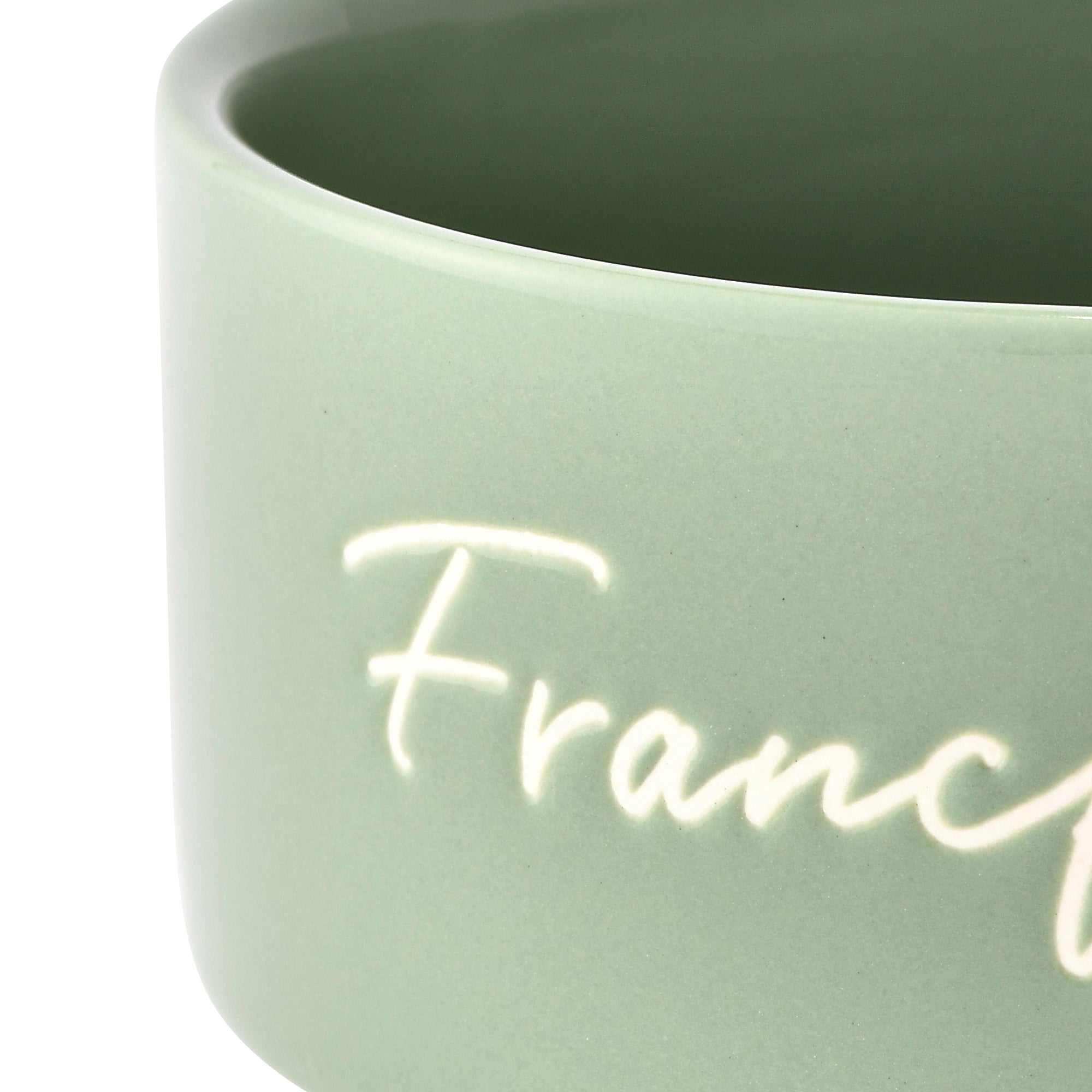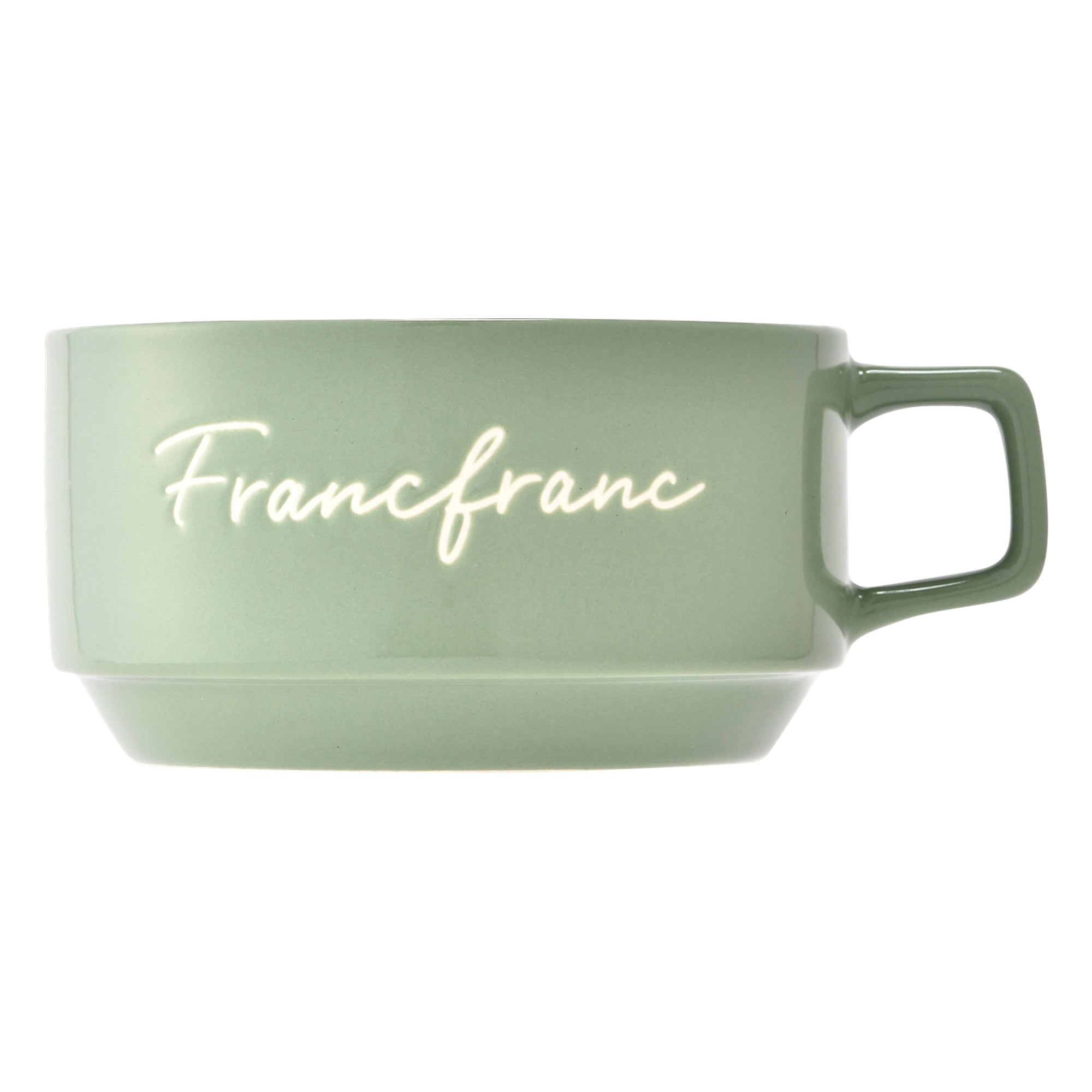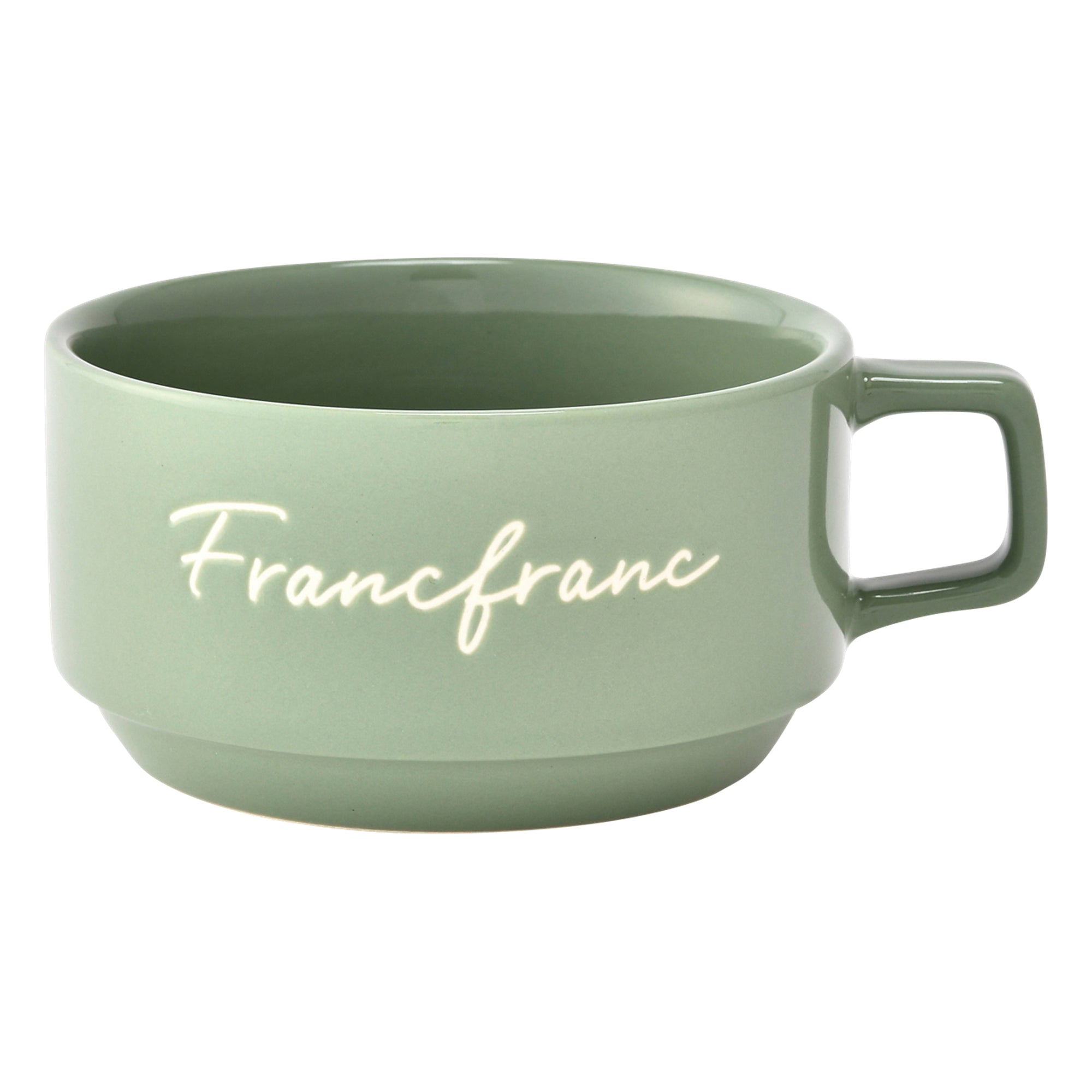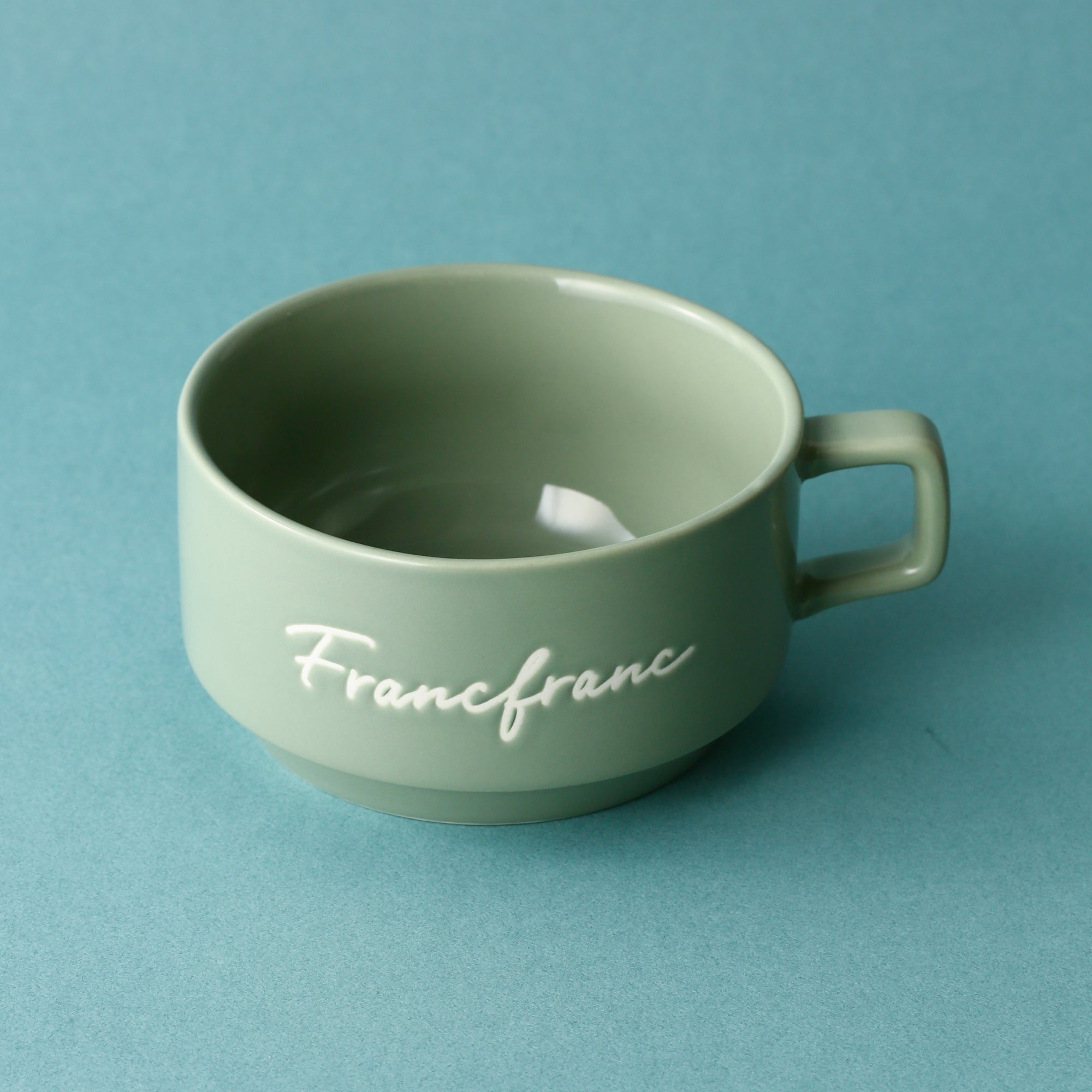 Franfrancの白抜きロゴがかわいい綺麗なカラーのスープカップです。色違いで集めたくなる綺麗なカラーを揃えました。気分やその日の食卓の雰囲気によってカラーを選ぶことができます。グリーンのカラーはリラックスの作用があり、穏やかな気持ちになります。電子レンジも使用できるので、スープが冷めてしまったらそのまま温め直しができます。食器洗浄機も対応で気軽に使えて便利です。毎日の食卓を華やかになります。容量は360mlと大きめなので、スープをたっぷり入れることができます。素材はストーンウェアを使用しているので、耐熱性がありオーブン可なのでグラタン皿としてもお使いいただけます。また耐水性があるので汚れがつきにくく、食材の匂いもつきにくいのです。適度に丸みを帯びた形もとっても持ちやすく、ぬくもりを感じる落ち着いた質感と丈夫さも魅力です。取っ手がついているので持ちやすいです。使い心地が抜群で、毎日食卓に並べたくなります。スタッキング可能で収納にも便利です。淡い色合いで、並べてあるだけでも可愛いです。