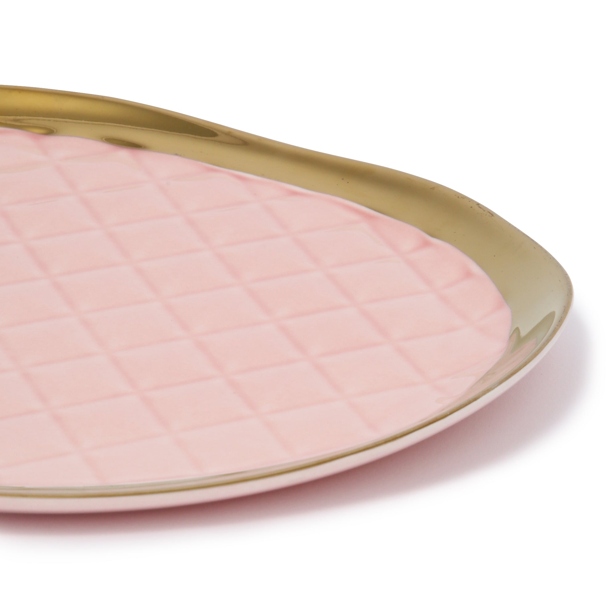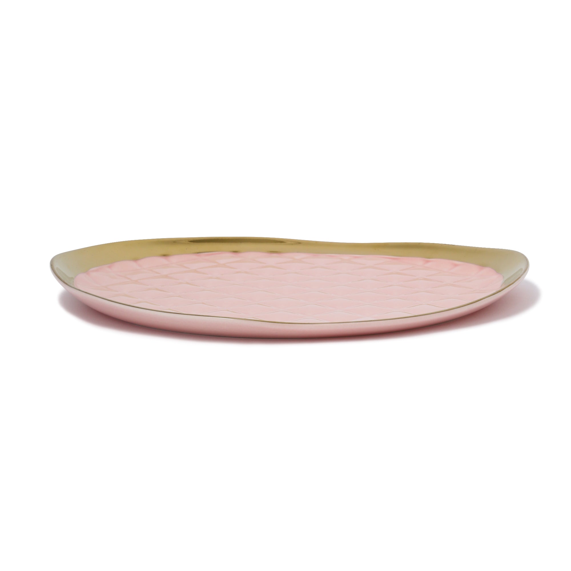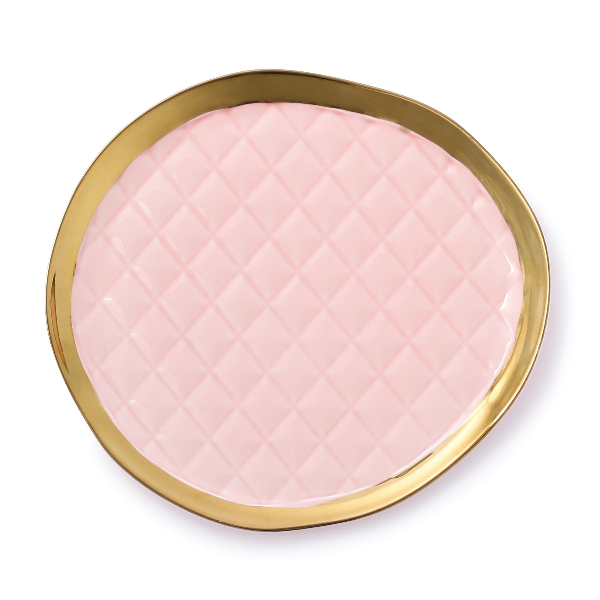 キルティングをイメージした凹凸と、幅広のゴールドリムが華やかなプレートです。シンプルなプレートや小鉢を載せていただいても上品にコーディネートいただけます。