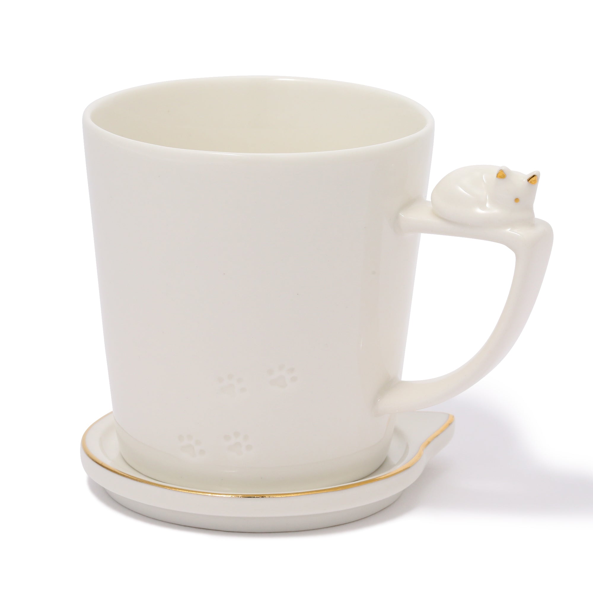 ハンドルにねこのモチーフをあしらったたまらなくかわいいマグです。色によってねこのポーズが異なるので色違いで集めていただくと楽しいアイテムです。マグ前面には足跡のエンボス付き。猫の顔型の蓋がついていて、ティーバッグを乗せたりコースターとしてもお使いいただけます。長時間飲まない時はフタでホコリの侵入も防いでくれます。箱入りでギフトにもおすすめです。