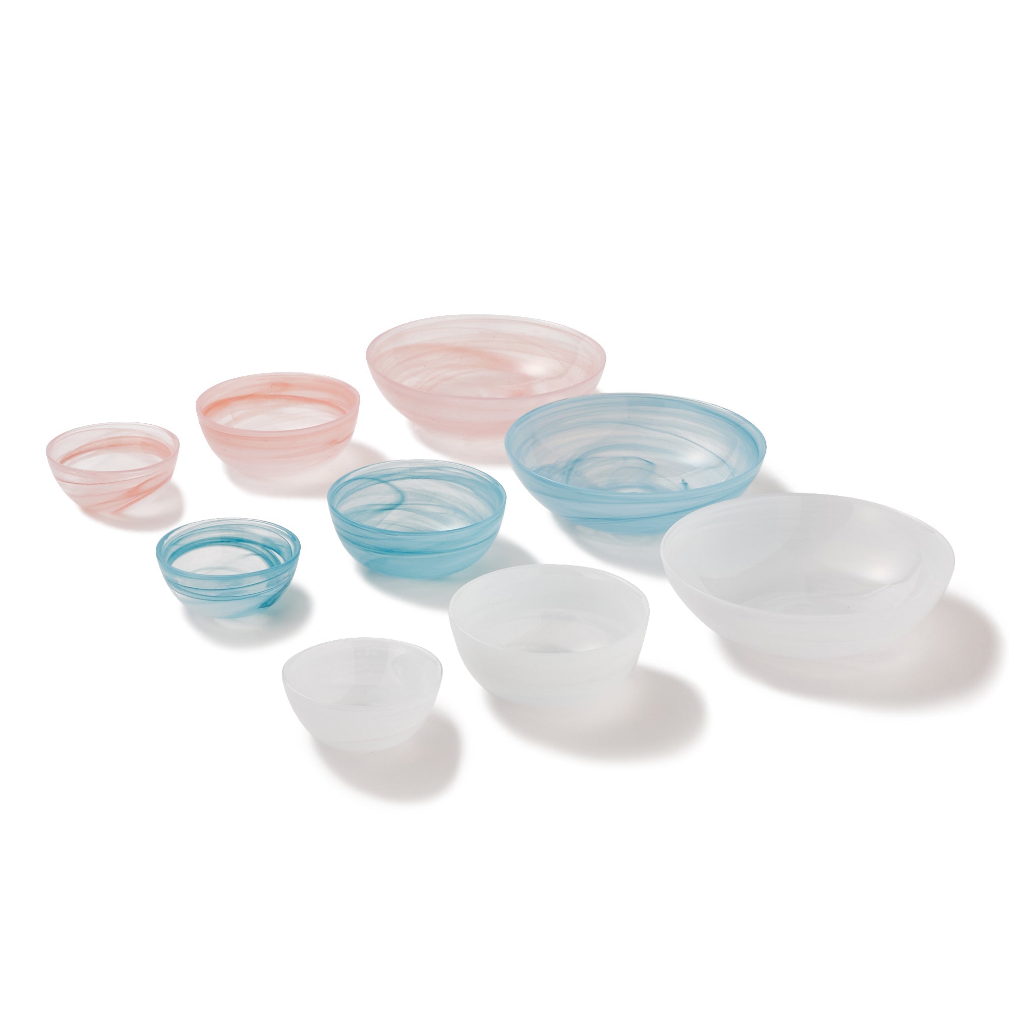 あめ細工のような美しいマーブル模様が奥行きのある涼しげなボウルです。ミルキーカラーで描かれたひとつひとつ異なるハンドメイドの味わいのある模様が特徴。夏の麺食卓につゆ鉢や薬味入れとして、またフルーツやアイスクリームなどのデザートボウルとしても適したサイズです。