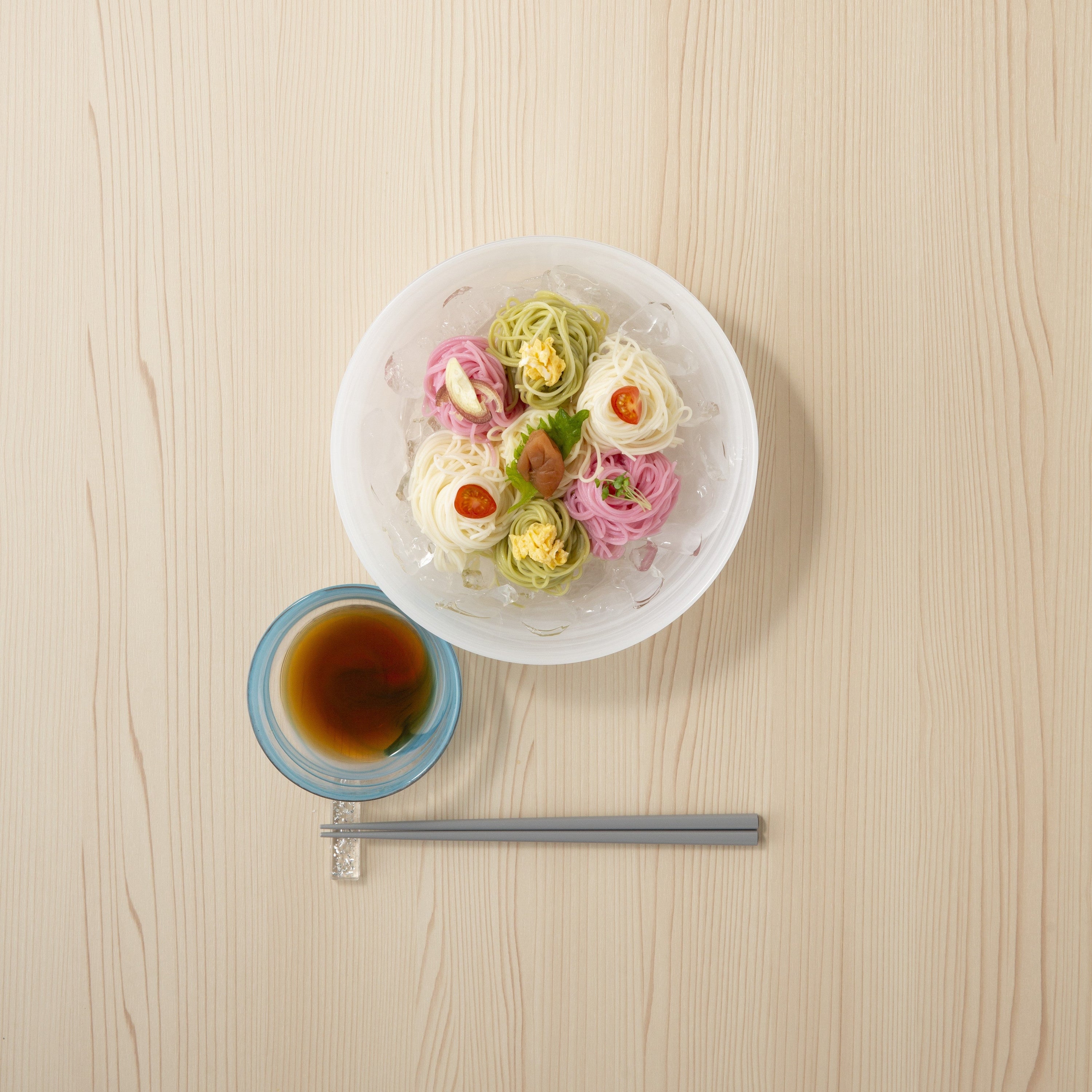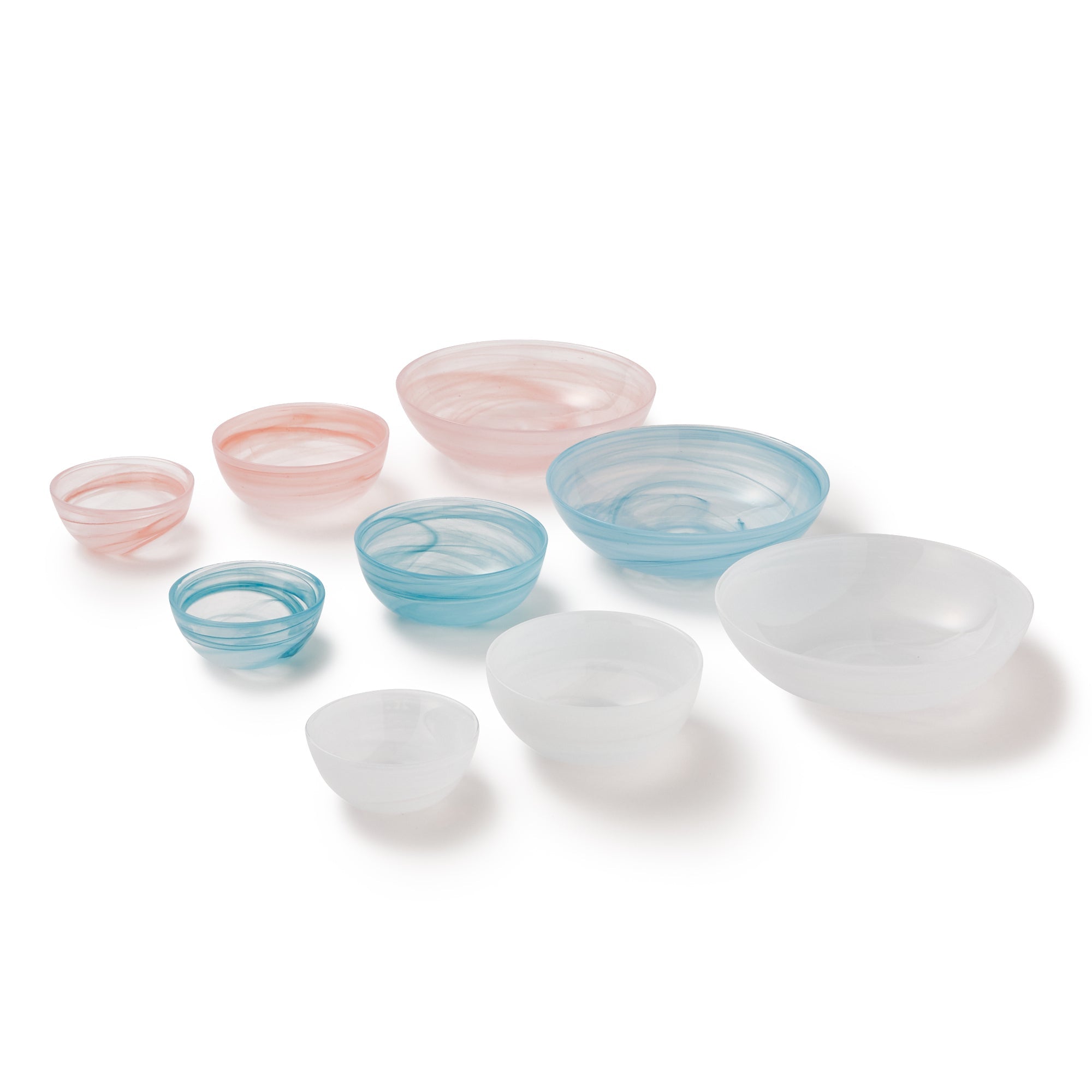 あめ細工のような美しいマーブル模様が奥行きのある涼しげなボウルです。ミルキーカラーで描かれたひとつひとつ異なるハンドメイドの味わいのある模様が特徴。夏の麺皿として素麺、うどんはもちろん冷製パスタなどにも適しています。