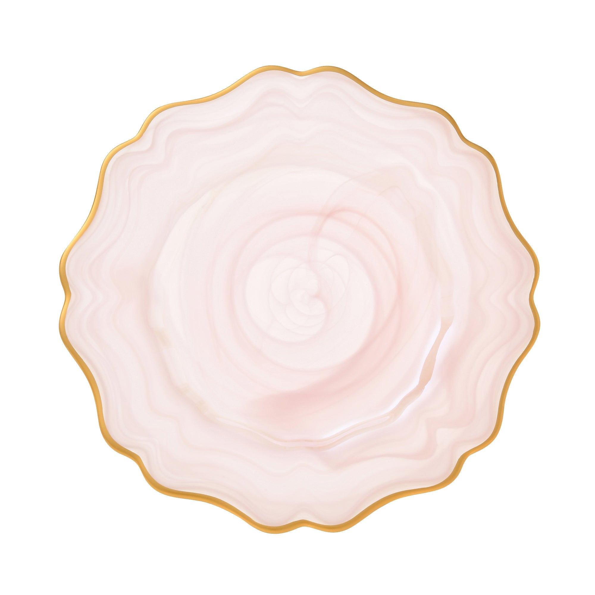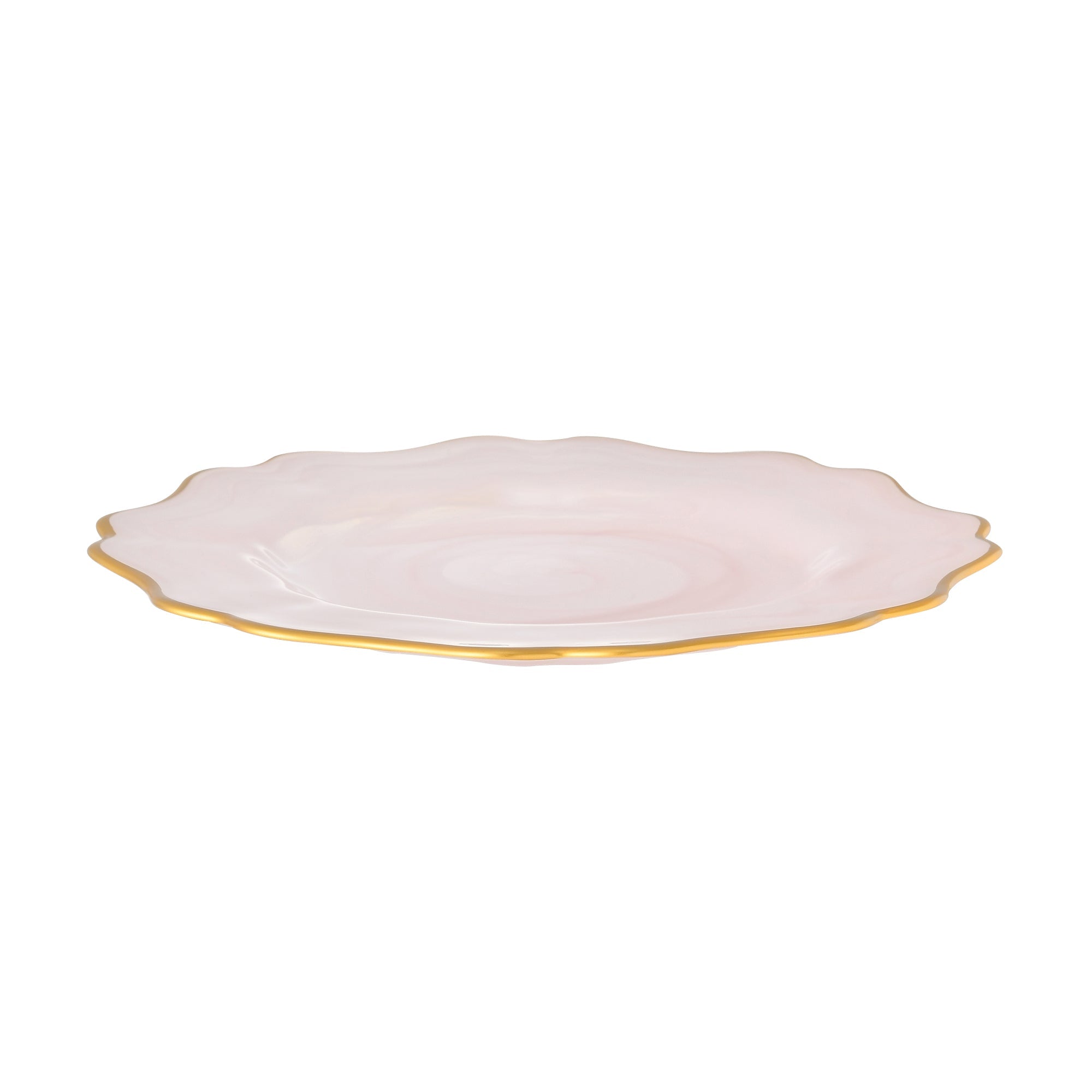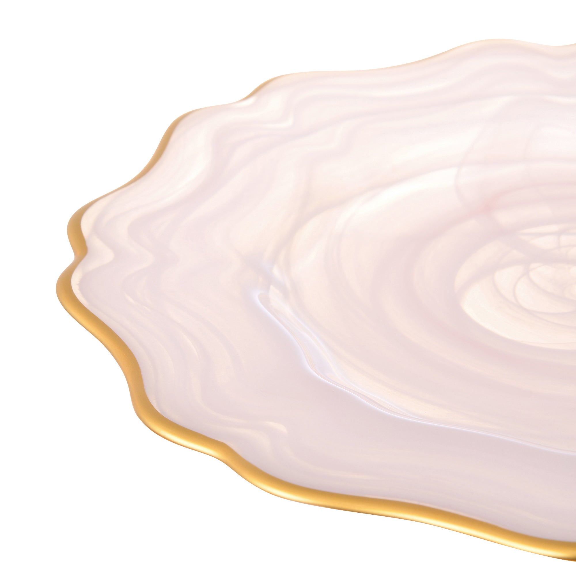 あめ細工のようなマーブル模様が美しいガラスプレートです。優しいミルキーカラーで描かれた味わいのあるハンドメイドのラインが清涼感たっぷり。オパール加工を施して奥行きのある涼しげな佇まいに仕上げました。普段使いから、おもてなしまで幅広くご使用いただけます。優しいピンクの色合いのとゴールドのリムがスイーツやお料理をより素敵に引き立たせてくれます。パーティーシーンにも活躍する大き目サイズです。ゴールドのリムが華やさをプラスして、夏の食卓をおいしくおしゃれに盛り上げます。同シリーズで揃えることで、より写真映えする華やかな食卓になります。清涼感のあるデザインで、素敵なテーブルコーディネートをお楽しみ下さい。