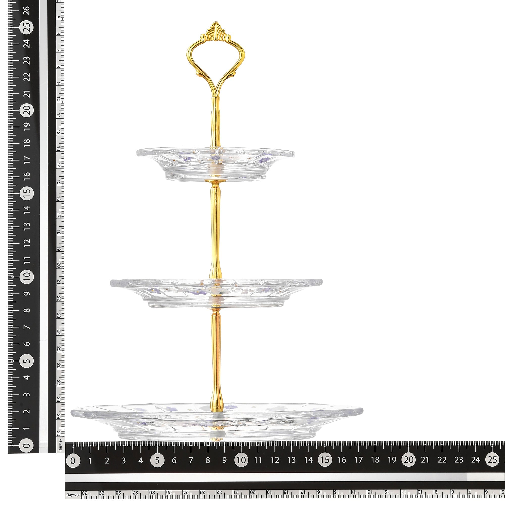 お店でティータイムを楽しんでいる気分になれる、3段ケーキスタンドです。ゴシックなゴールドの支柱にフリル形状の上品なガラスプレートを3段に重ね、花柄のデザインを施しました。ケーキだけでなくパンやフルーツ、軽食を盛り付けてもお洒落。きらきらと光を乱反射してくれるフリルカットのプレートは、朝・昼・夜で全く違う表情を見せてくれます。朝のモーニングコーヒーに、午後のアフタヌーンティー、夕食後のリラックスタイムまで素敵に演出します。同シリーズのカップ&ソーサーやティーポットと一緒に並べて使うのもおすすめです。
