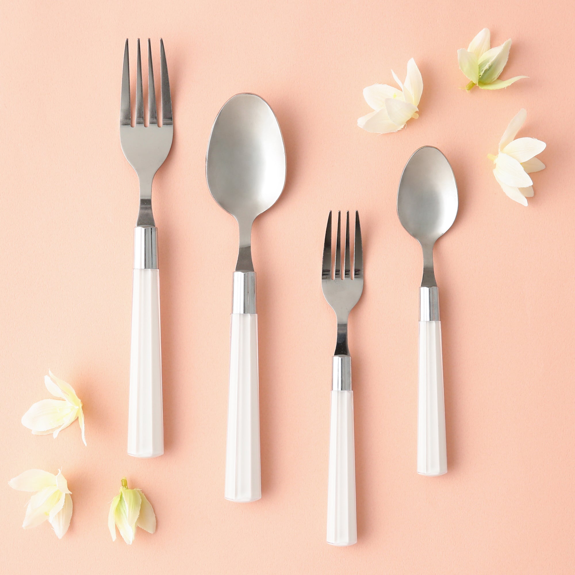ディナースプーン、フォーク、ティースプーン、ケーキフォークが2本ずつはいったカトラリーセットです。爽やかなカラーと、大人可愛いデザインが食卓を彩ってくれます。ハンドル部分は2層になっていて透明感のある陰影が美しいデザイン。新生活をはじめる方への贈り物におすすめです。可愛いデザインとカラーで、使う度キュンとするカトラリーです。シンプルなカラーなので、どんな食器にも合わせやすいです。