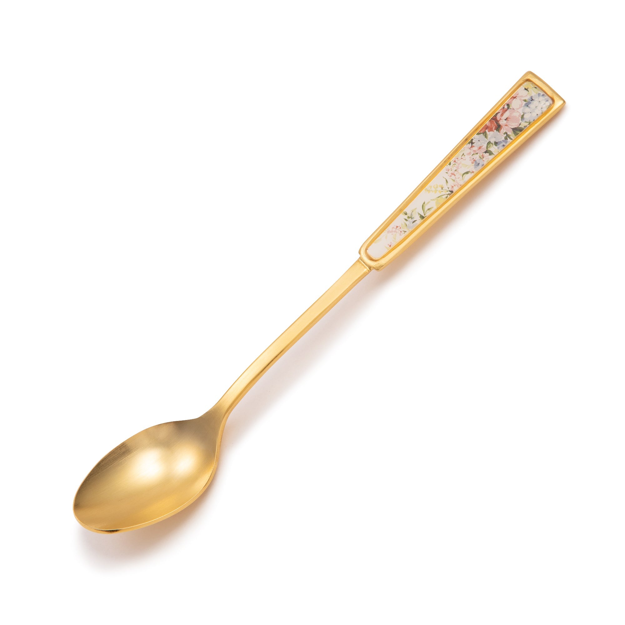どんな食器ともなじみよくお使いいただける上品なマットゴールド仕上げのティースプーンです。ハンドルに埋め込まれた鮮やかな絵柄が、ティータイムを華やかに彩ります。