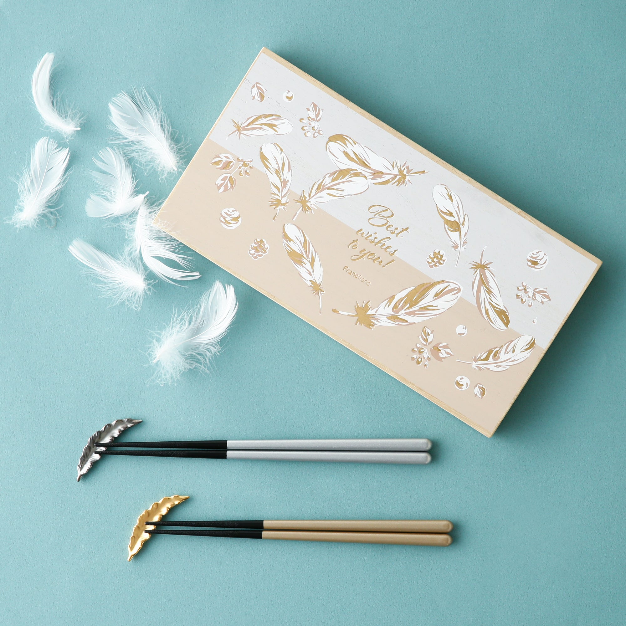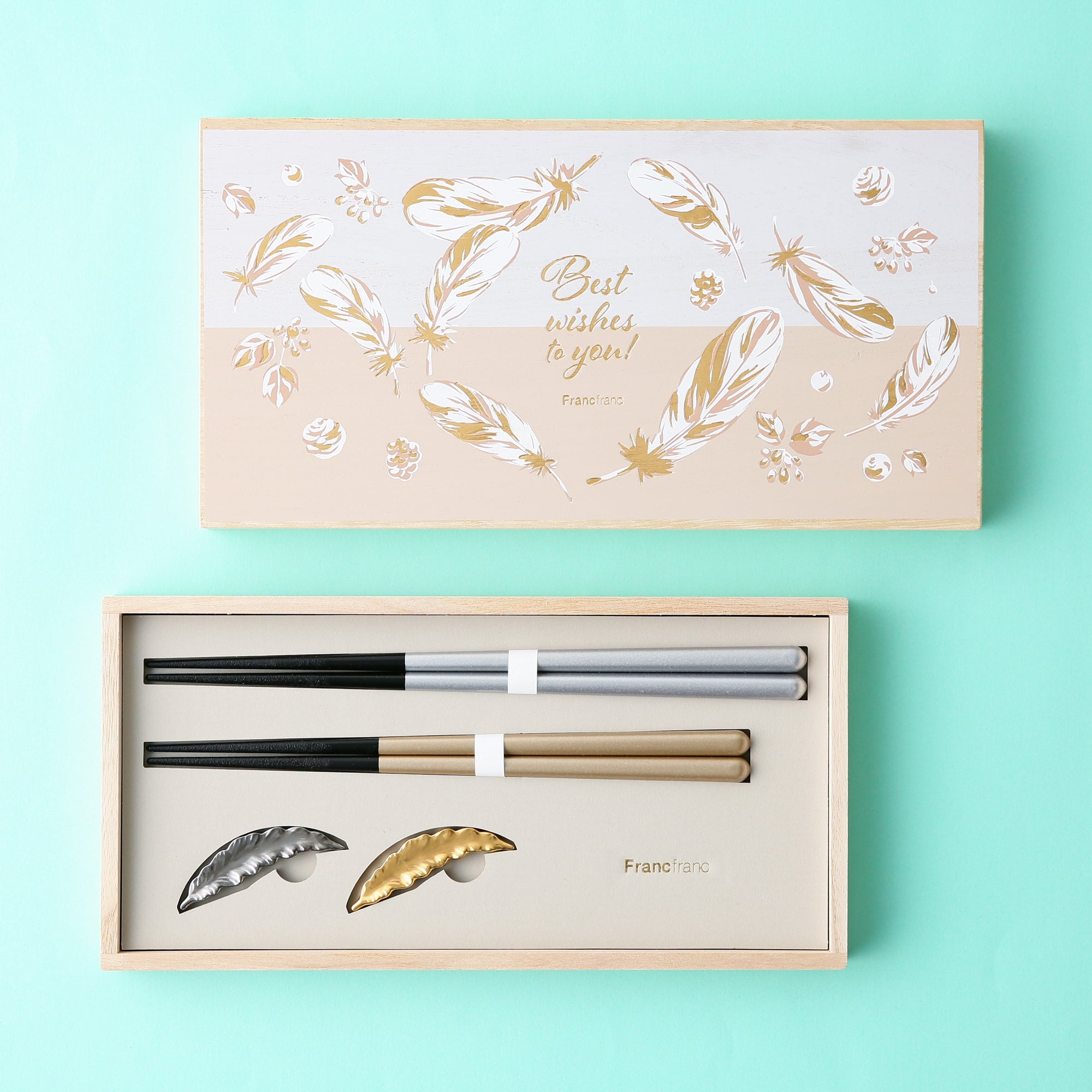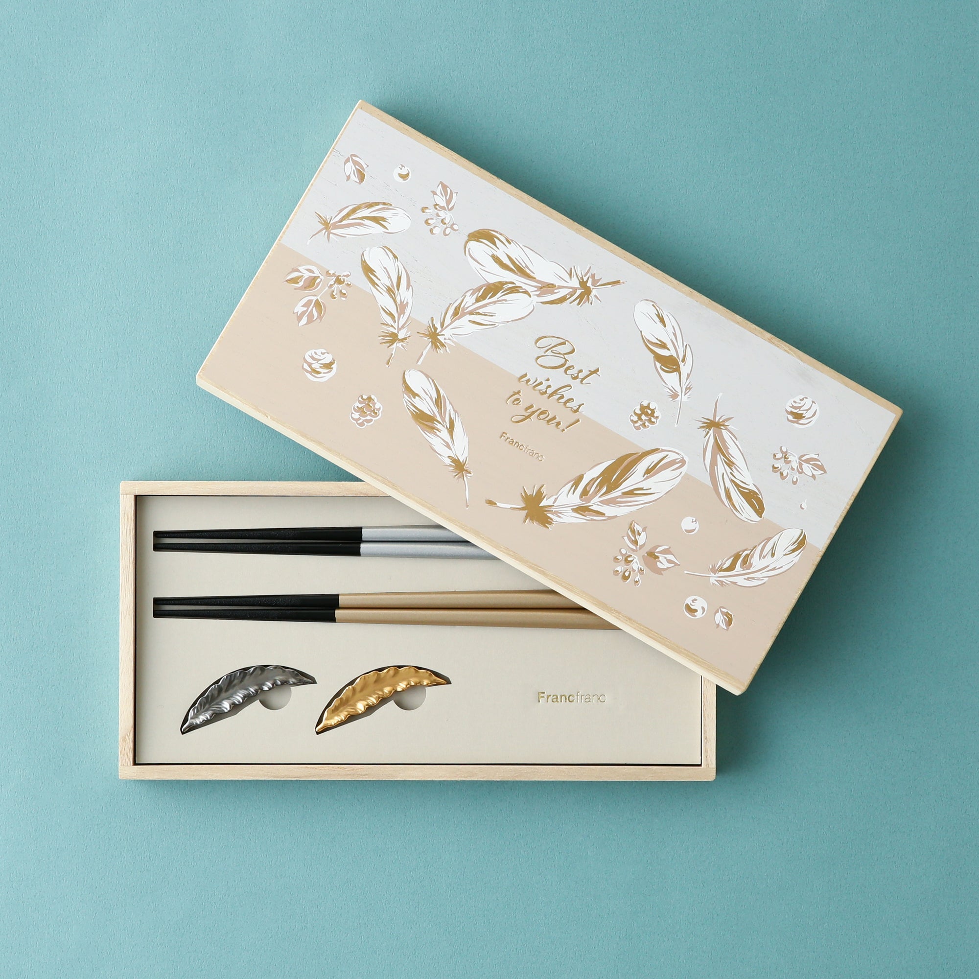 シンプルで上品なカラーリングでカジュアルにもフォーマルにも使いやすい、箸・箸置きがそれぞれペアになったギフトです。贈る方に合わせて選んでいただけるよう、3テイストご用意しました。お箸は食器洗浄機使用可能です。華やかな全面デザインの桐箱は中の仕切りを取り外すこともでき、多様なリユースが可能です。