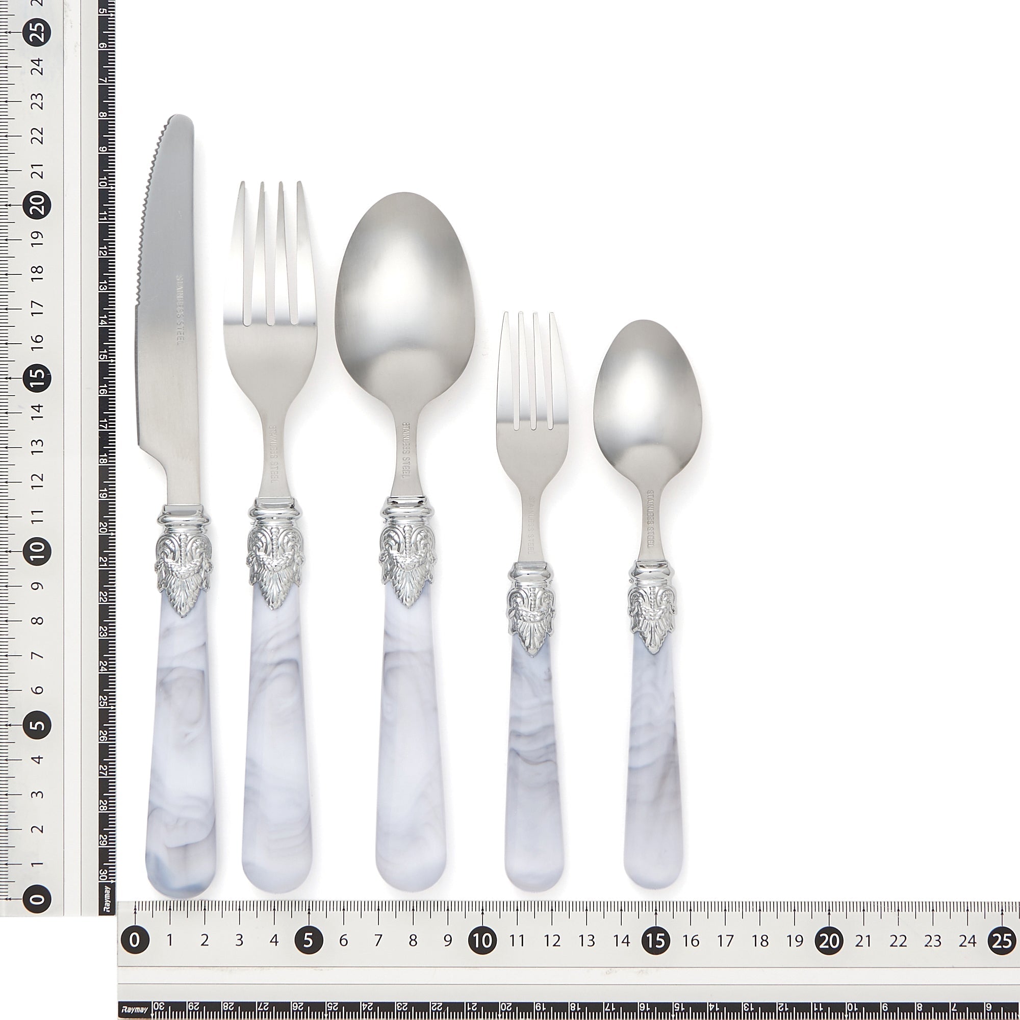 一人暮らし、二人暮らしの新生活におすすめのカトラリーセットです。ディナースプーン、フォーク、ナイフ、ティースプーン、ケーキフォークが各2点入っています。ハンドル部分に装飾を施したエレガントで特別感あふれるデザインです。普段の食卓をぐっと大人っぽく華やかに彩ります。