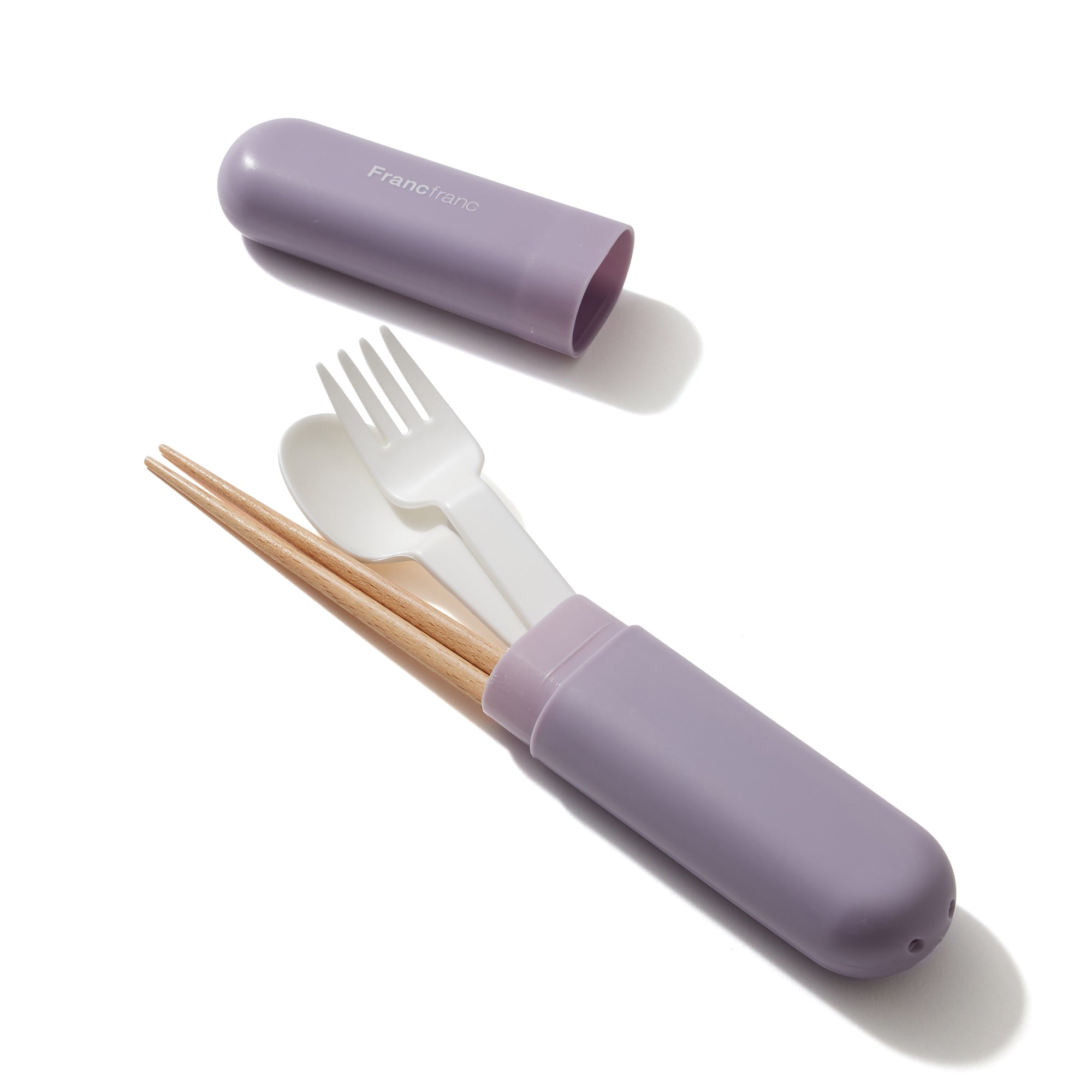 箸、スプーン、フォークがセットになった、軽くて持ち運びやすいカトラリーセットです。原料樹脂の一部に植物由来のバイオマスプラスチックを添加して環境問題にも配慮しています。