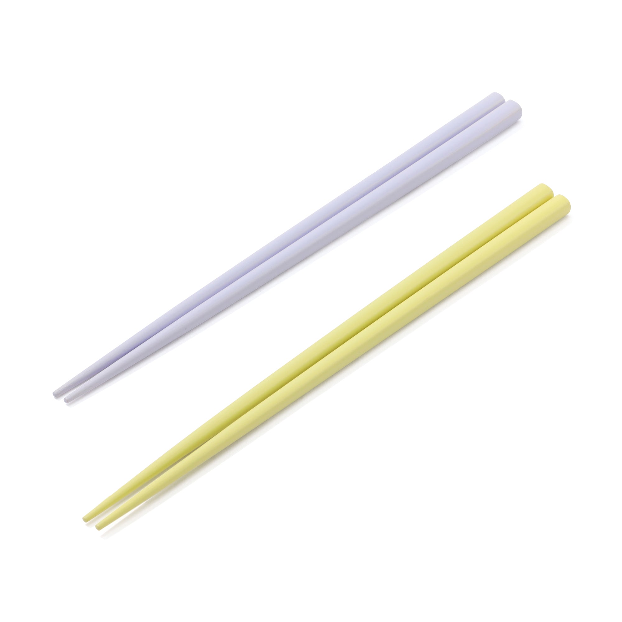 カラフルな2色セットのお箸です。食器や箸置きなどとトータルコーディネートを楽しめるかわいいカラー。新生活を始める方におすすめです。日本製で、食器洗浄機も使用可能です。