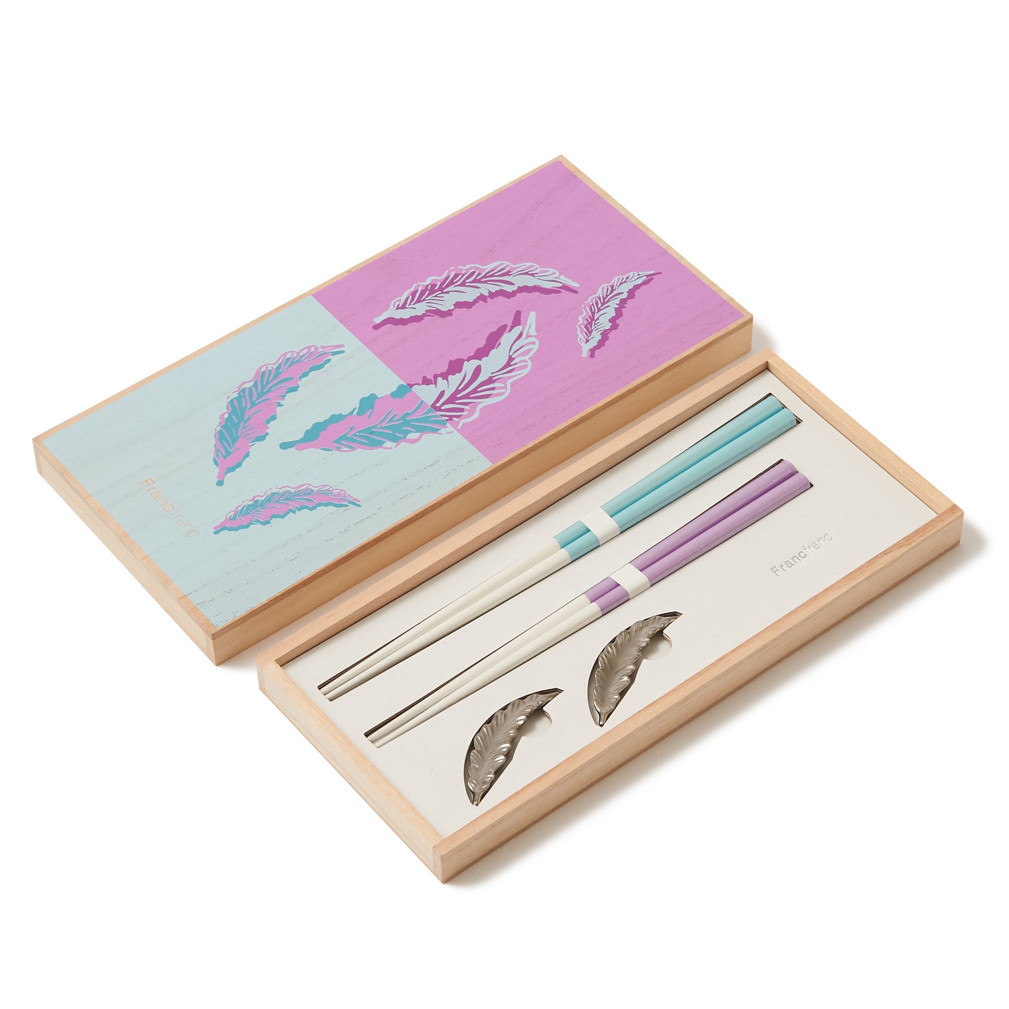 華やかなデザインの桐箱に、ペアの箸と箸置きをセットにしたギフトアイテムです。箸の先には滑り止め機能がつき、食器洗浄機も利用可能です。シンプルなカラーリングのデザインを全面印刷で施した桐箱は、ブライダルギフトにぴったりです。中の台紙は取り外すことができ、多様なリユースも可能。