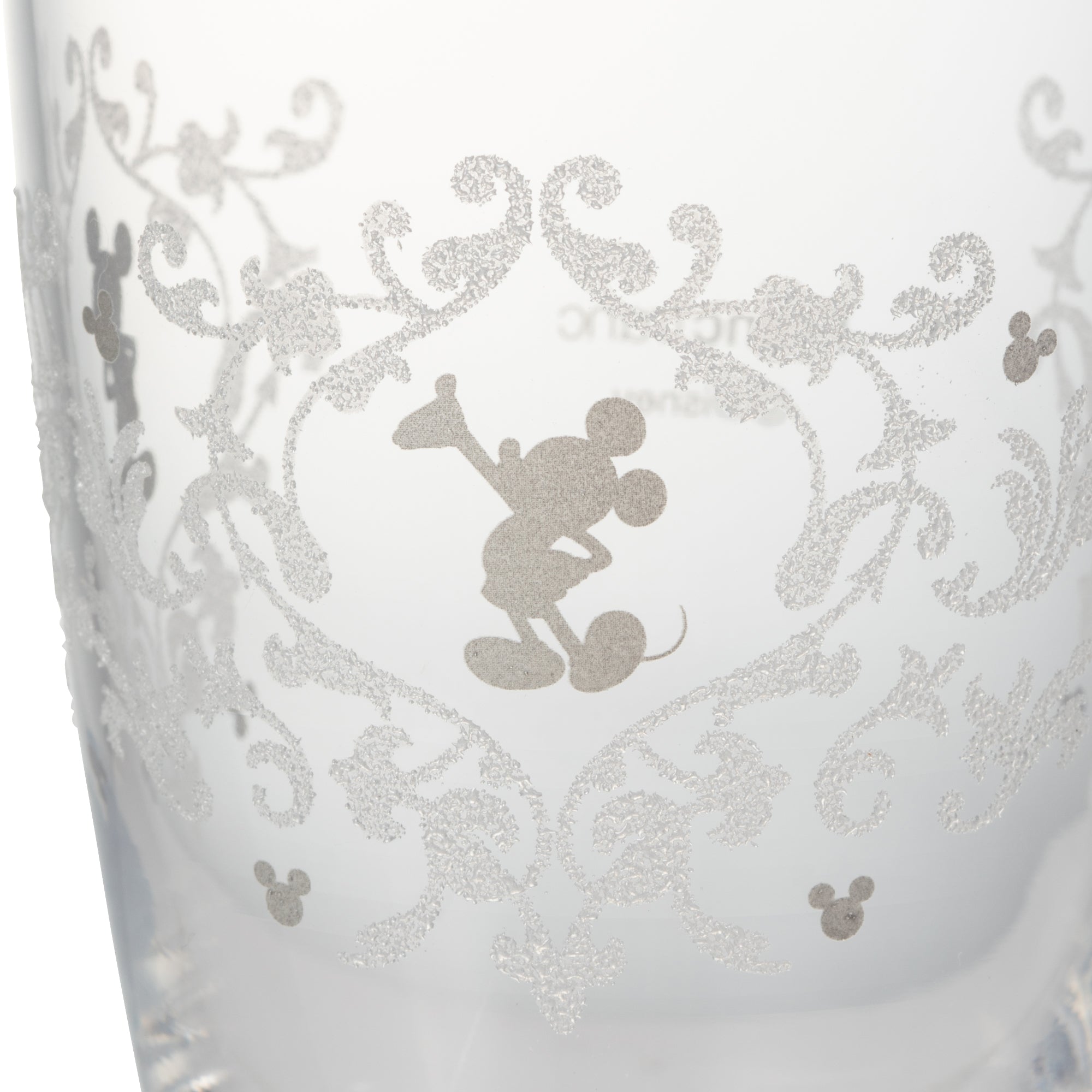 キラキラ輝くアラベスク柄の中にミッキーのシルエットをデザインしたガラスタンブラーです。クリンカー加工という、ビーズ状の細かいガラス粒をグラスの表面に焼き付ける手の込んだ技法で柄を表現しました。立体的な模様の触りごこちもお楽しみください。