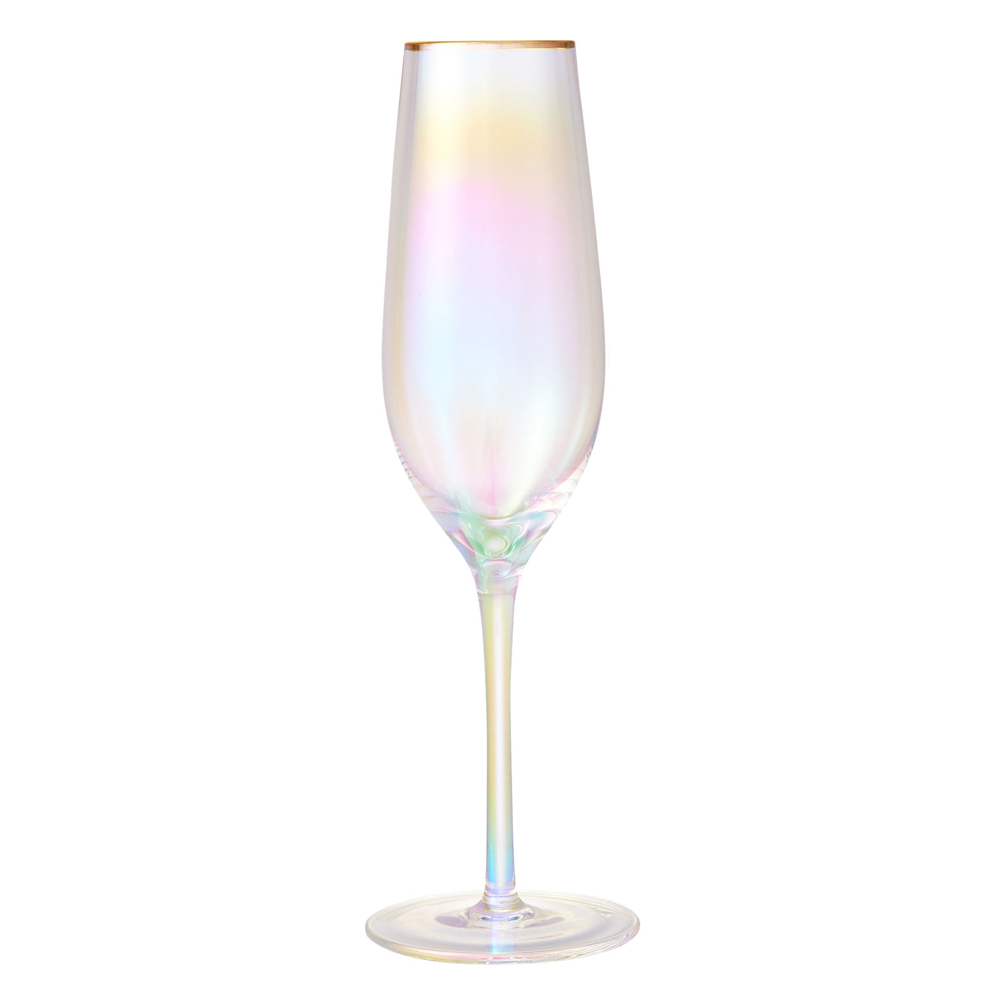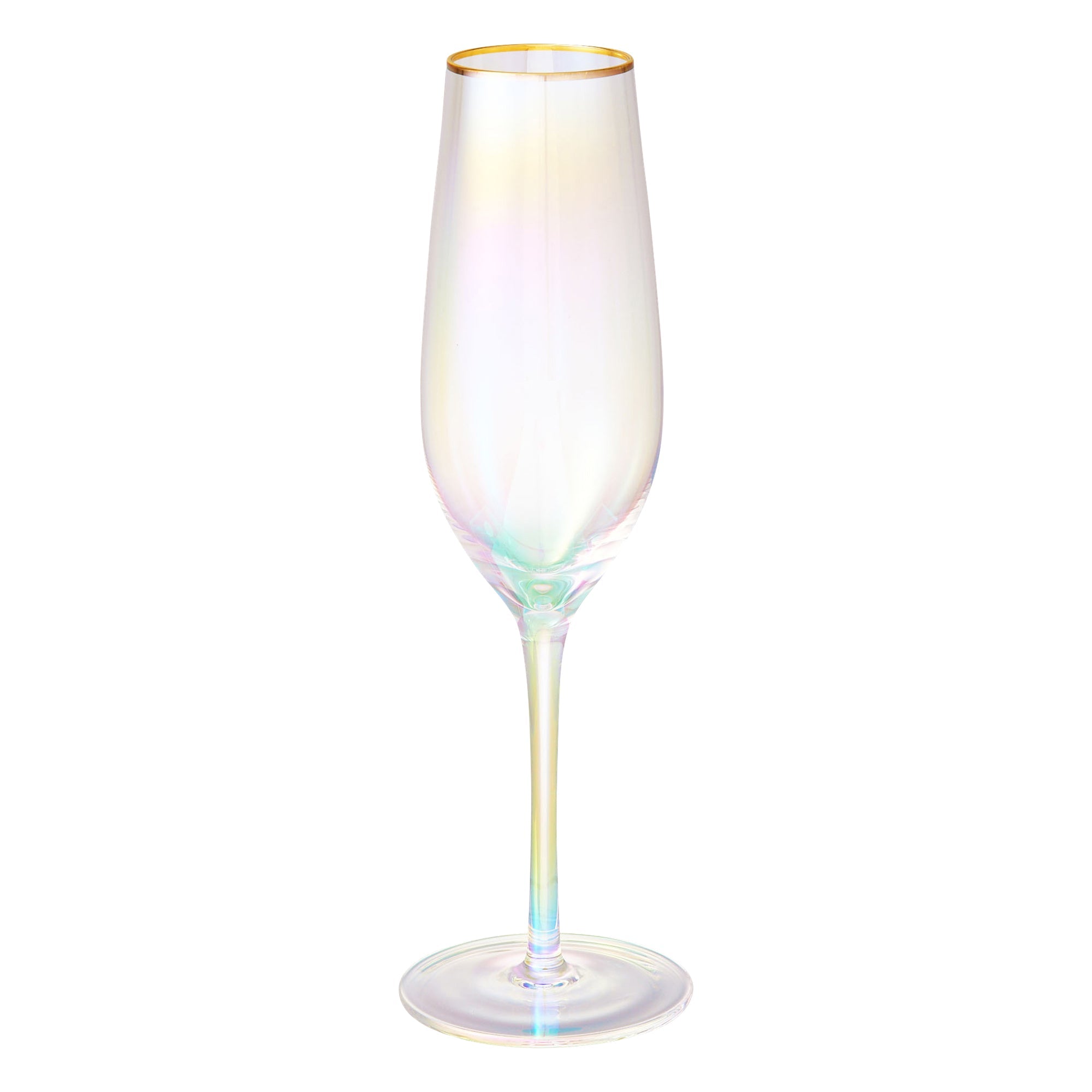 オーロラのような変化のある光沢が食卓に華を添えてくれるシャンパングラスです。シャンパンは210ml注ぐことができ、シャンパングラスとして一般的な容量です。ゴージャス感のあるゴールドラインをあしらい全体を引き締めた大人なデザイン。グラスが揺れるたび、ピンク・黄色・水色などの美しい色たちが手元を彩ります。つい光にかざして色の移り変わりを眺めたくなってしまいますね。普段の食卓はもちろん、パーティーなどお客様をお招きした時にもおすすめです。華やかなグラスは、お客様の気分を上げてくれることでしょう。オパールのグラスに合わせ、シェルの形のアイテムをそろえると、テーマ性のあるテーブルコーディネートができるのでお試しください。お酒が苦手な方は、アイスティーを注いだシャンパンティーはいかがでしょうか。紅茶と炭酸でわって作るシャンパンティーは、お酒を飲んでる気分にさせてくれます。ドリンク以外にも、ゼリーやシャーベットなどを盛り付ける器に使ってもおしゃれ。すずしげなデザートと、透明感のあるグラスは相性抜群です。同じデザインのワイングラスもあります。シャンパングラスと並べて飾りたくなりますね。おしゃれなグラスは、ギフトにもぴったりです。お酒が好きな方や、オーロラアイテムが好きな方に喜ばれることでしょう。