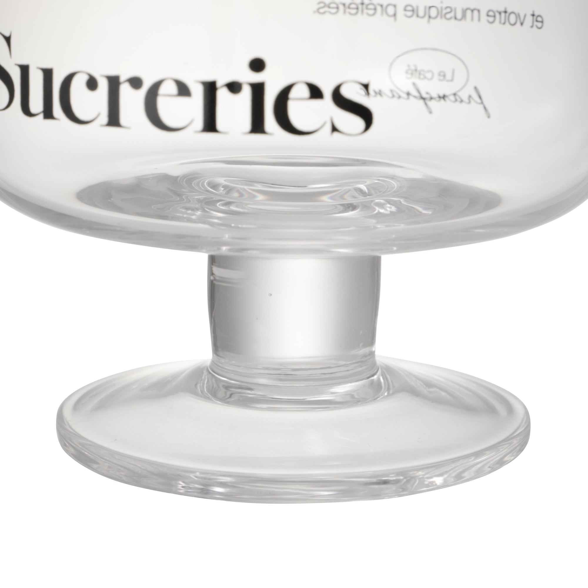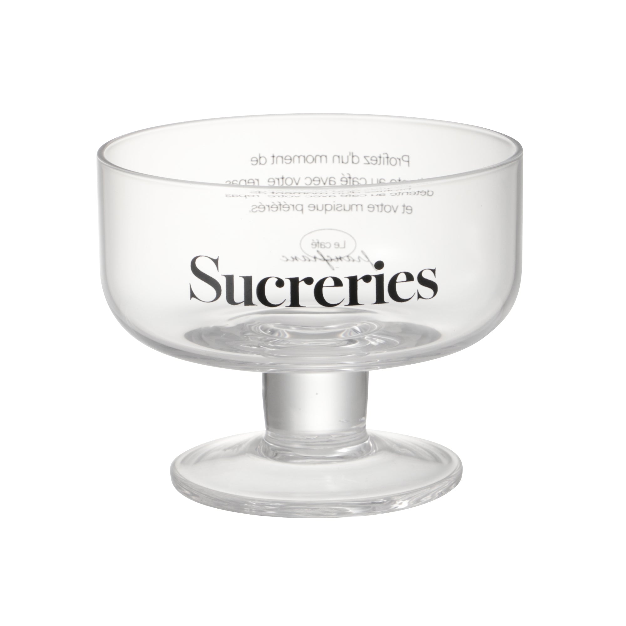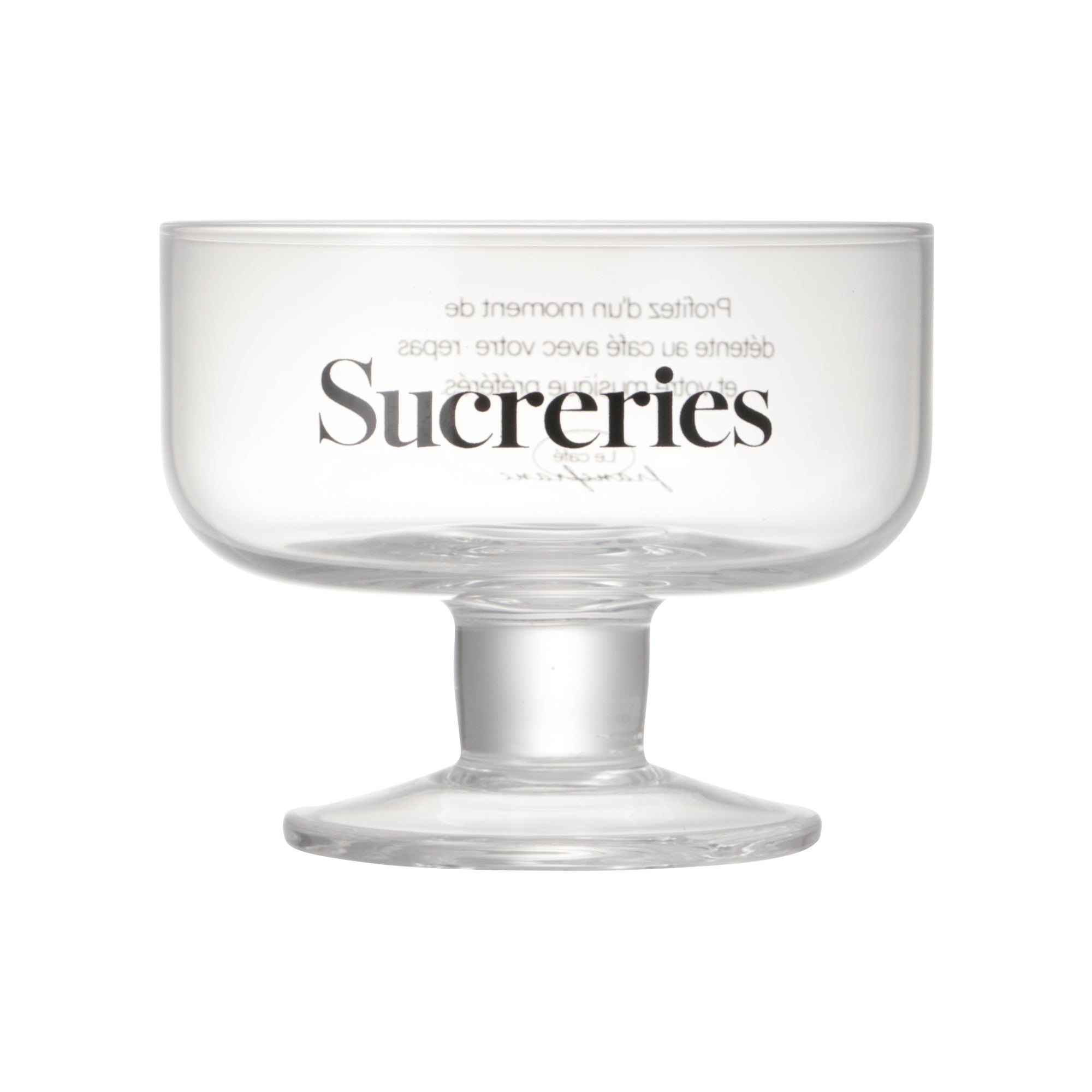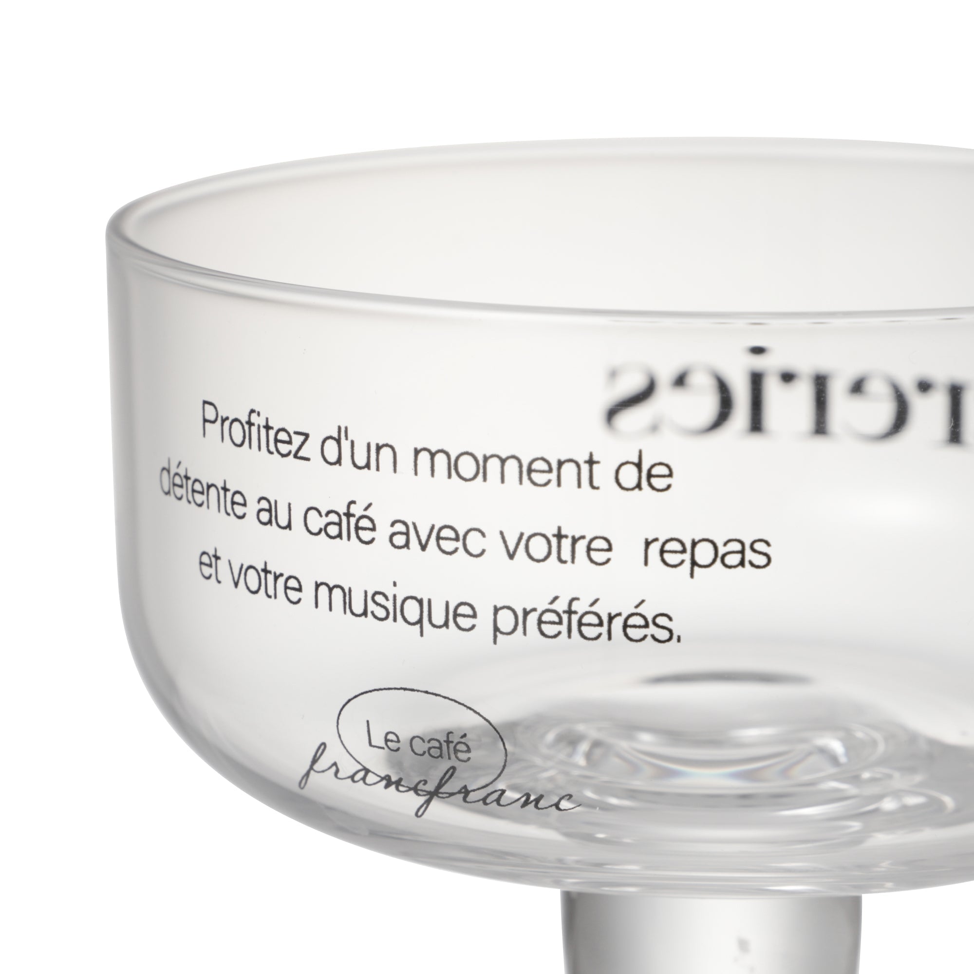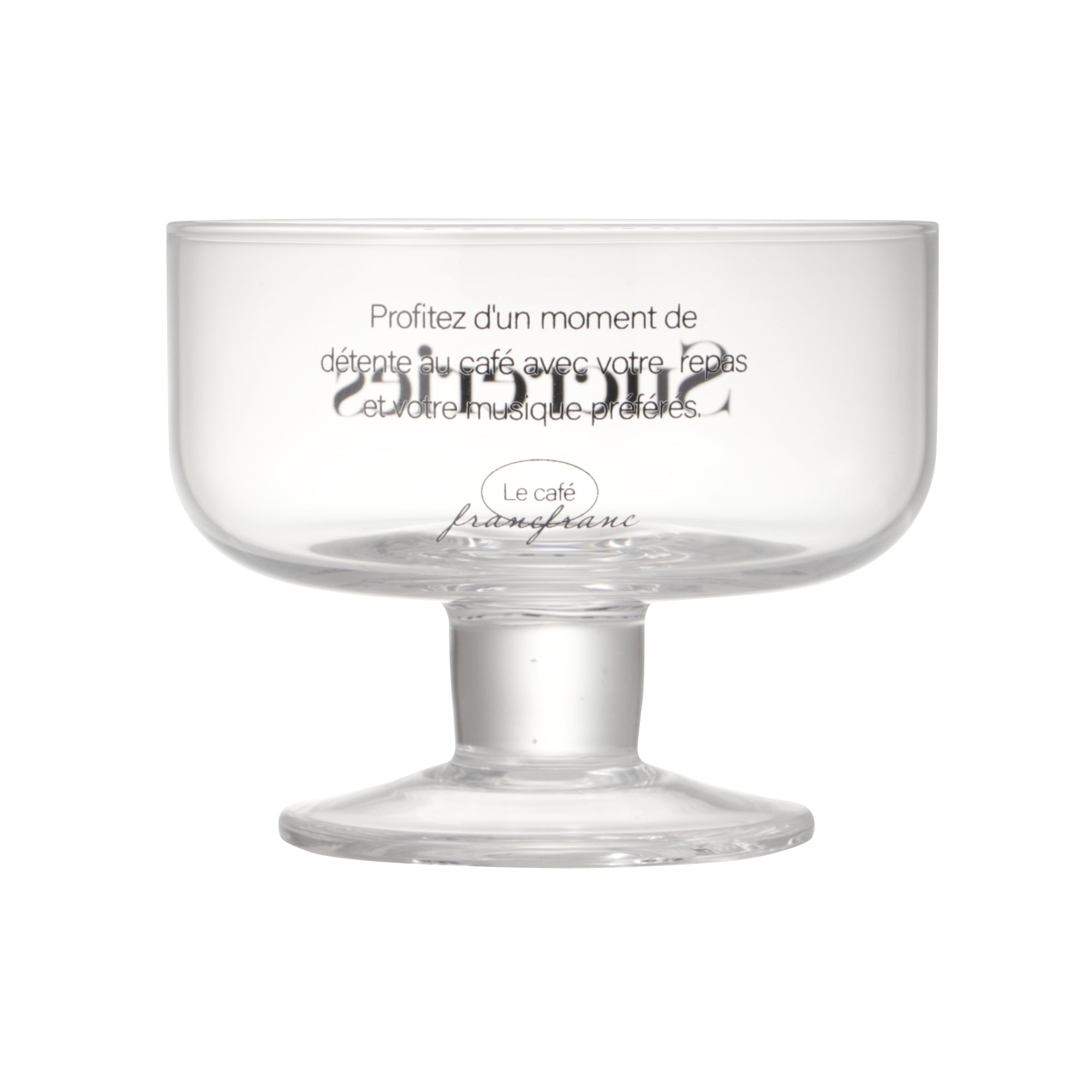 おしゃれなカフェでティータイムを過ごしているような気分になれるデザートグラスです。 エレガントさがある華奢なフォントを使用し、脚は太く短めでかわいらしいです。 家にいながらおしゃれカフェのようなティータイムをお過ごしください。