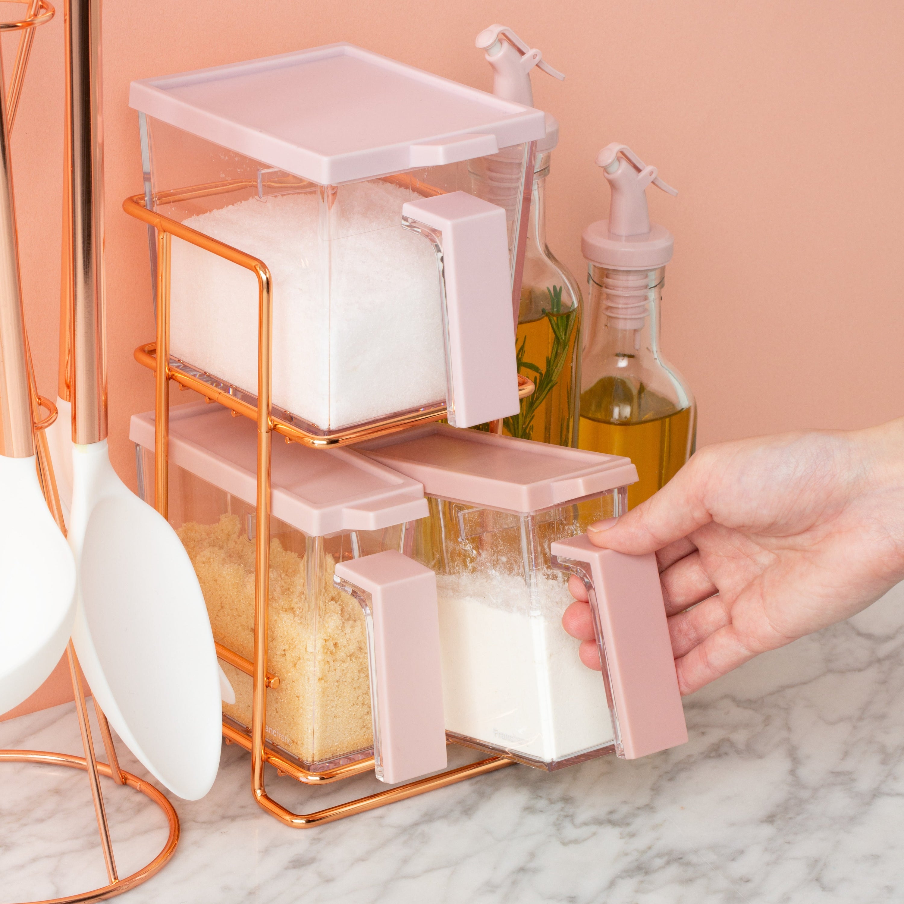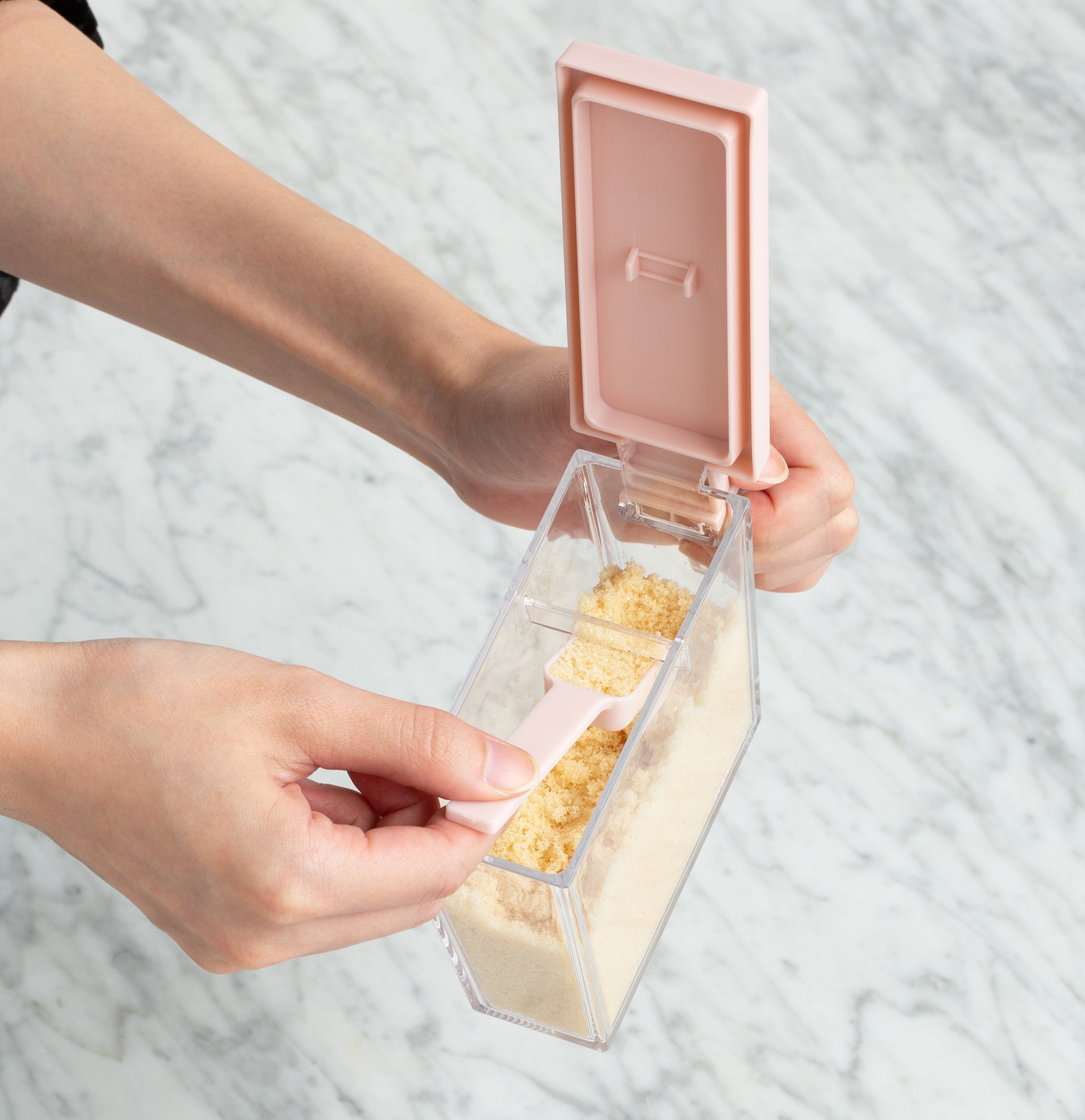 キッチンラックとクッキングコンテナ(Lサイズ1つ、Sサイズが2つ)がセットになったスターターセットです。省スペースなキッチンでも使えるように幅をスリムにしました。コンテナの色で調味料が見分けられるように3点すべて異なるグラデーションのような色の組み合わせになっており、シンプルながらも華やかな印象になるキッチンツールです。コンテナの内側には専用のスプーンとすりきり用の板があります。計量しやすく、付属のスプーンも収納できるので、失くす心配もありません。
