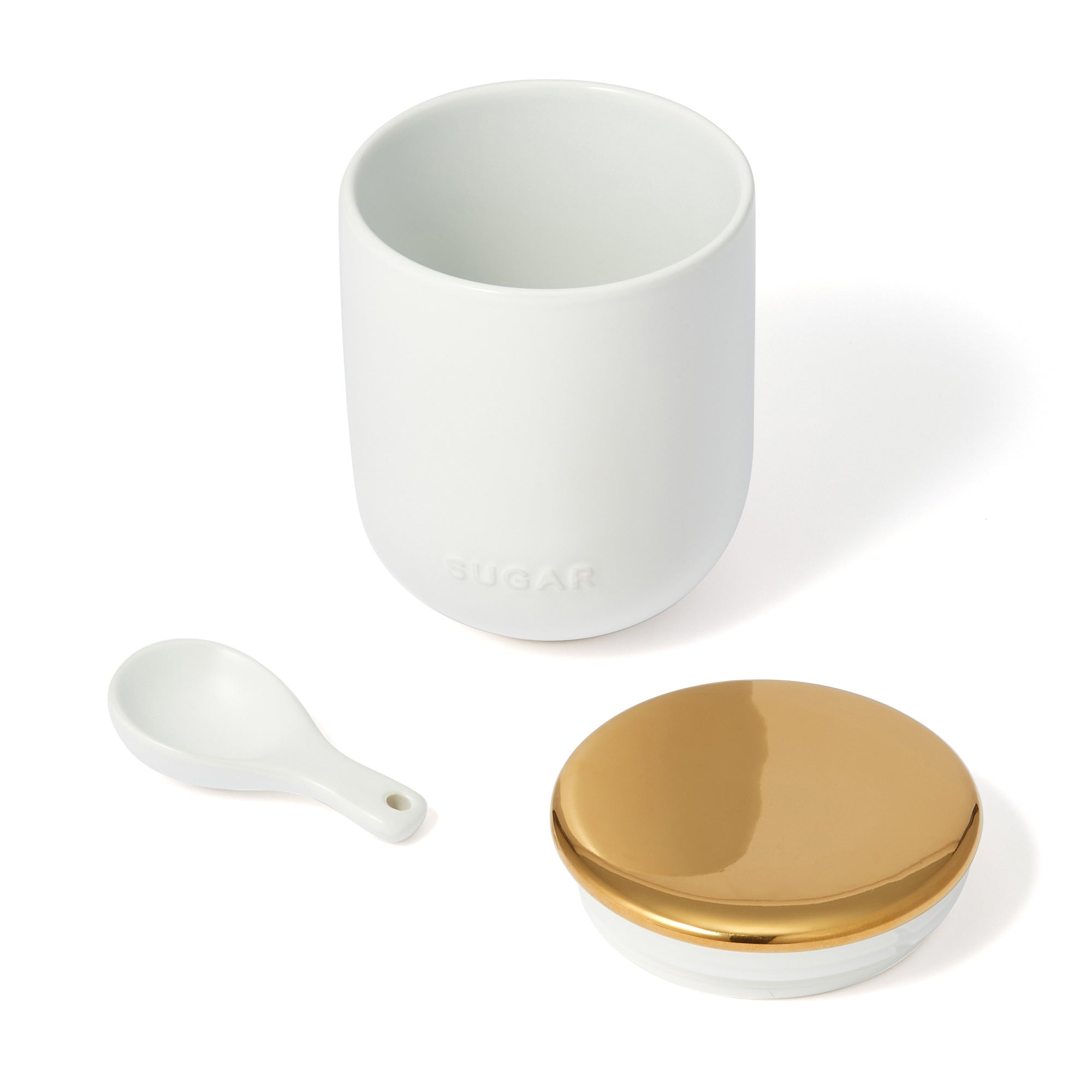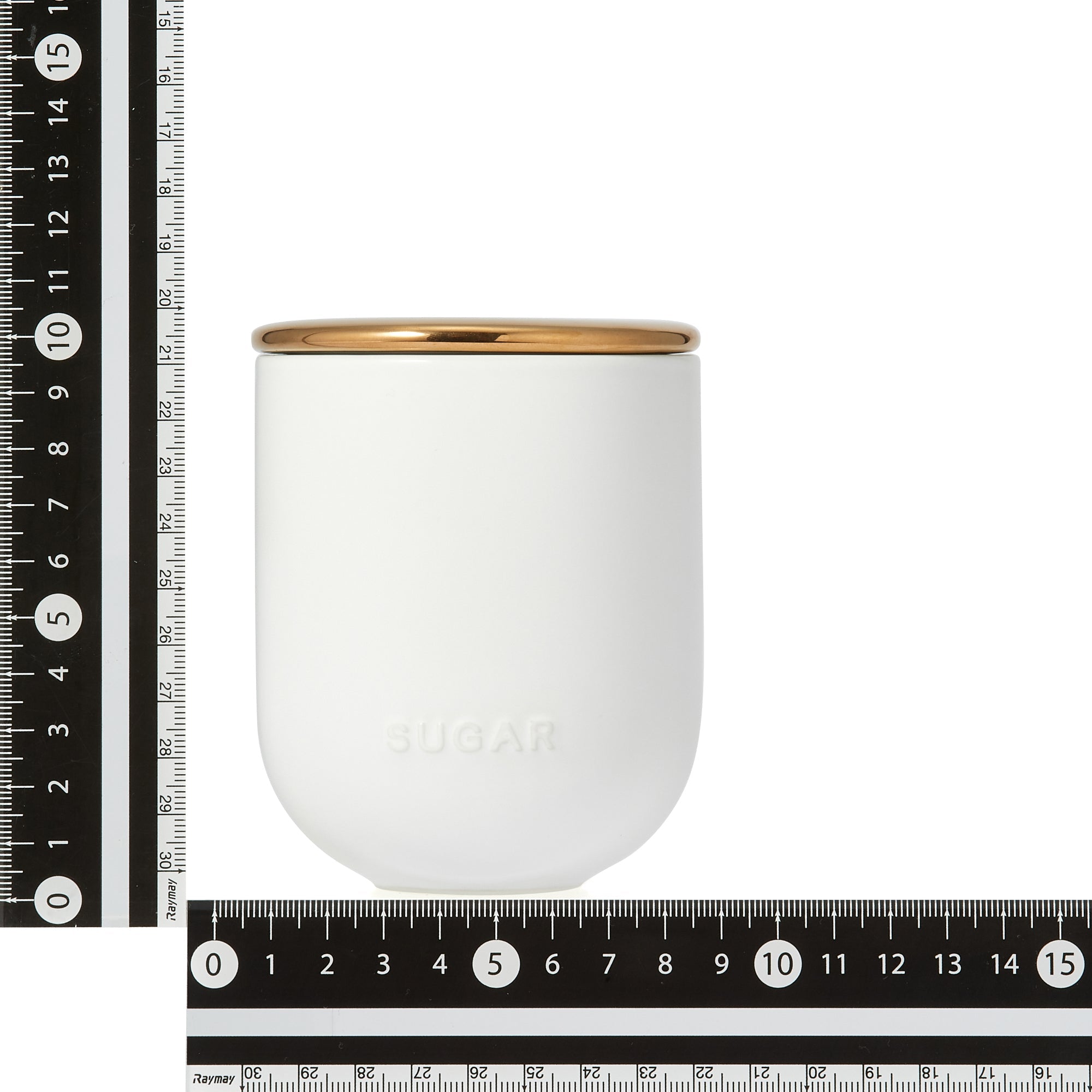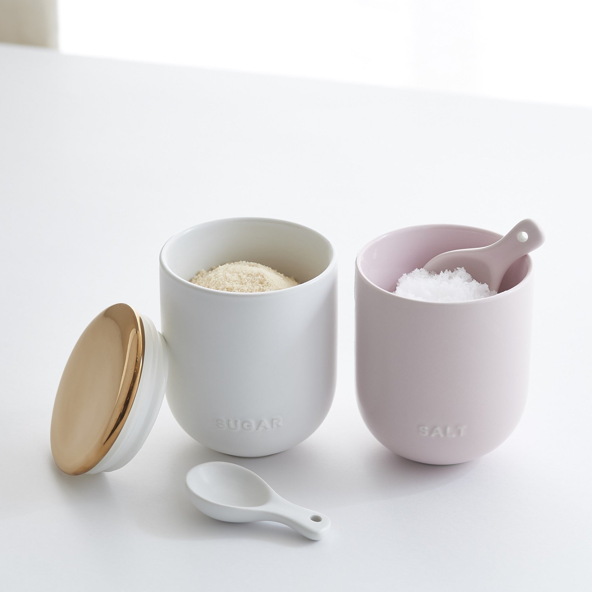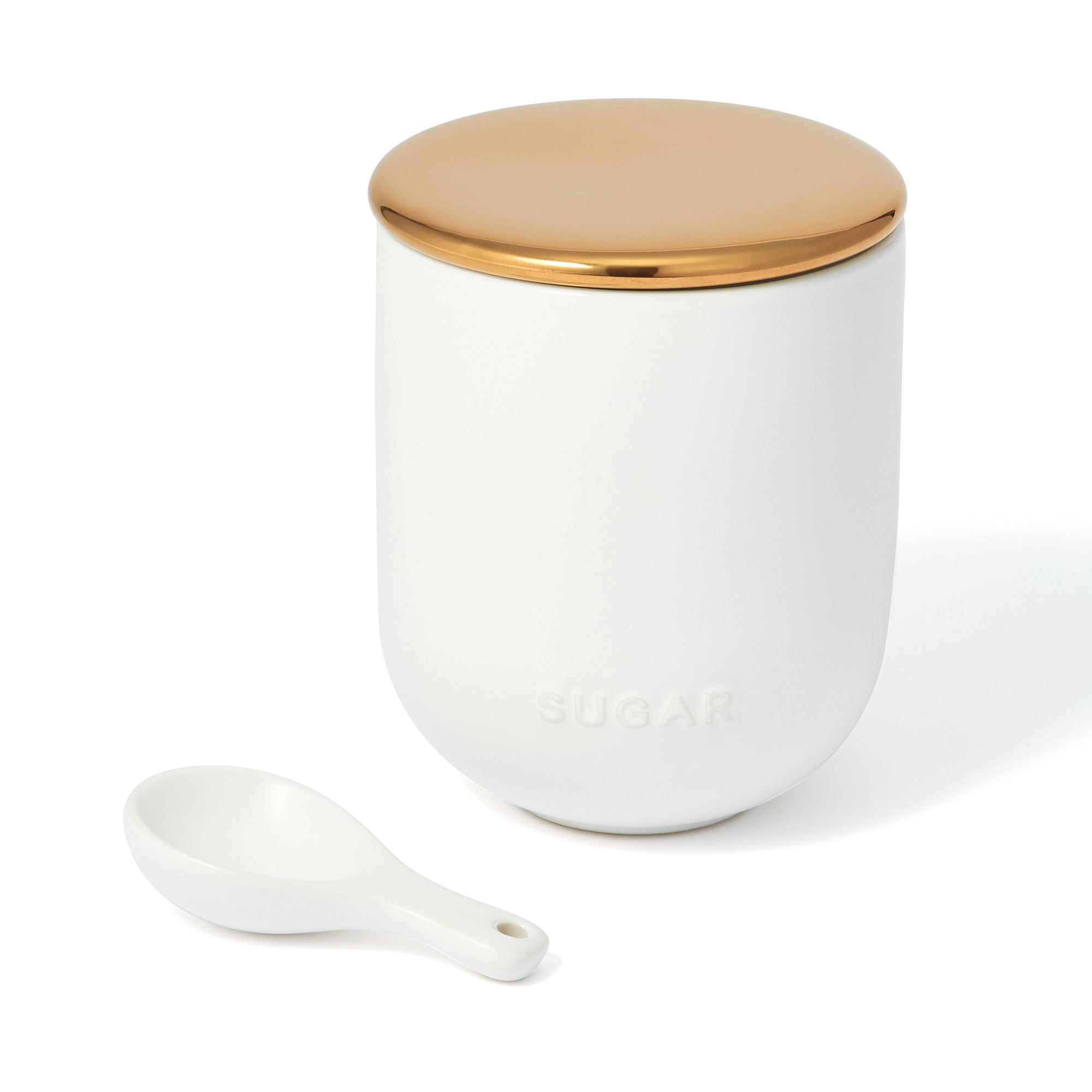 シンプルなデザインにコッパー色のフタのコントラストが素敵なキャニスターです。かわいい陶器の小さじが付いて便利です。
