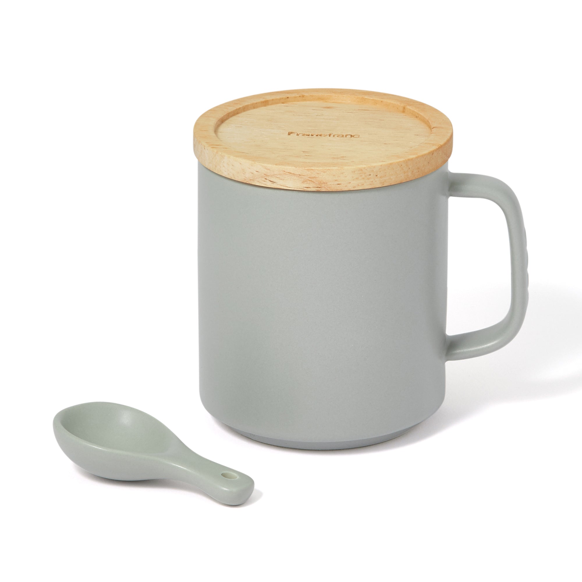 ウッドの蓋がナチュラルな印象のキャニスターです。重ねて置けるようにフタに溝が付いています。かわいい陶器の小さじが付いて便利です。