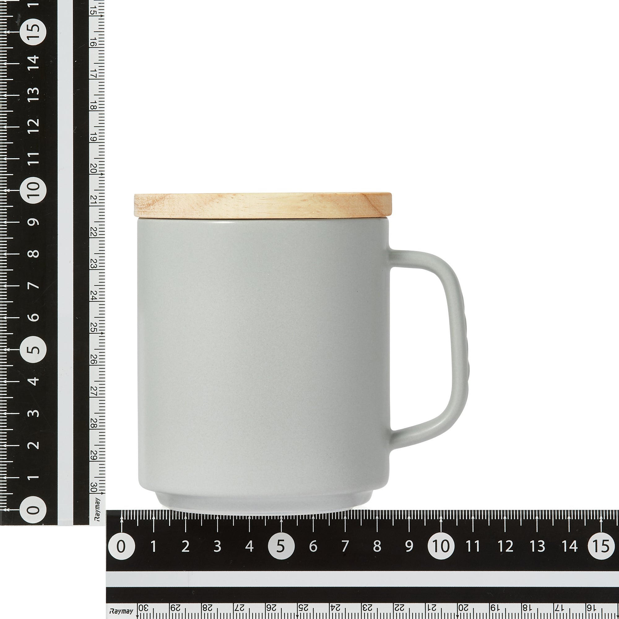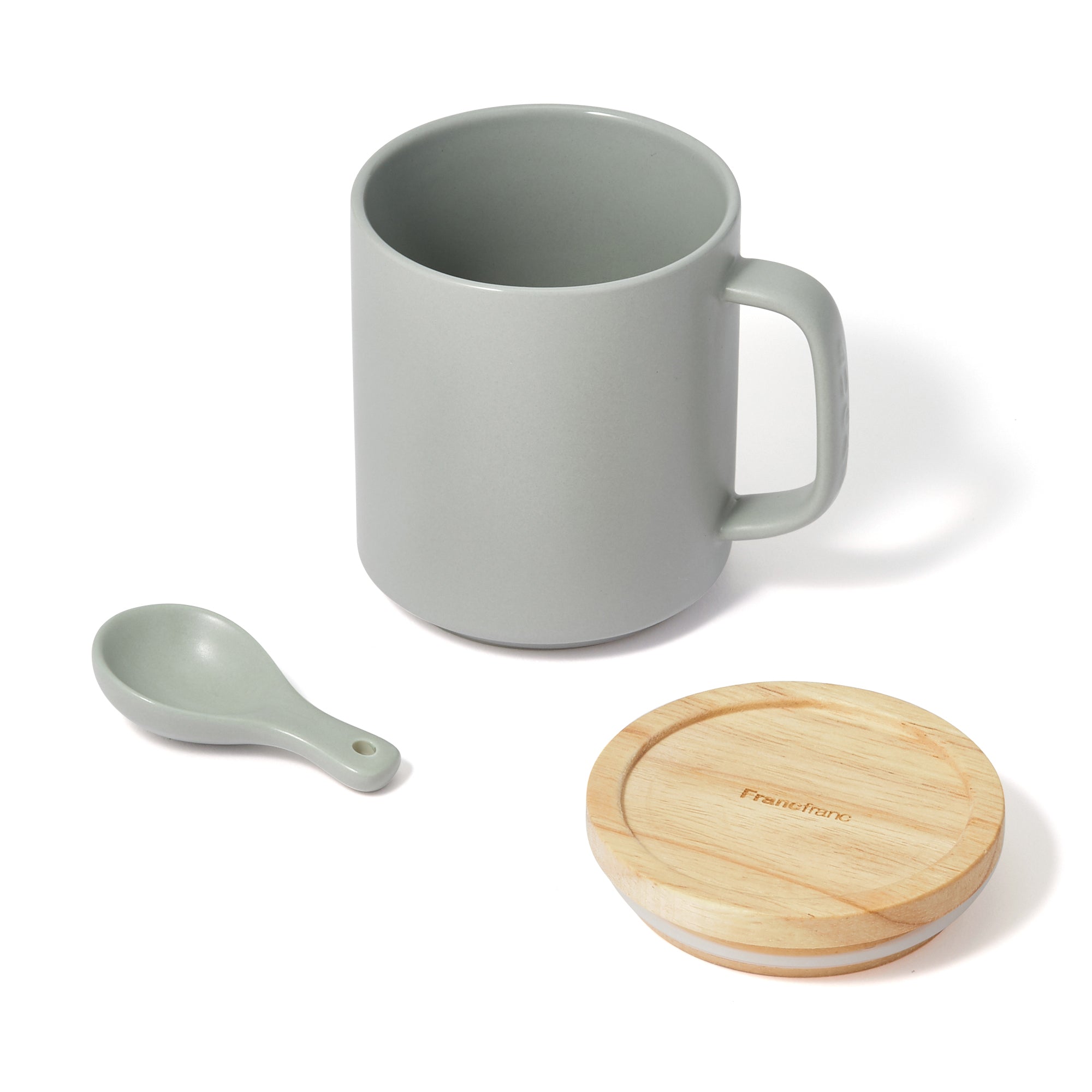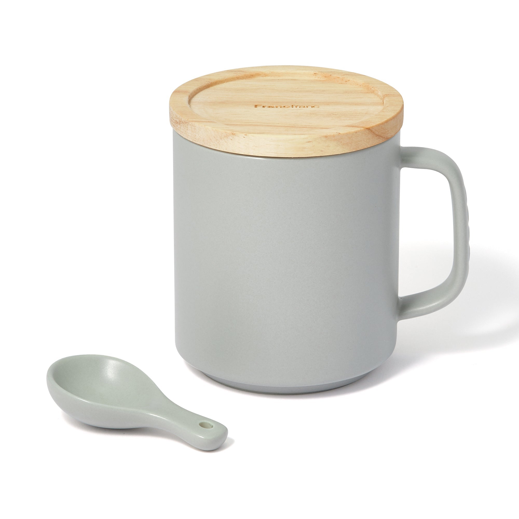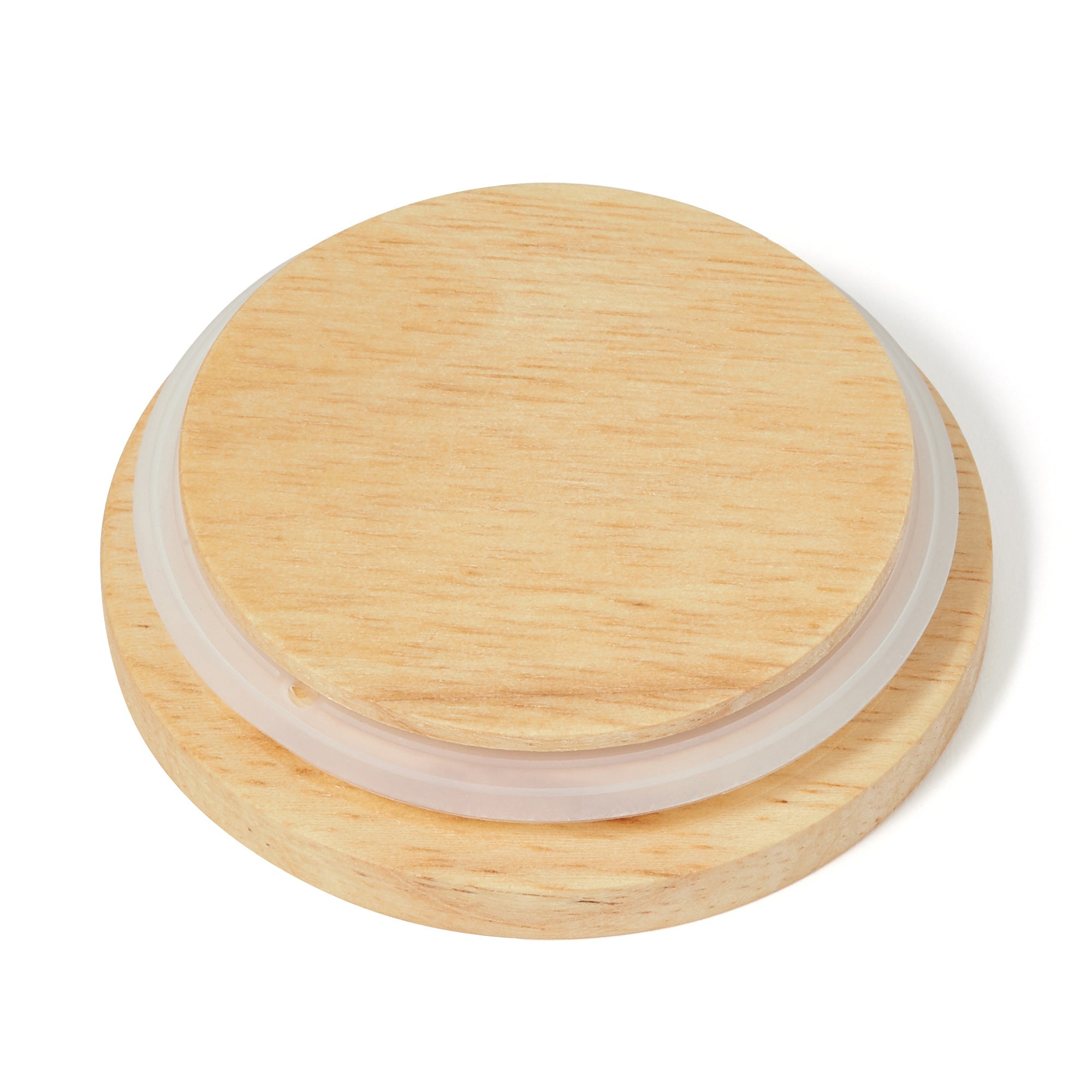 ウッドの蓋がナチュラルな印象のキャニスターです。重ねて置けるようにフタに溝が付いています。かわいい陶器の小さじが付いて便利です。