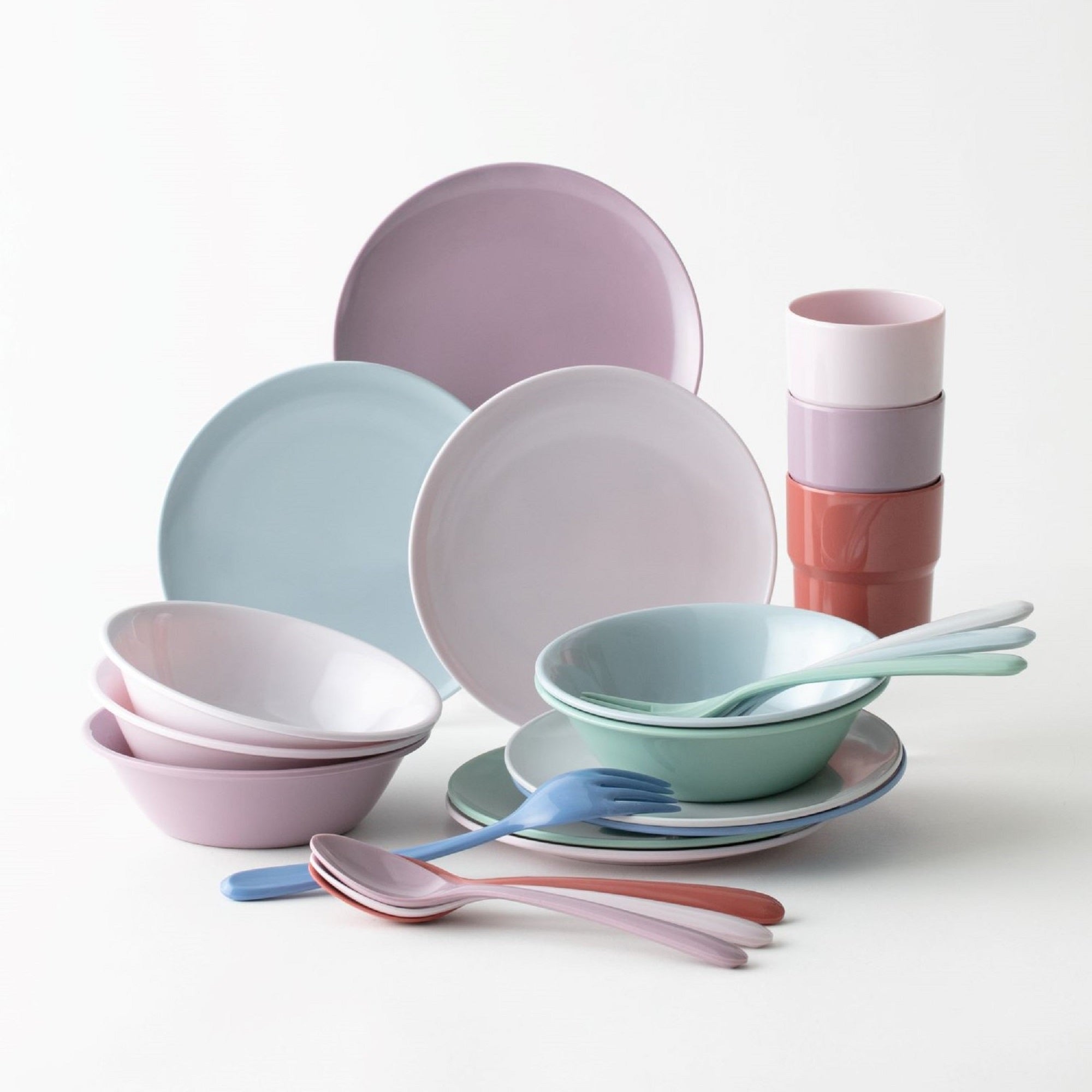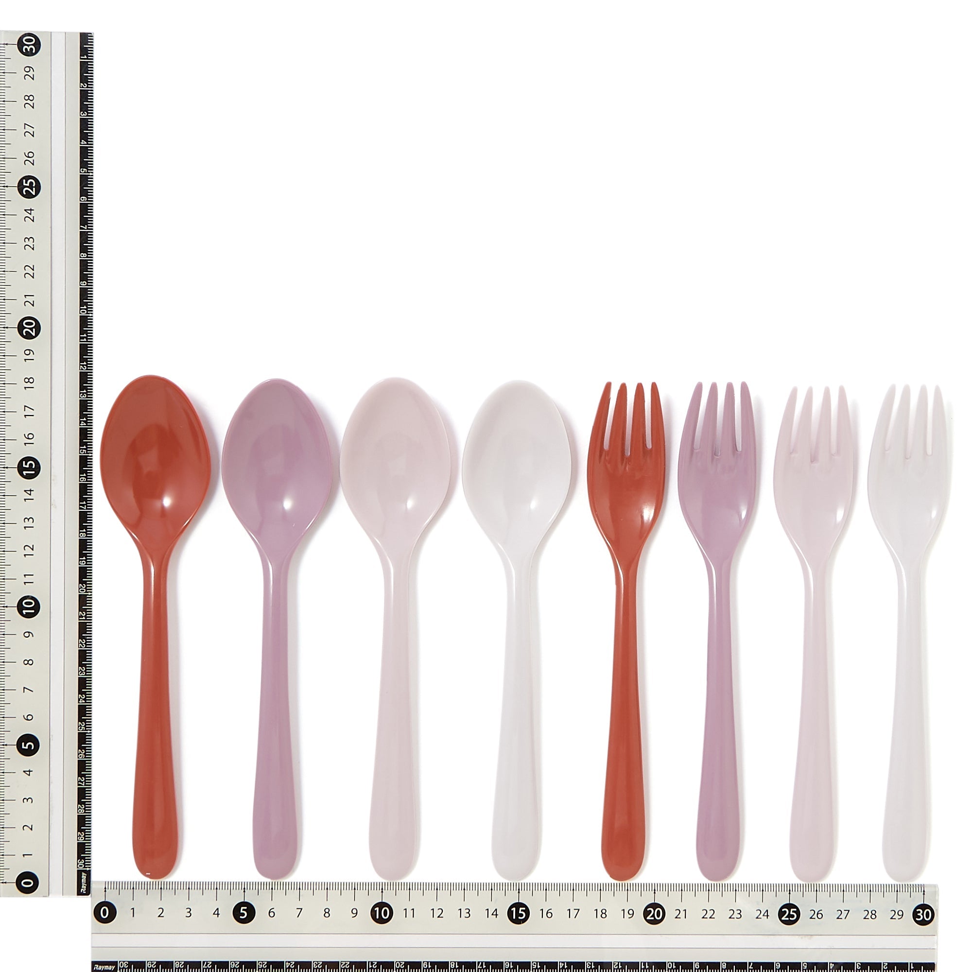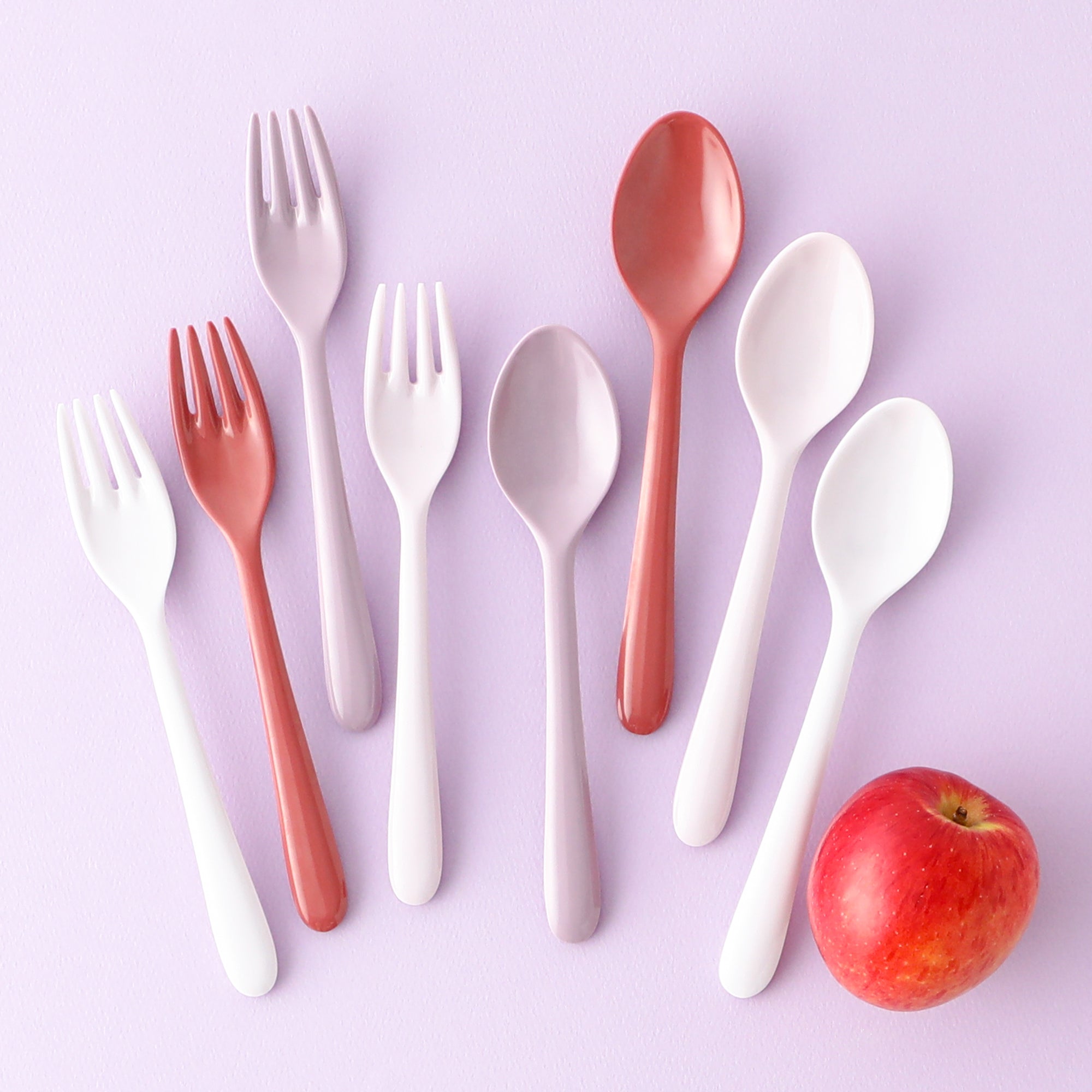 4色セットになったメラミン素材のカトラリーです。割れにくく軽いので運動会や外でのごはんなどの場面で活躍します。ご家族や友人と集まってのお食事では、色違いで使用できます。