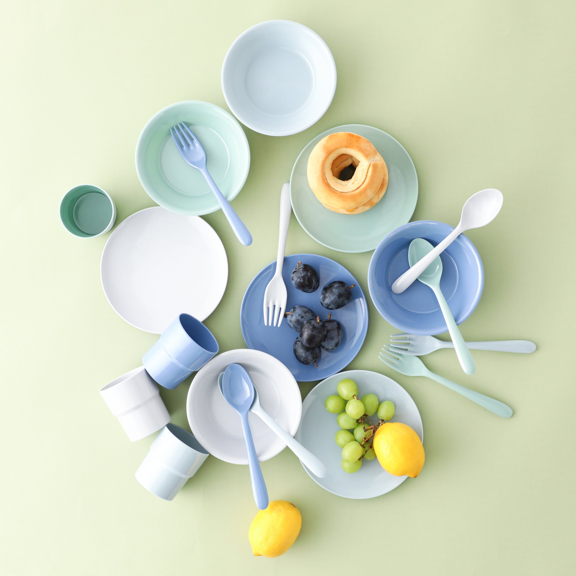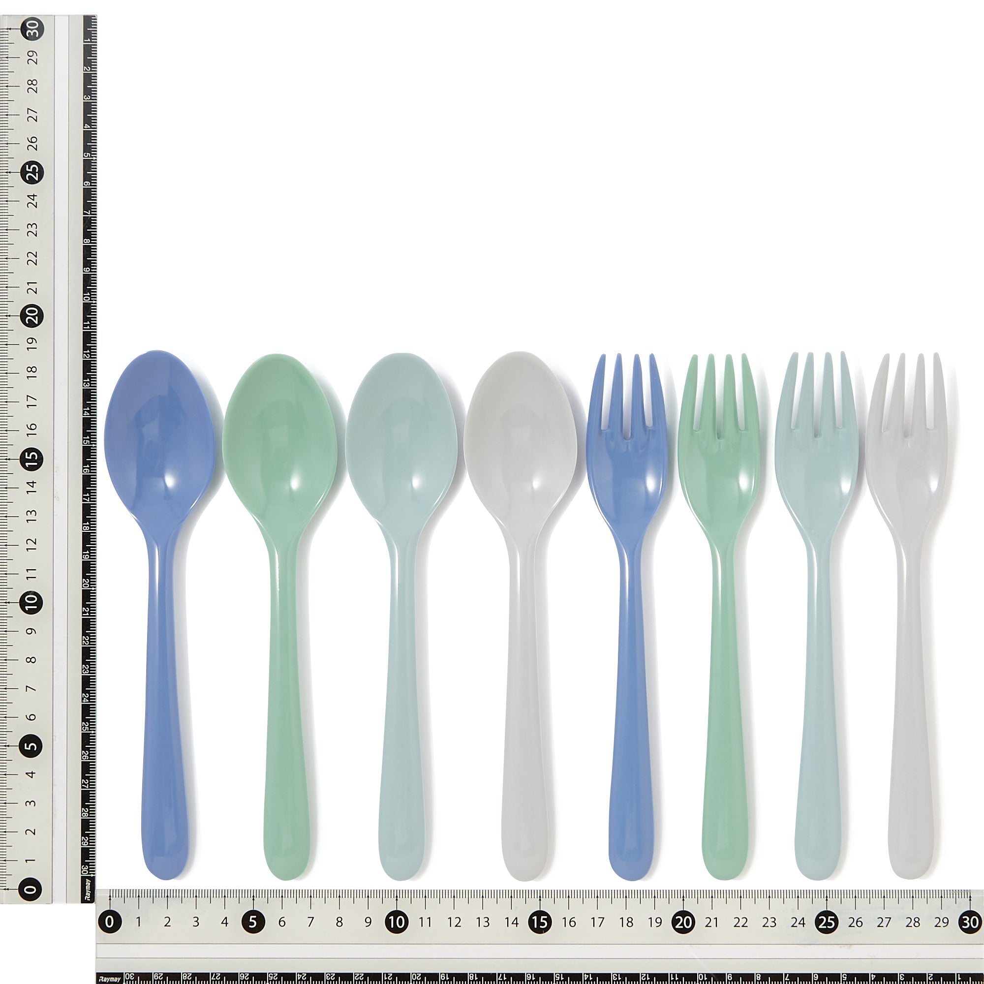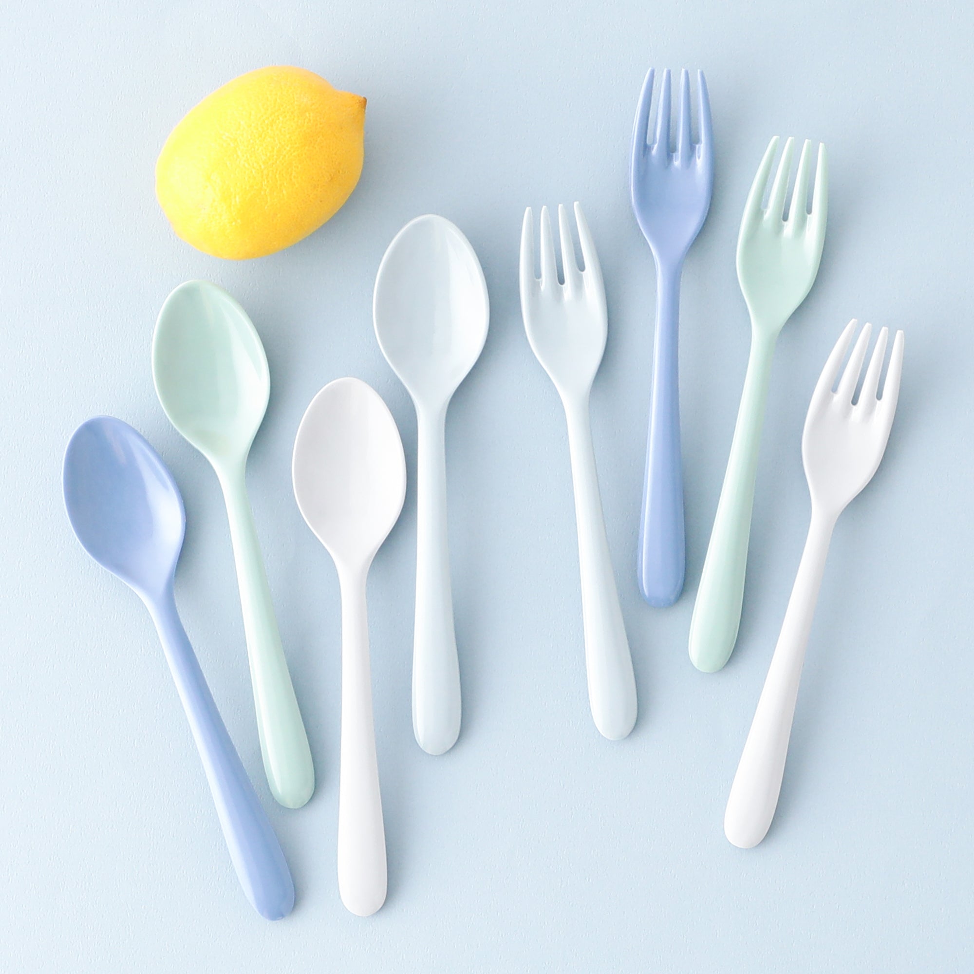 4色セットになったメラミン素材のカトラリーです。割れにくく軽いので運動会や外でのごはんなどの場面で活躍します。ご家族や友人と集まってのお食事では、色違いで使用できます。
