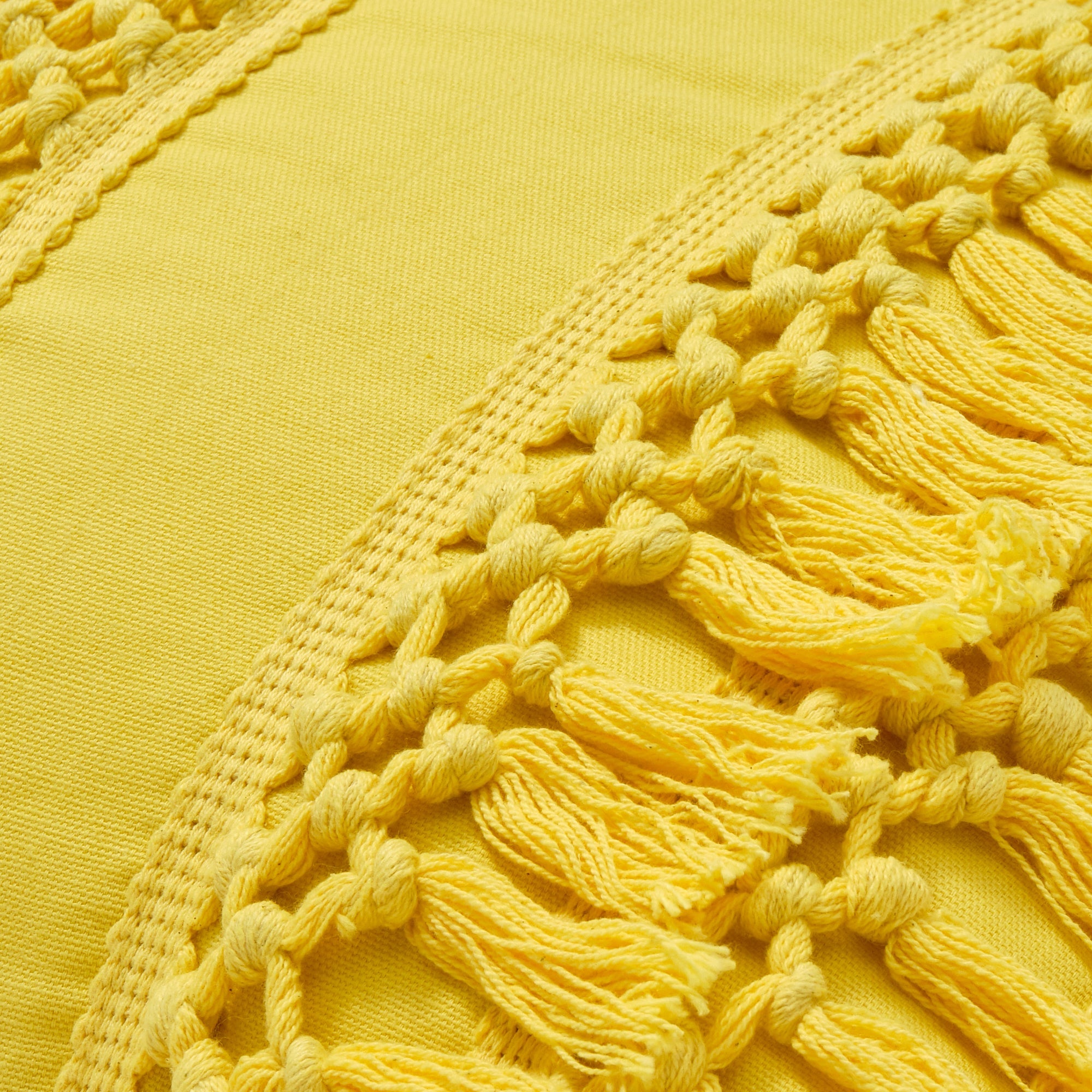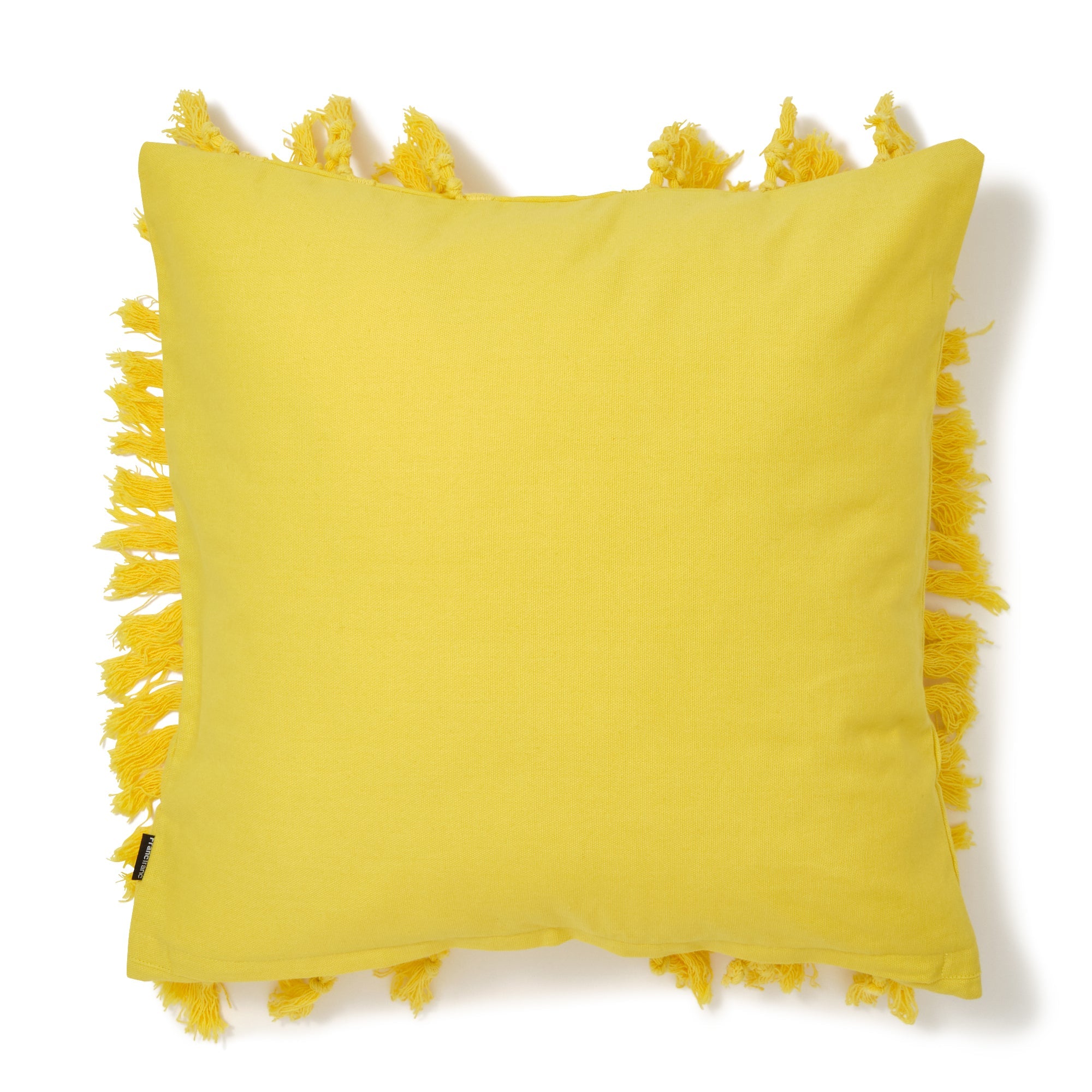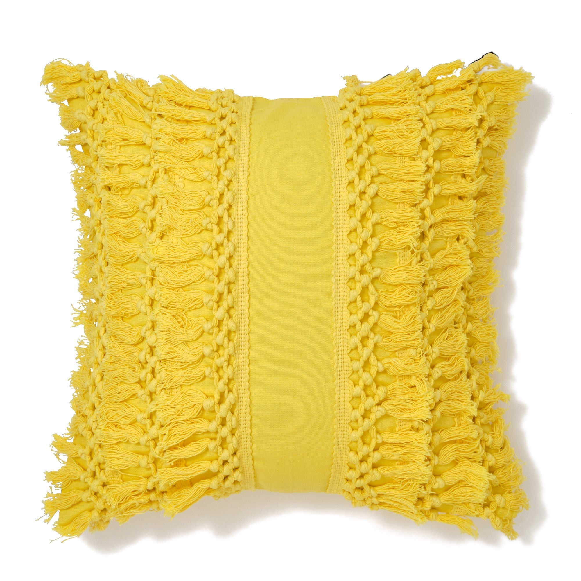 レース編みのリボンのように見えるかわいらしいクッションカバーです。コットン100%なので手触りもやわらかく、明るいイエローの色合いは穏やかな明るさをプラスします。
