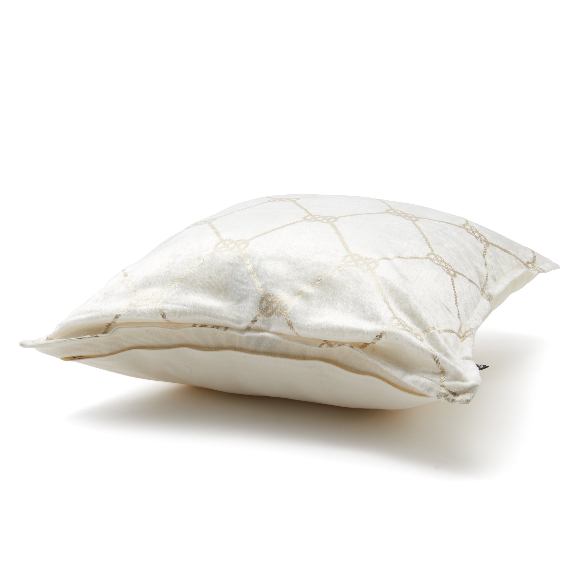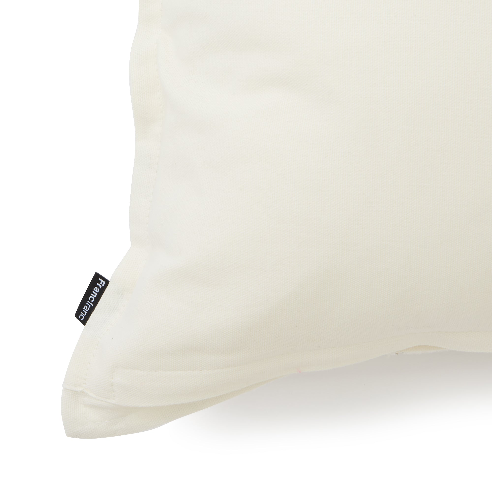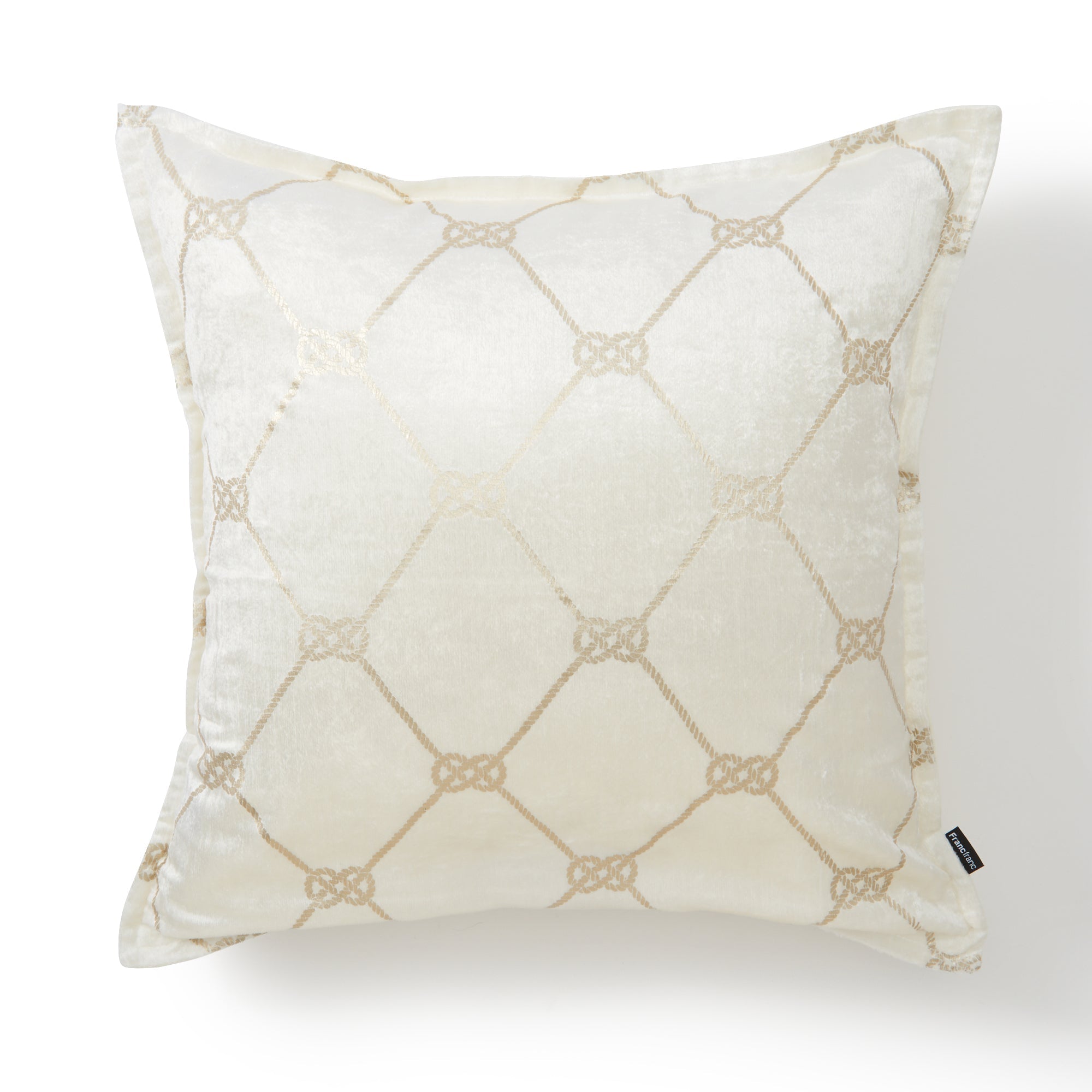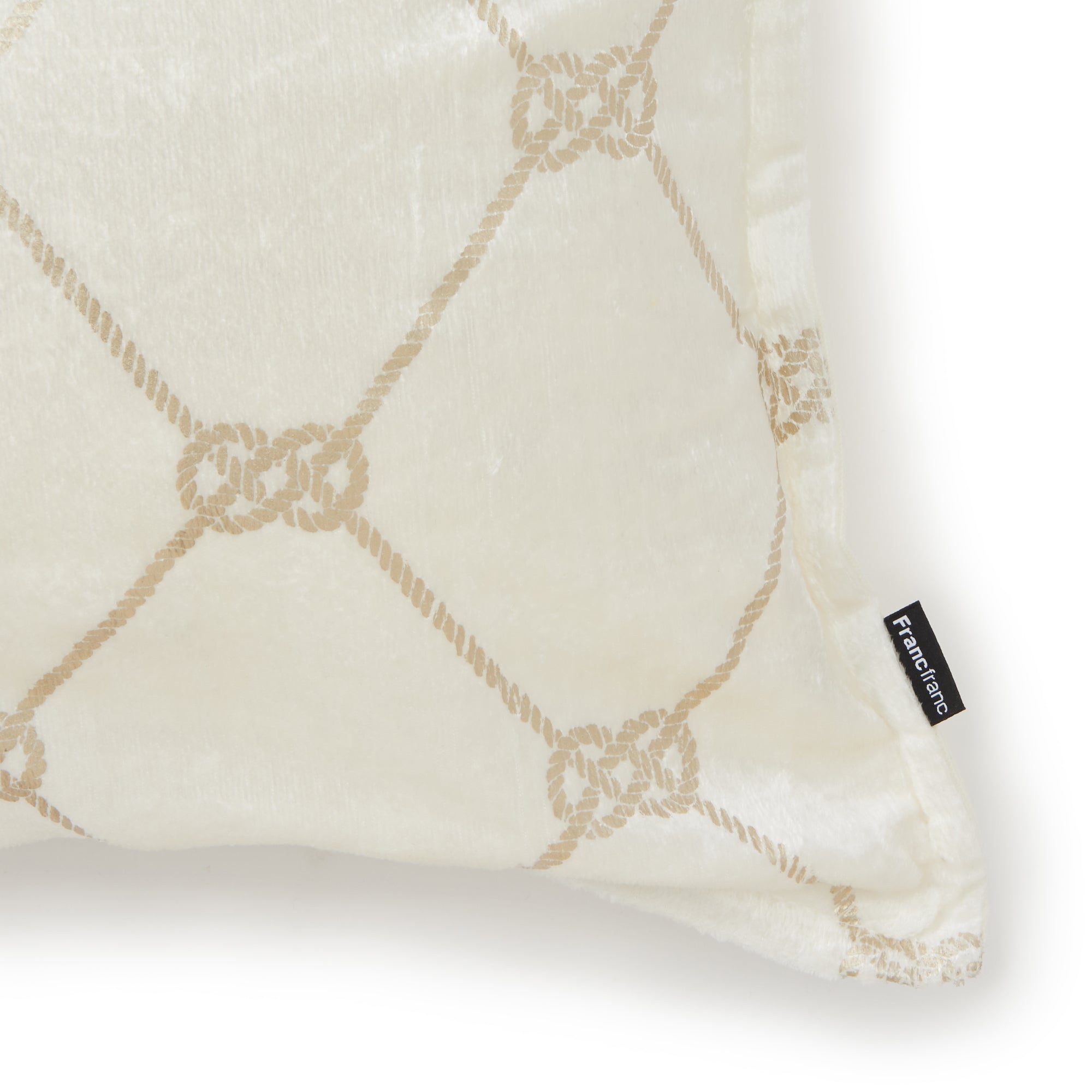 ゴールドでバックルを描いたトレンド感たっぷりのクッションカバーです。ふちに幅があることで艶のあるホワイトの生地がふっくらとした存在感でお部屋を引き立ててくれます。合わせる色によって、大人っぽくもフェミニンよりにもなります。