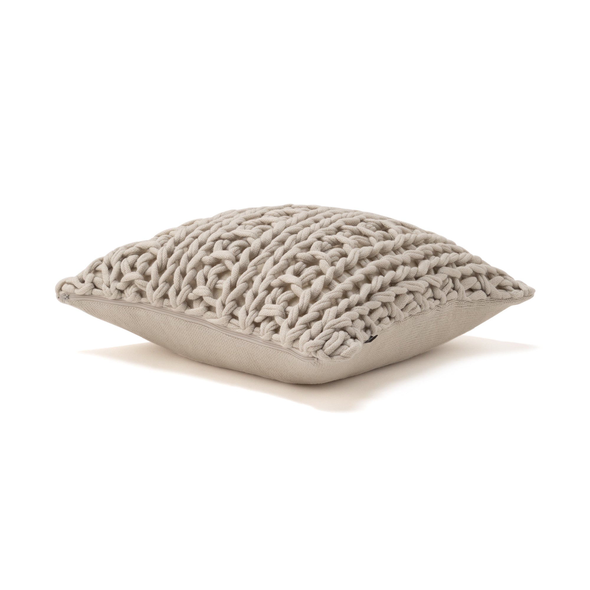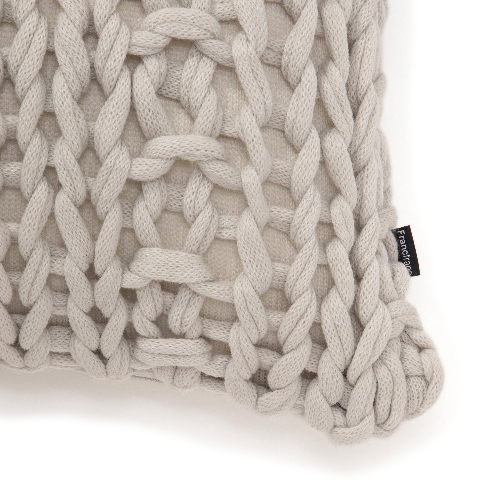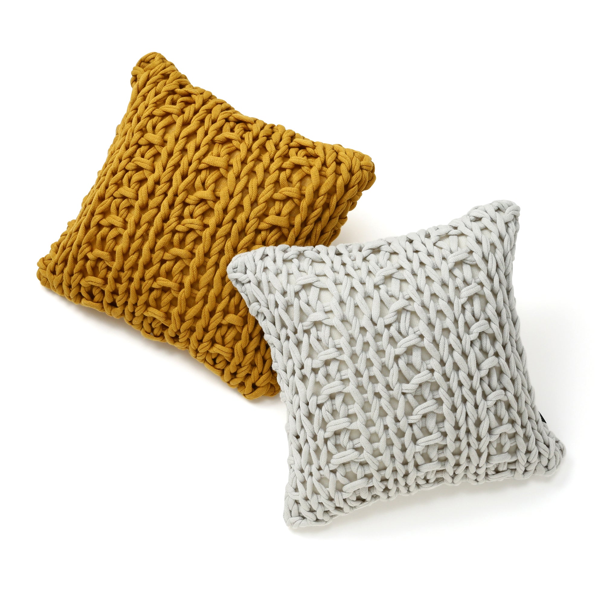 太い毛糸でざっくりと編み上げたようなシンプルなデザインのクッションカバーです。大きな網目は存在感があり温かみのある印象です。淡いグレーは様々な色と相性が良く、さりげないアクセントになります。