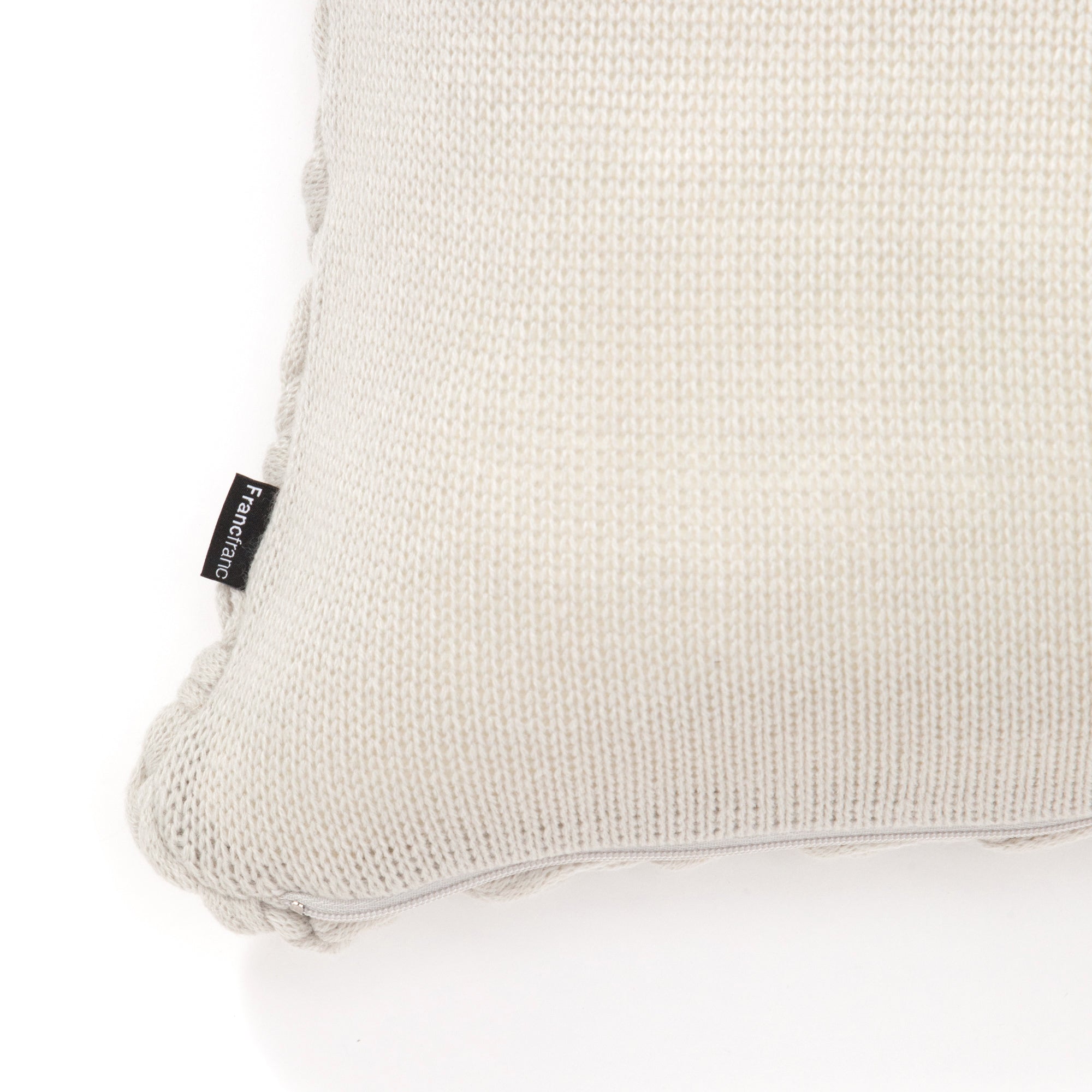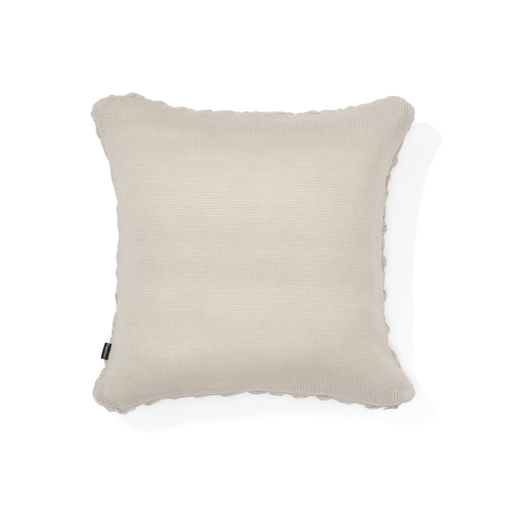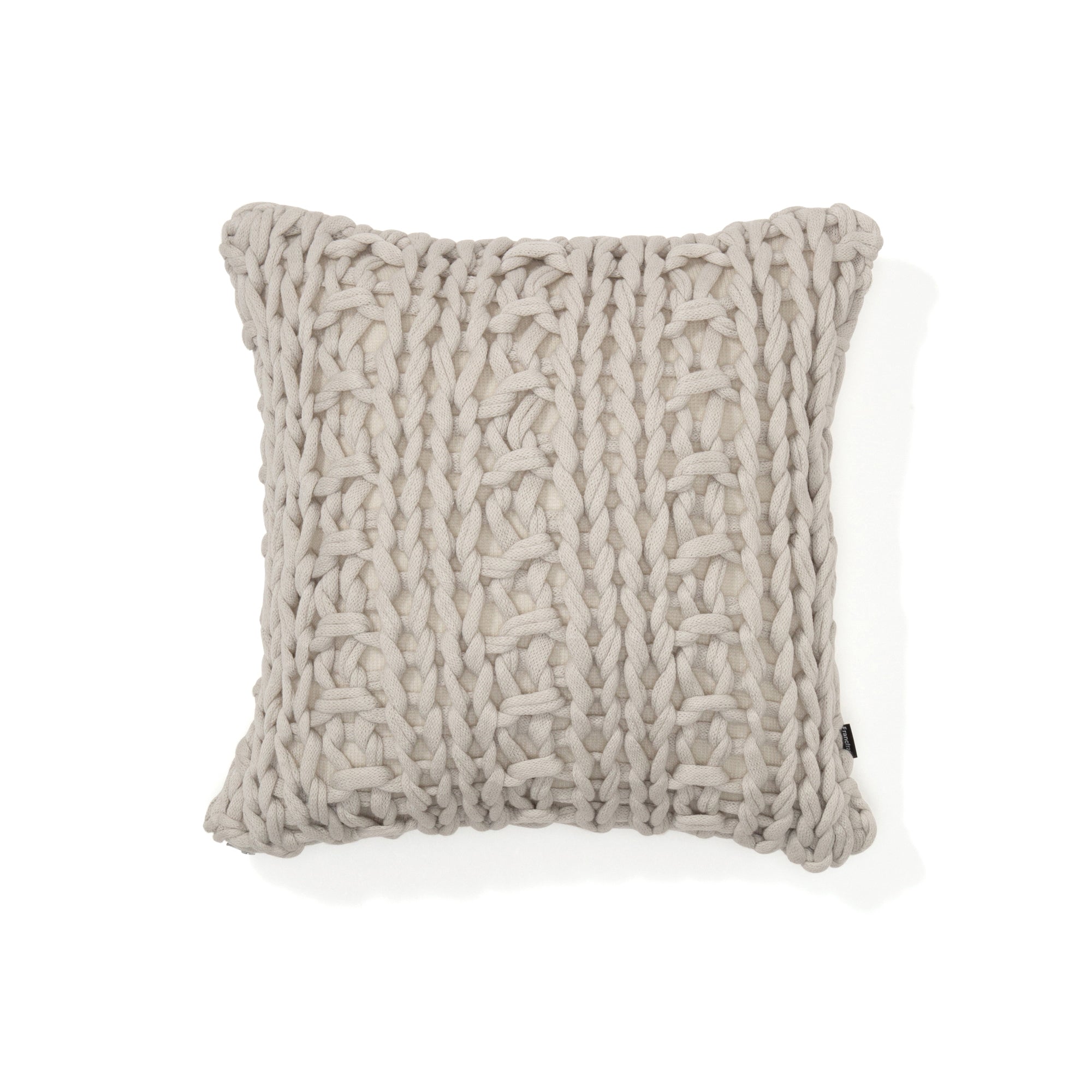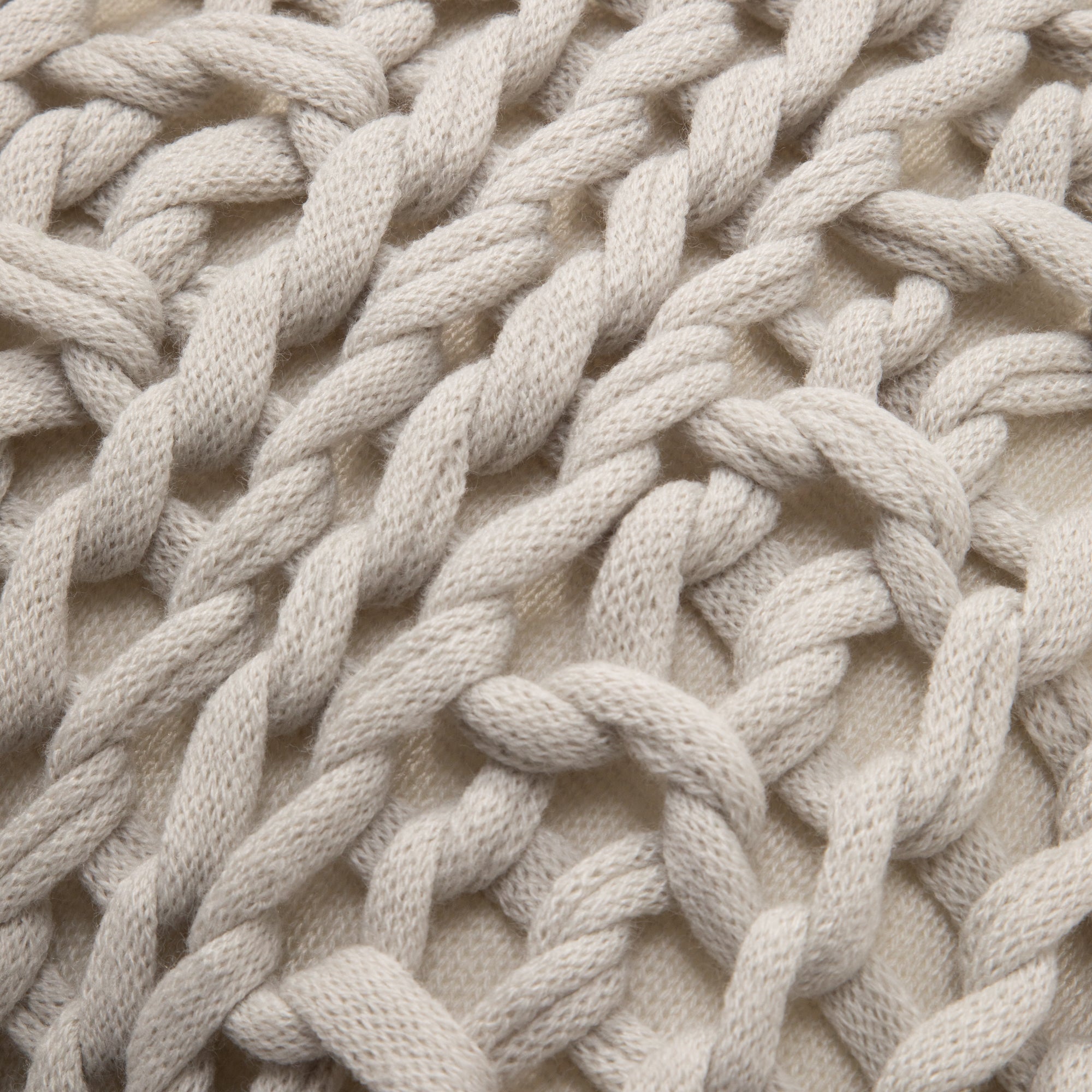 太い毛糸でざっくりと編み上げたようなシンプルなデザインのクッションカバーです。大きな網目は存在感があり温かみのある印象です。淡いグレーは様々な色と相性が良く、さりげないアクセントになります。