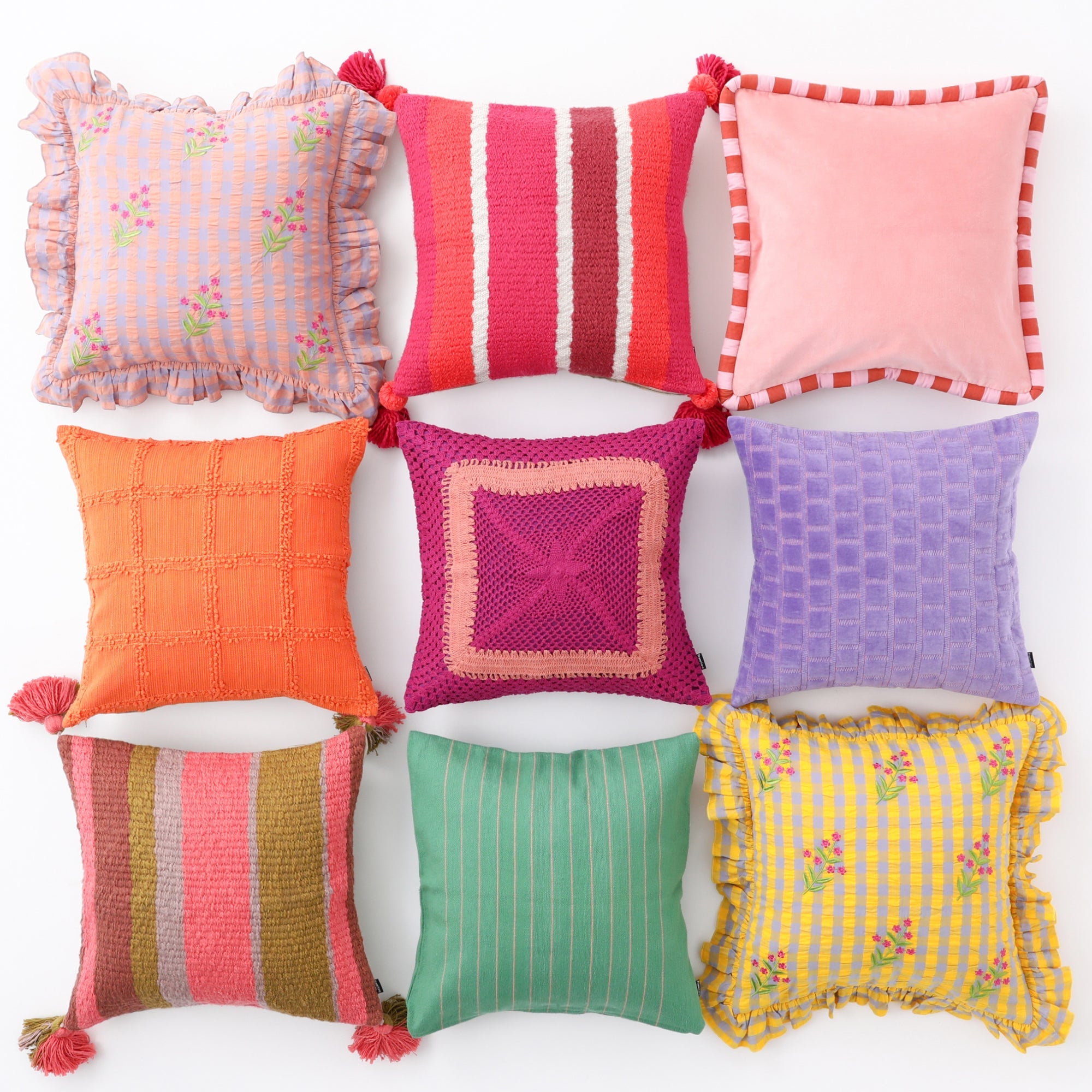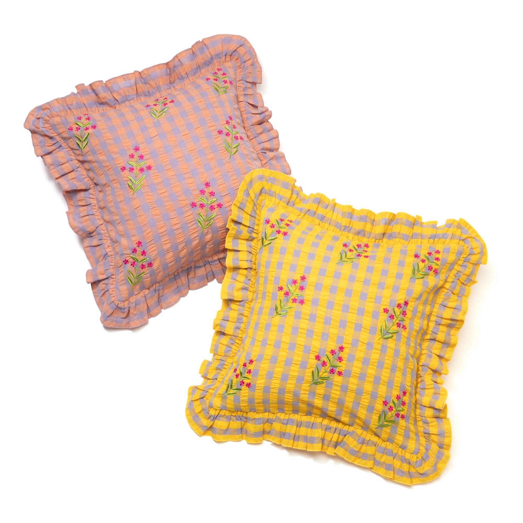 ギンガムチェック柄のシアサッカー生地にお花の刺繍をあしらったトレンド感たっぷりのクッションカバーです。贅沢なフリルがデザインを引き立て、キュートさと爽やかさがバランスよく入り混じったデザインです。