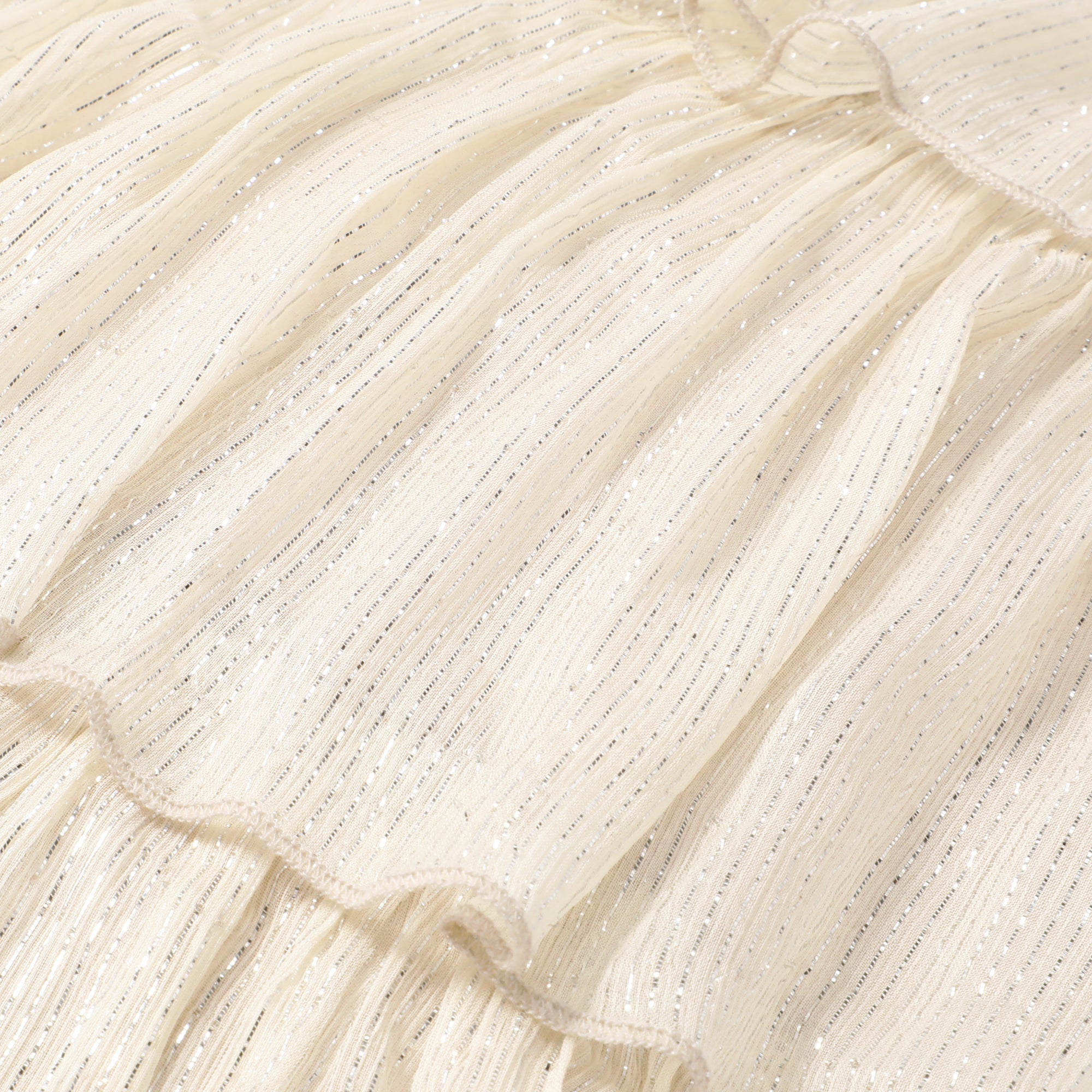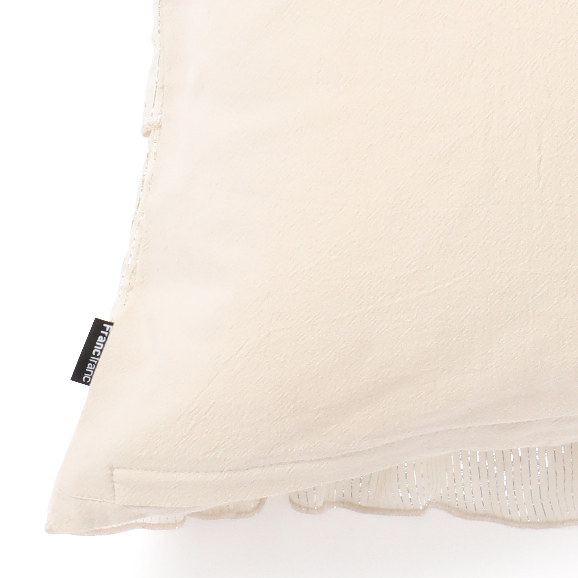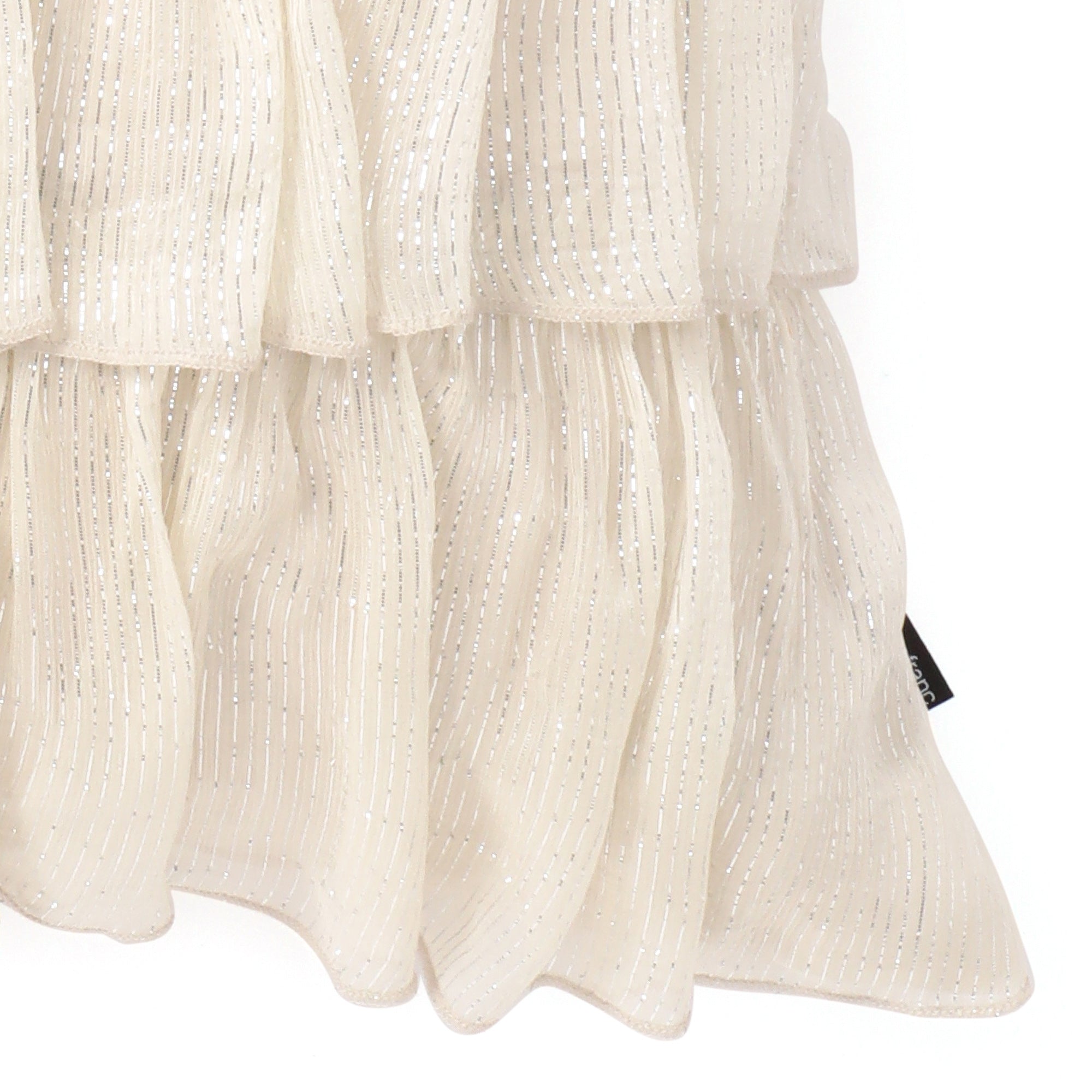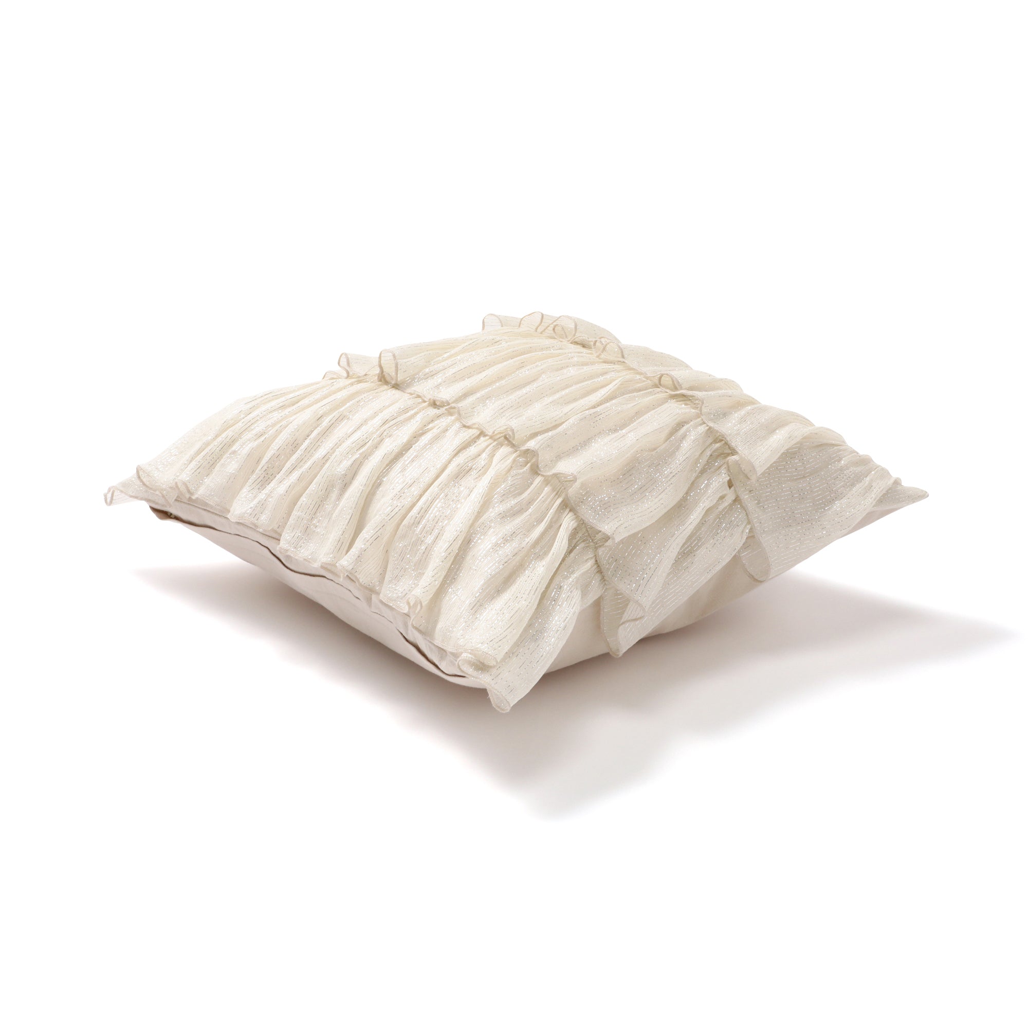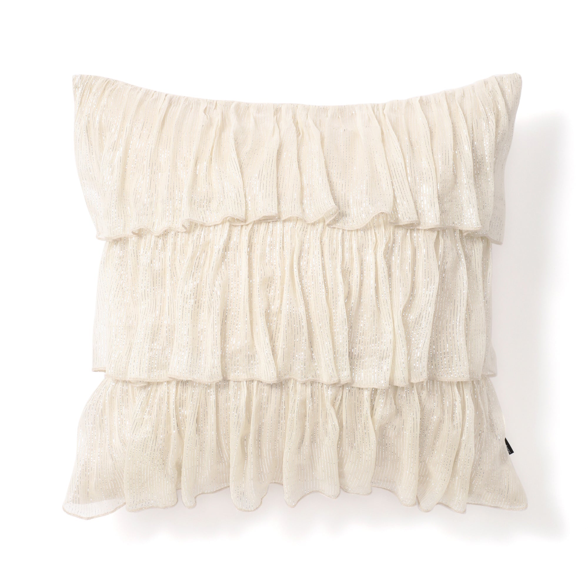 透明感のある軽やかなシフォン生地にメタリック糸を織り交ぜ、たっぷりフリルを施したクッションカバーです。長めに取った3段フリルの立体感がメタリック糸を引き立て、上品で華やかな輝きを放ちます。