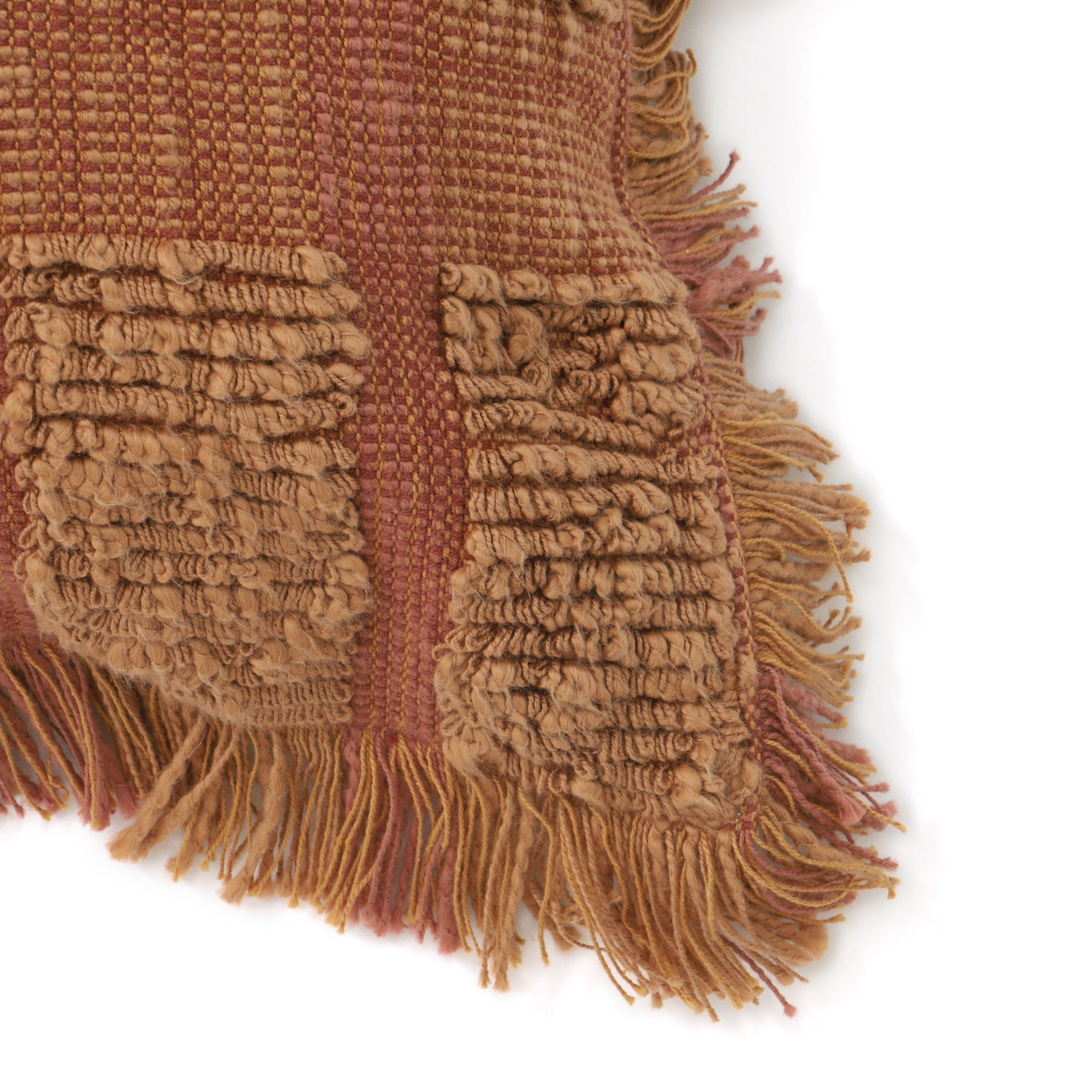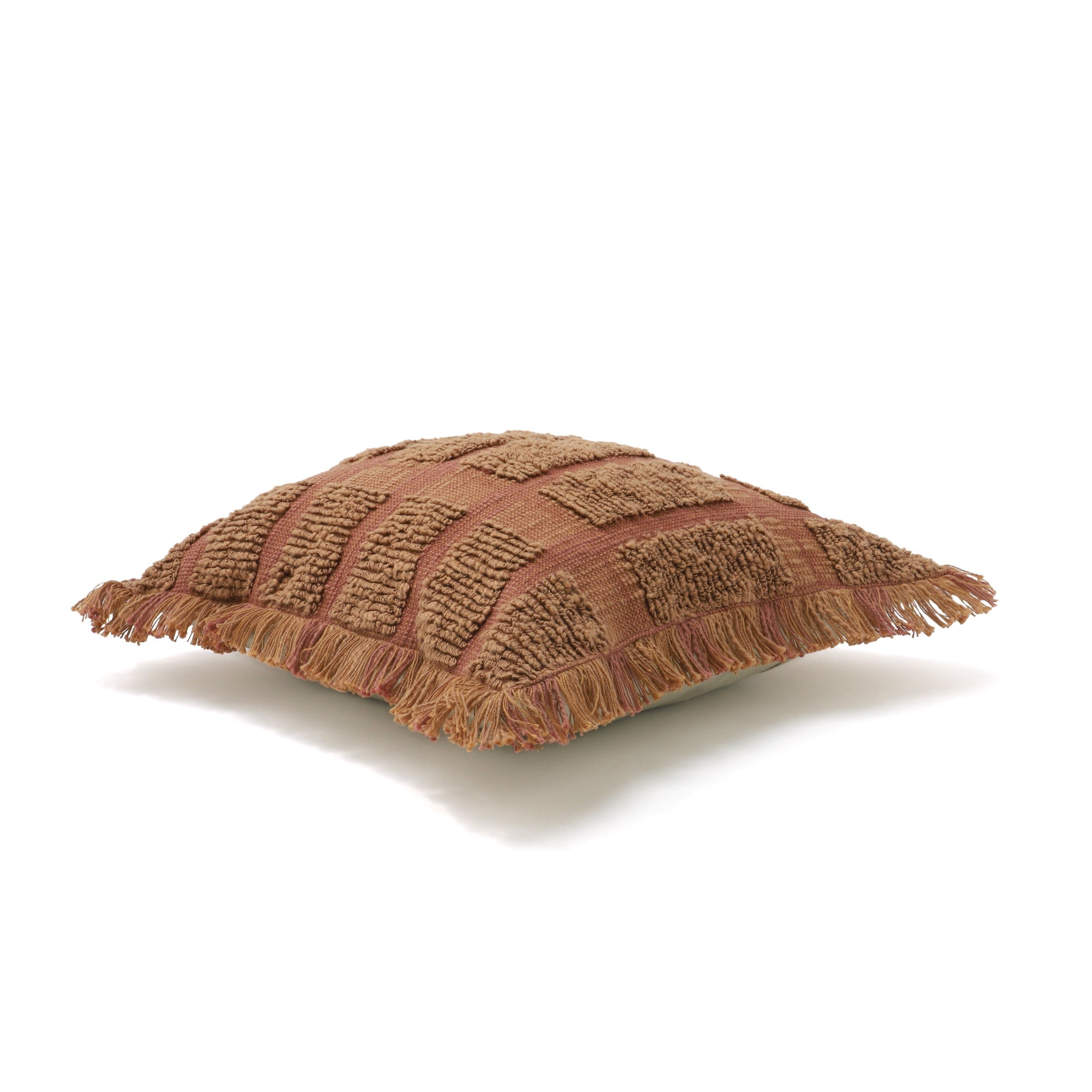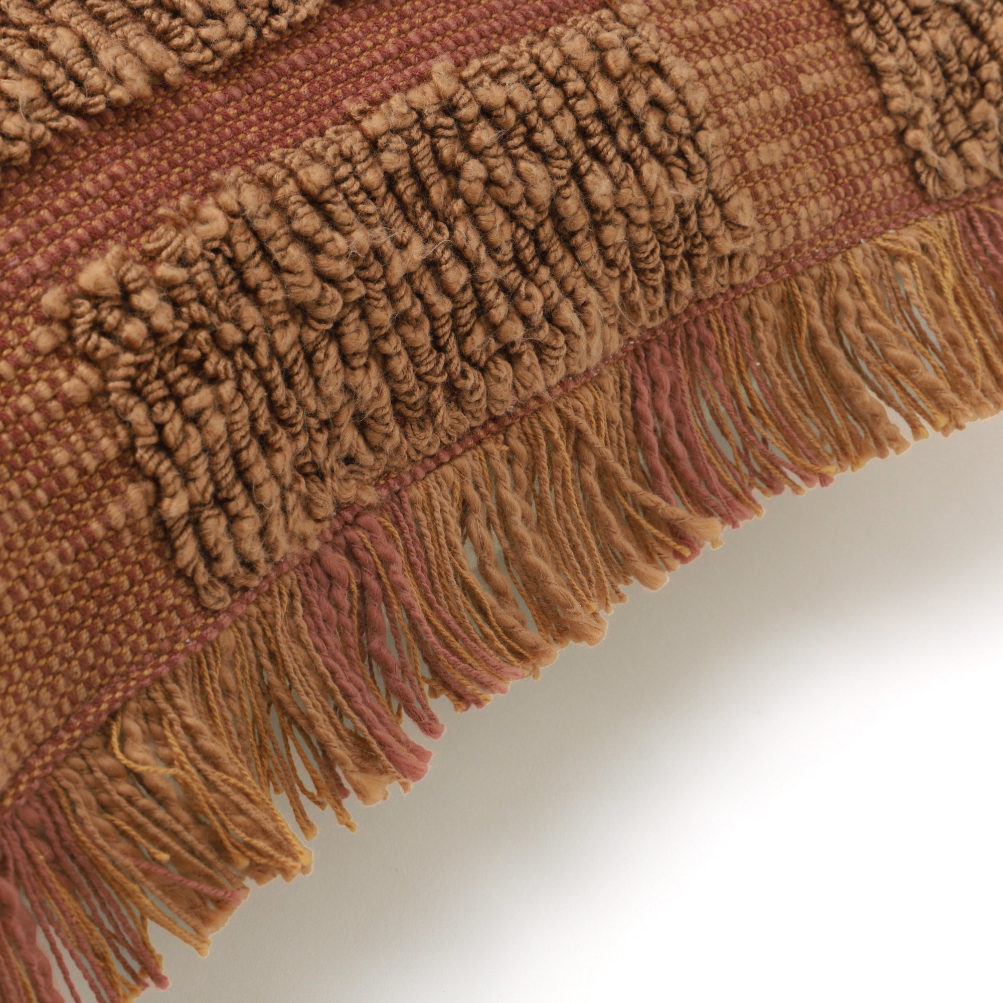 スラブ糸でスクエア柄をデザインした凹凸感のあるクッションカバーです。周囲にあしらったフリンジが程よい存在感を放ちます。