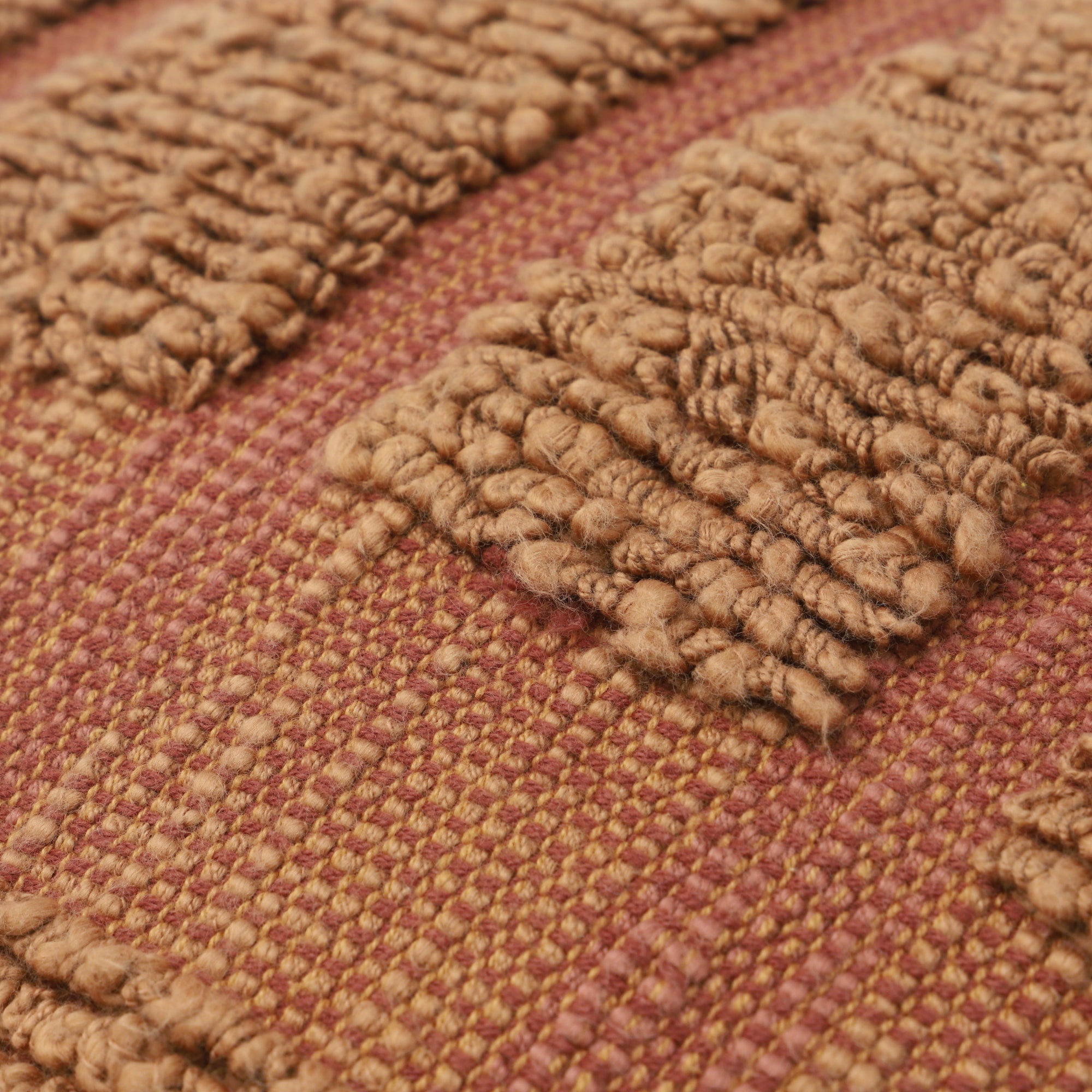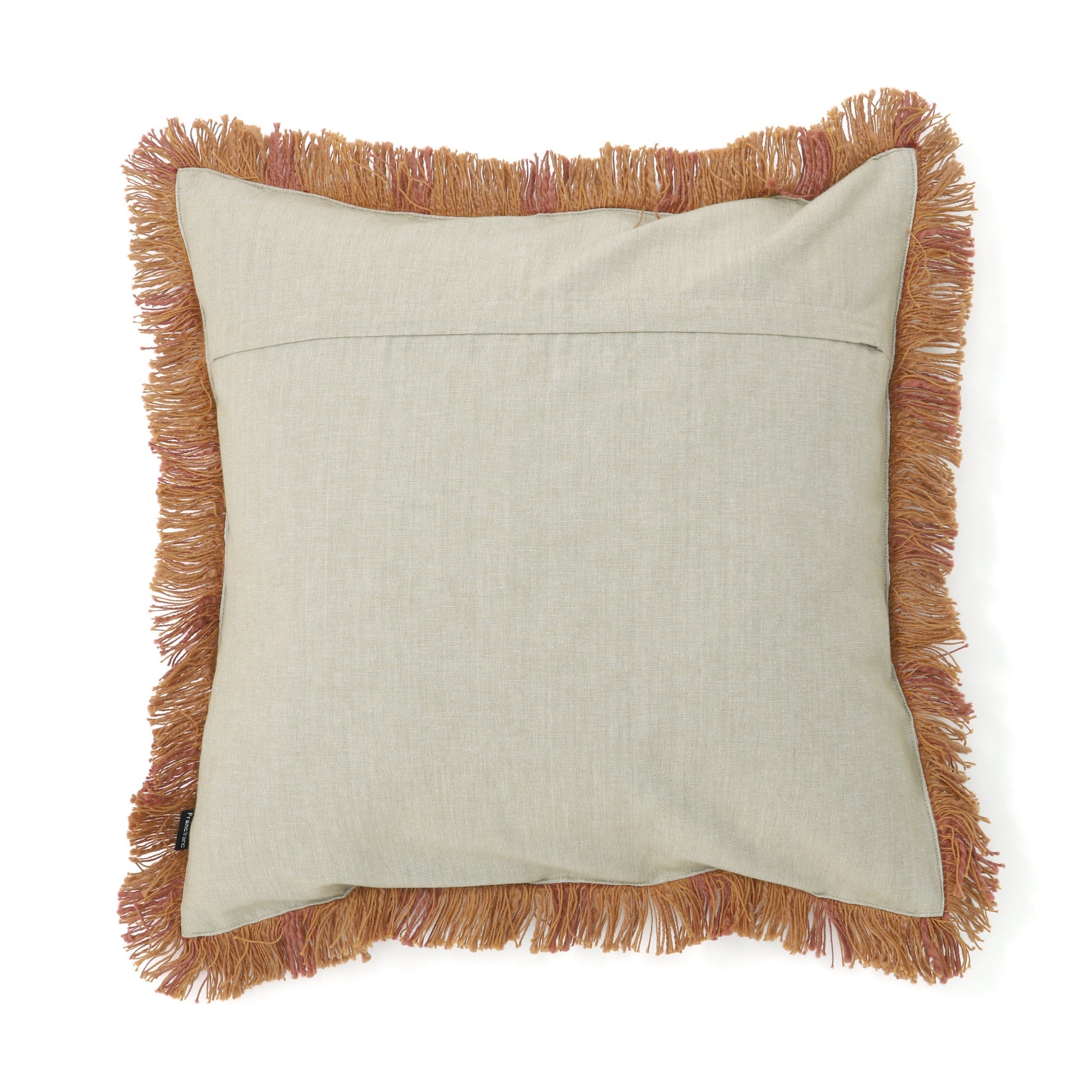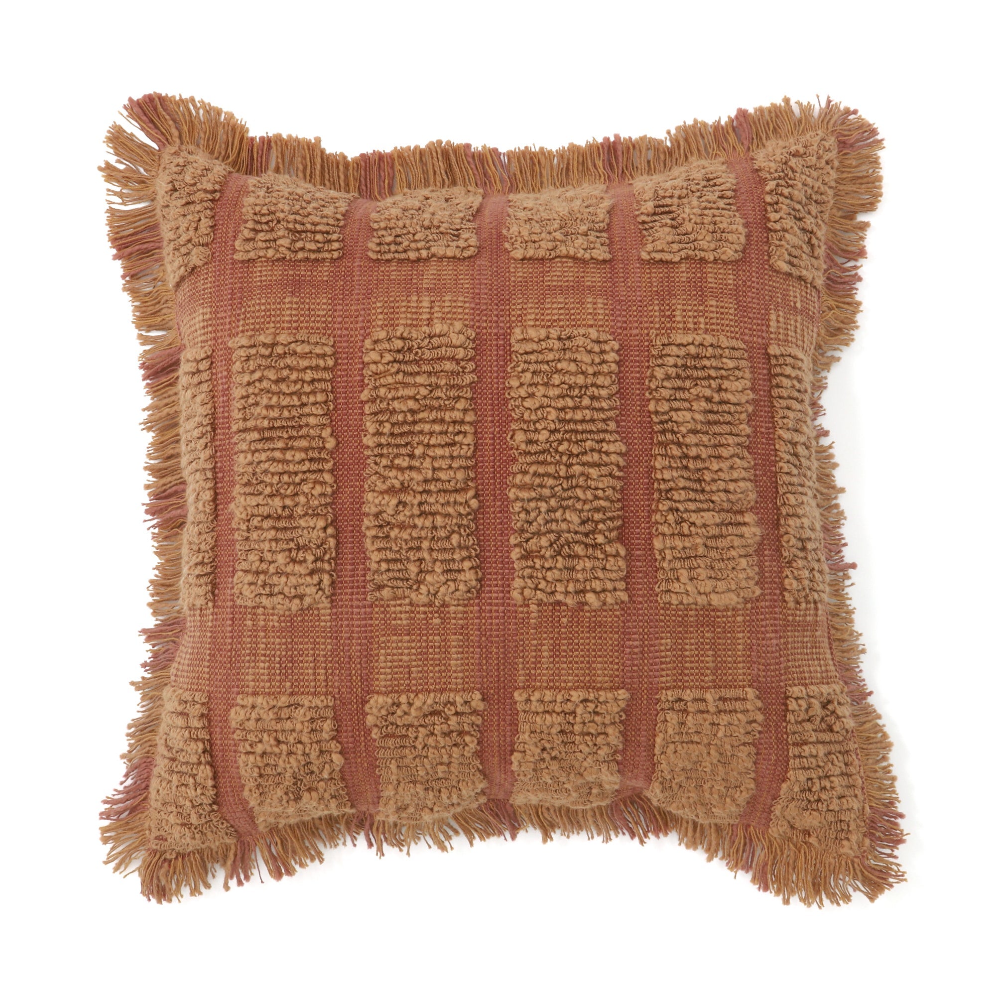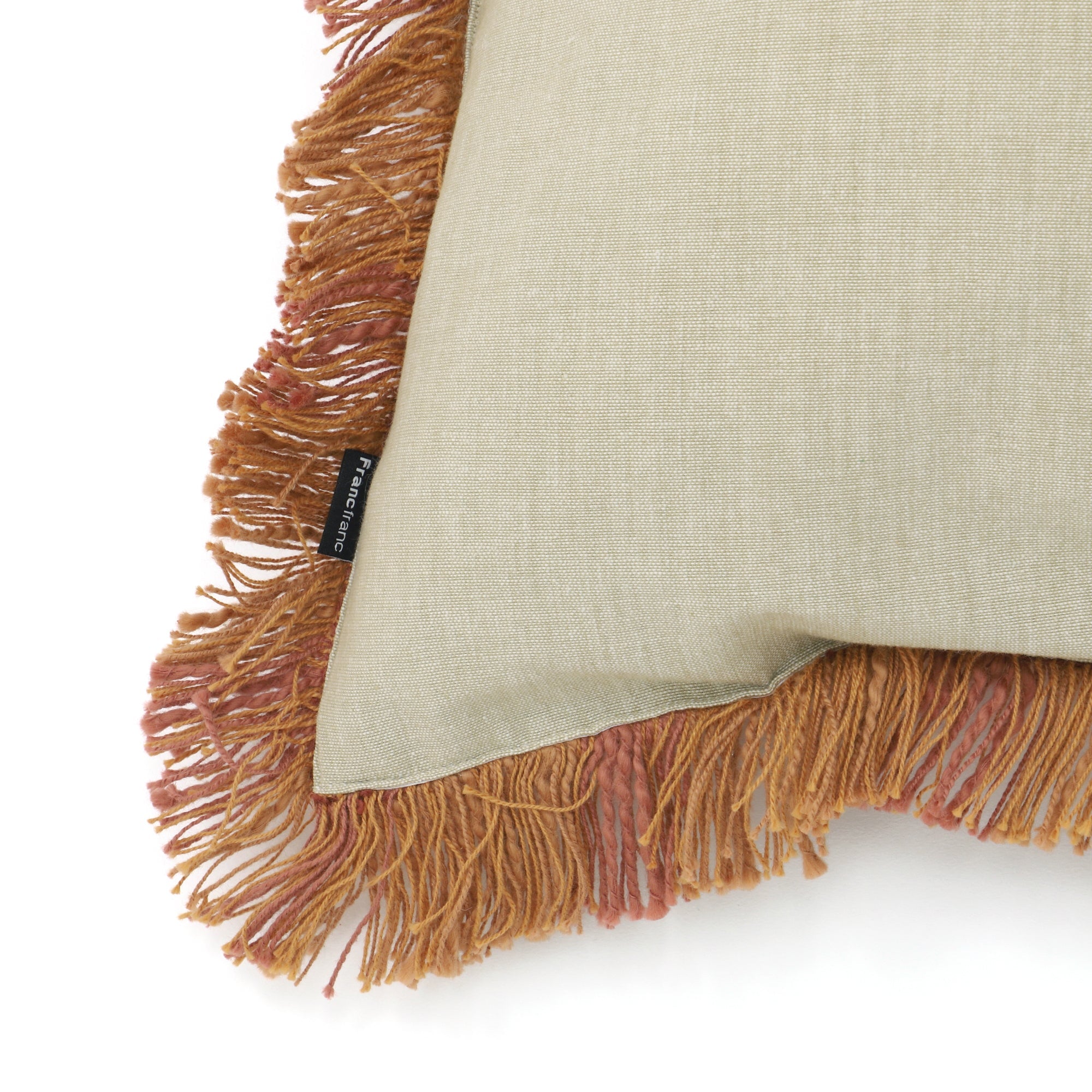 スラブ糸でスクエア柄をデザインした凹凸感のあるクッションカバーです。周囲にあしらったフリンジが程よい存在感を放ちます。