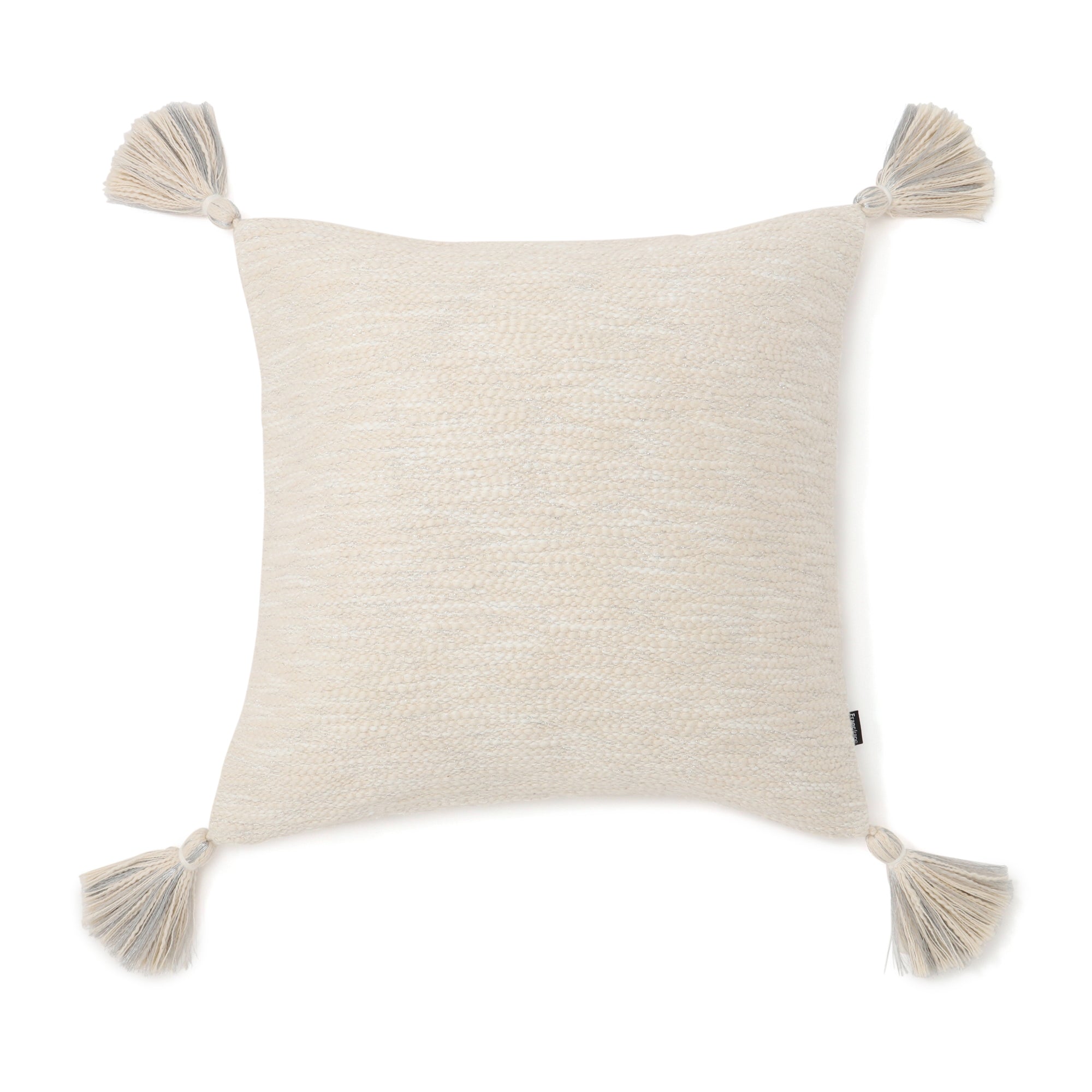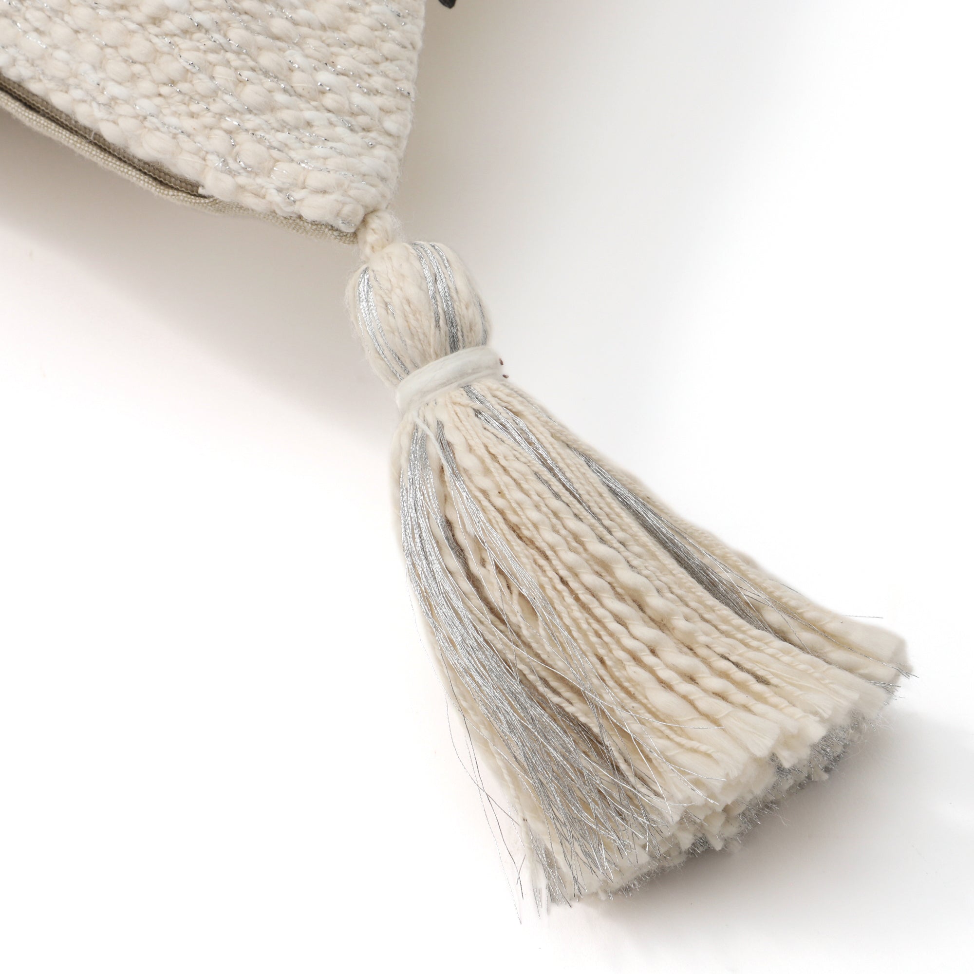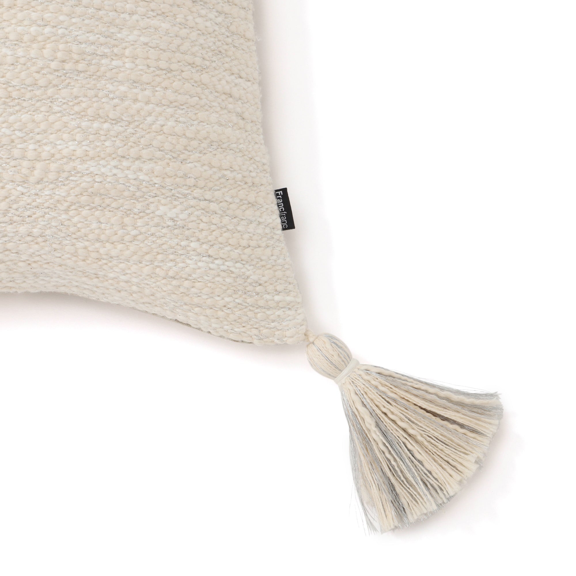 スラブ糸とメタリック糸を使用して織り上げたテクスチャー感のあるクッションカバーです。メタリック糸を使用した大ぶりのタッセルがデザインのポイントとなっています。
